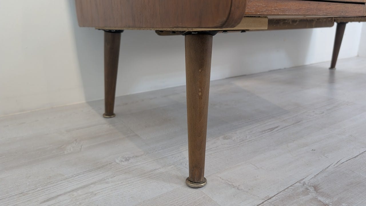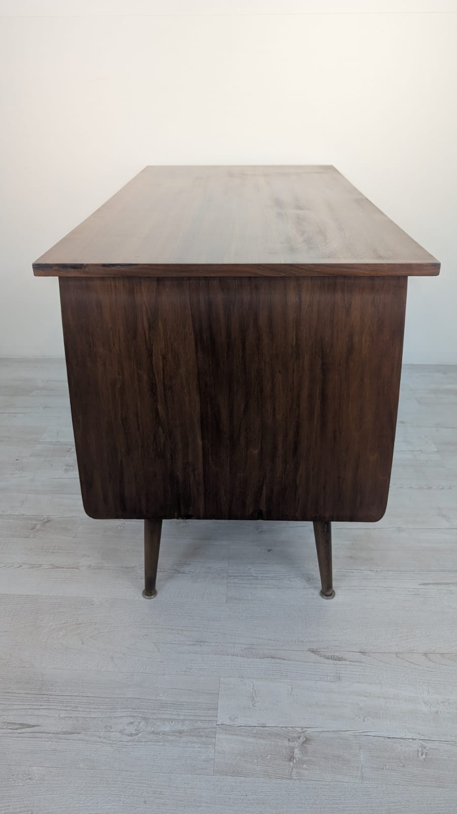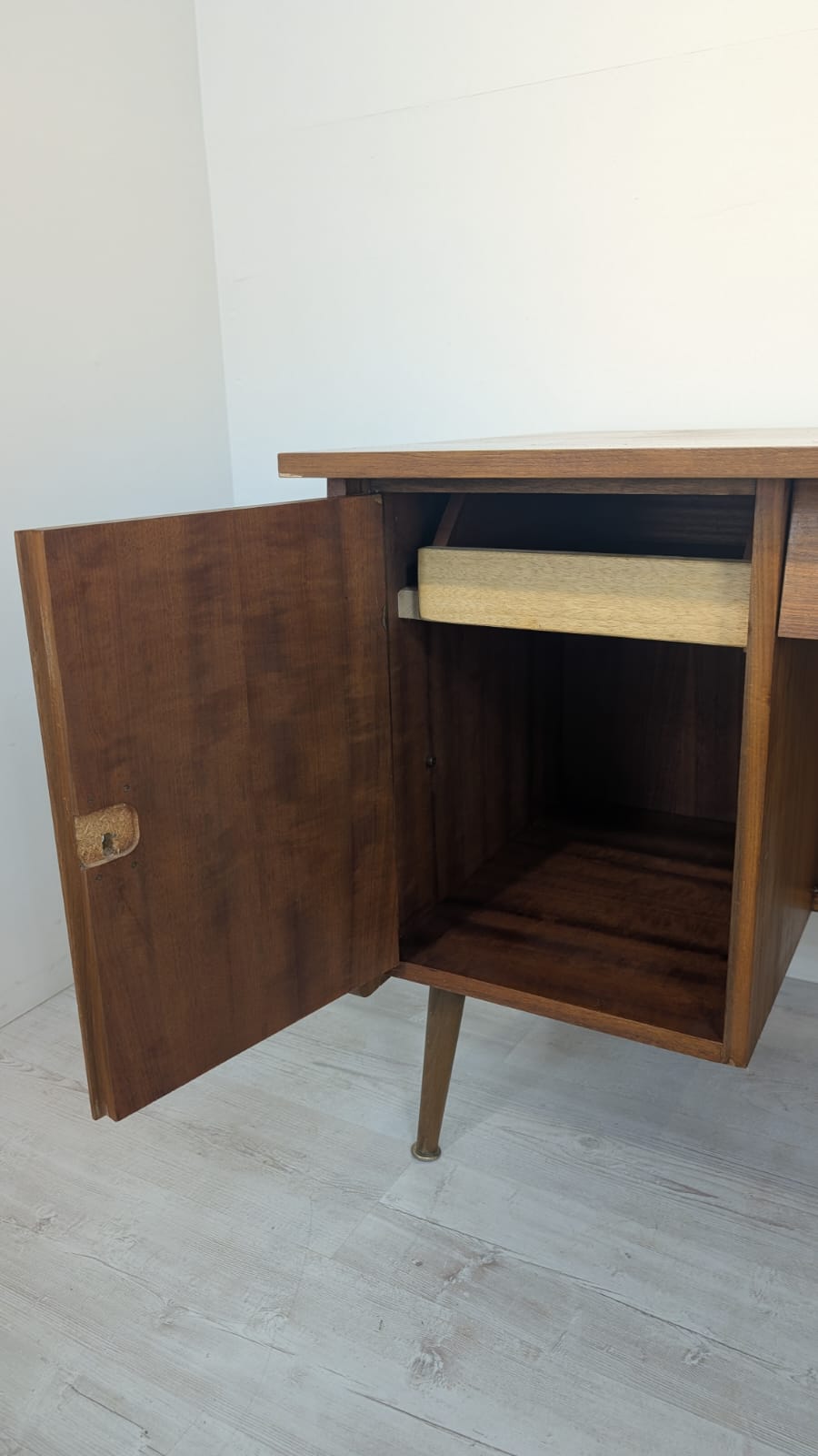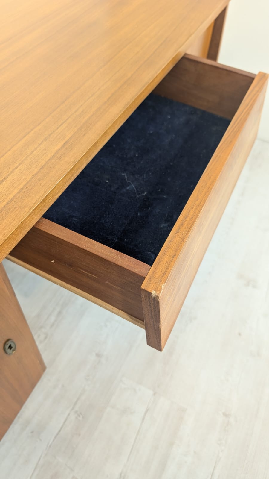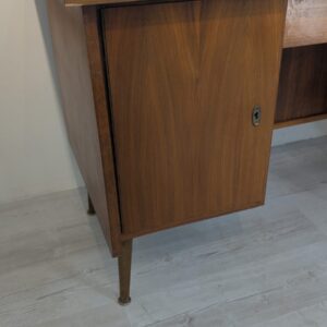 A stylish 1960s Scandinavian style wooden desk. Made of wood covered with teak veneer. The desk is in good condition, it bears signs of use but has retained its original charm.