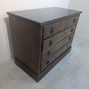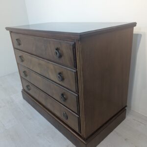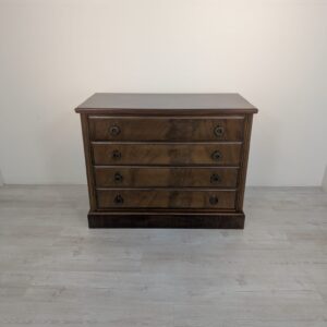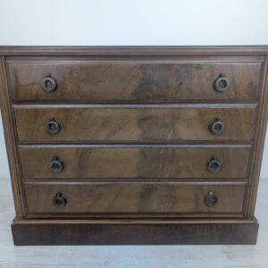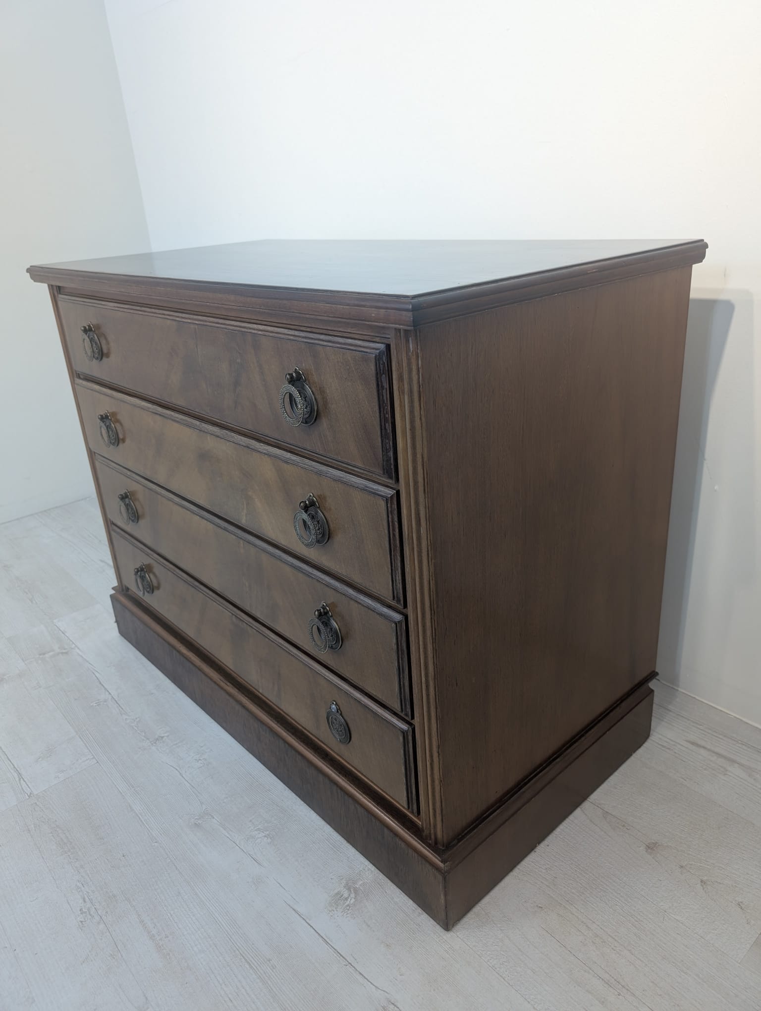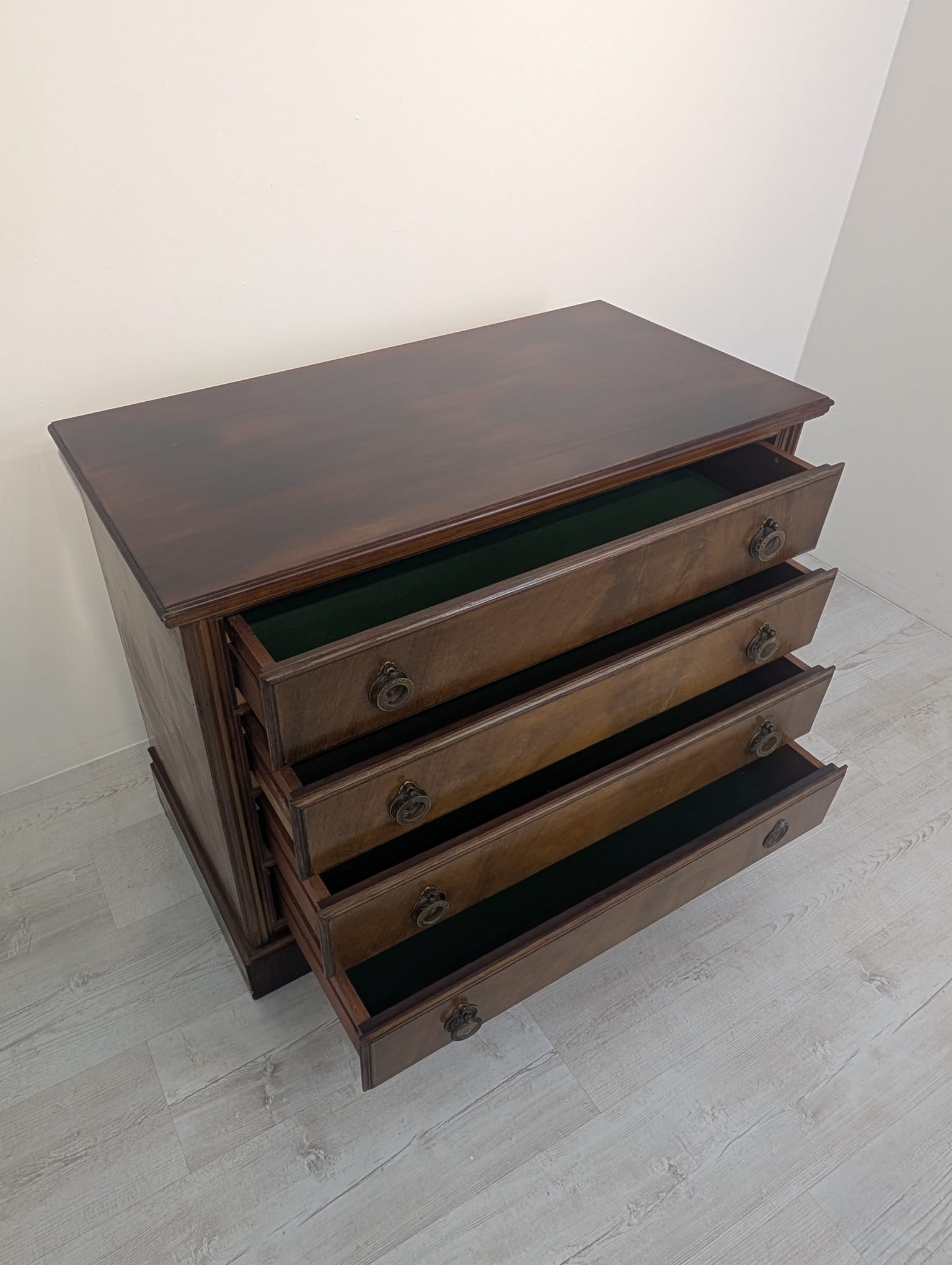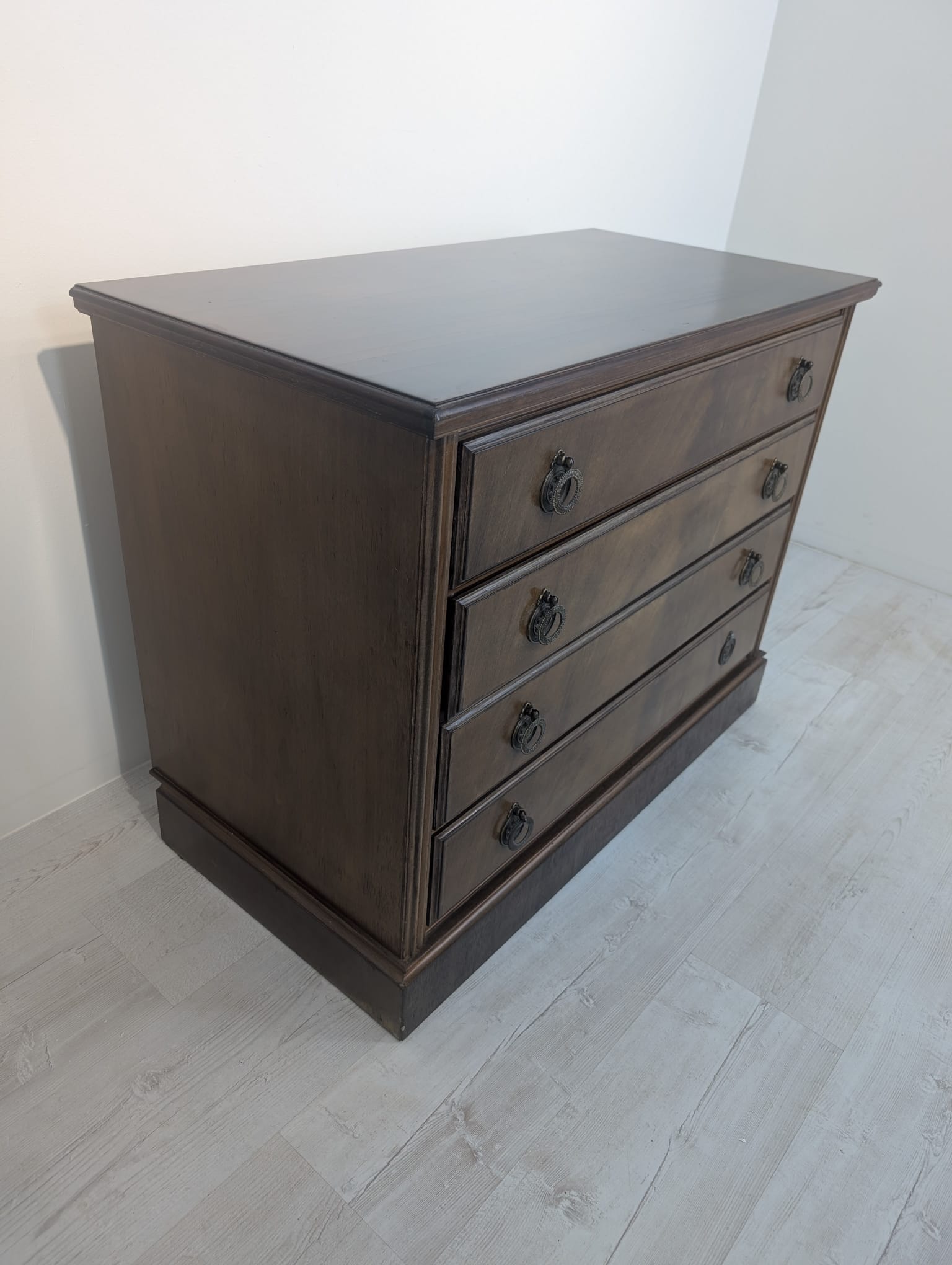 A stylish English style veneered chest of drawers from the 1950s or 1960s. Made of wood, it has 4 drawers with original handles. A piece of furniture in good condition, suitable for use in a bedroom or living room.
