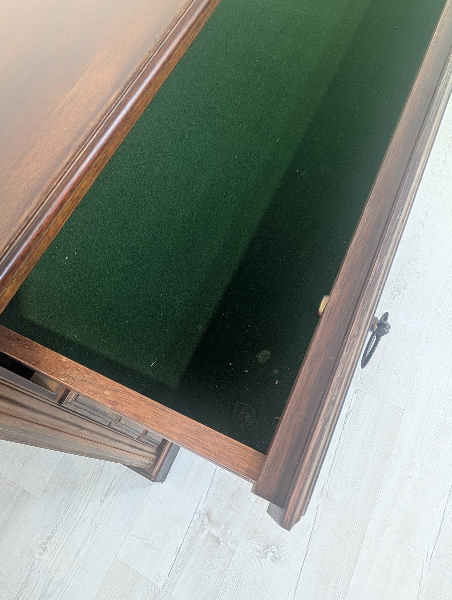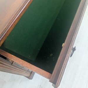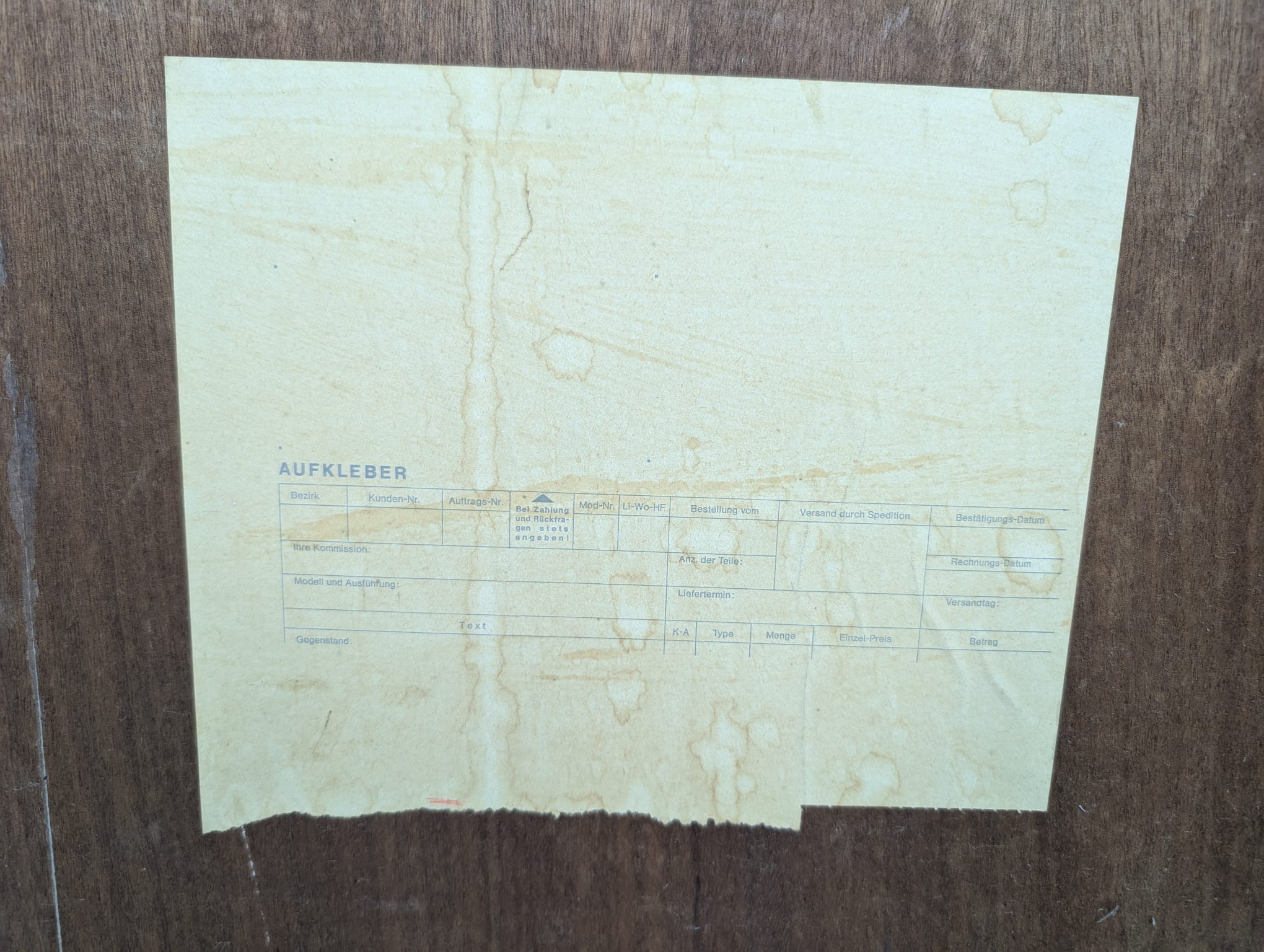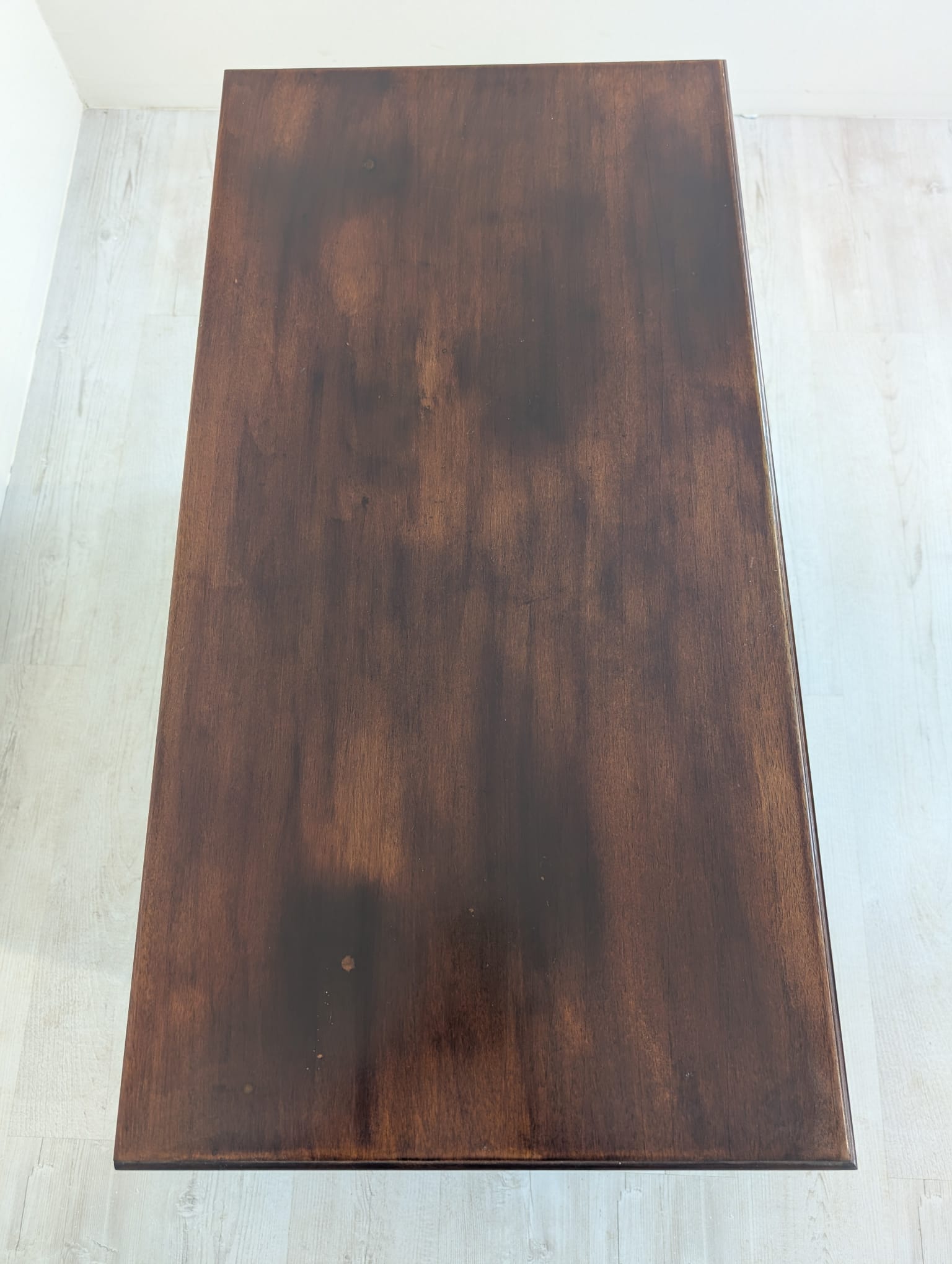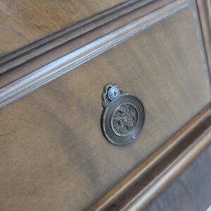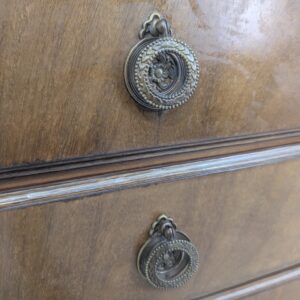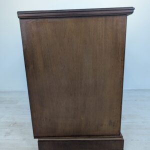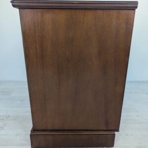 A stylish English style veneered chest of drawers from the 1950s or 1960s. Made of wood, it has 4 drawers with original handles. A piece of furniture in good condition, suitable for use in a bedroom or living room.