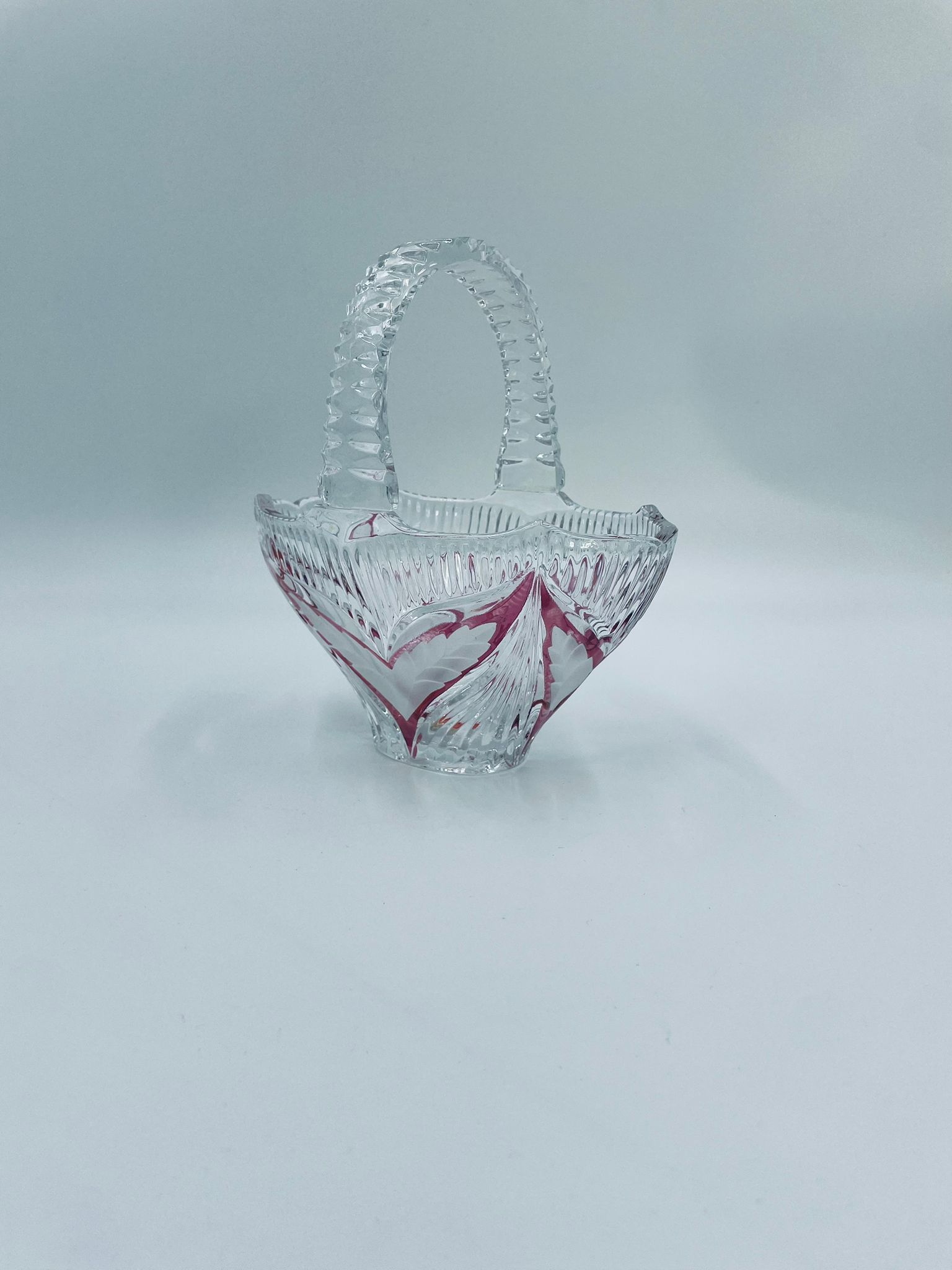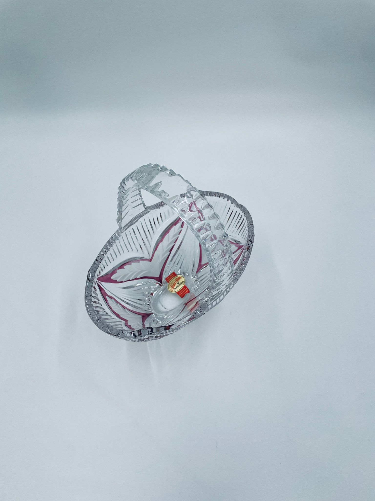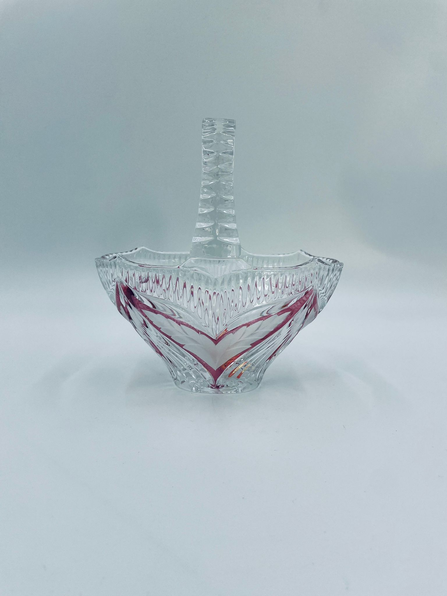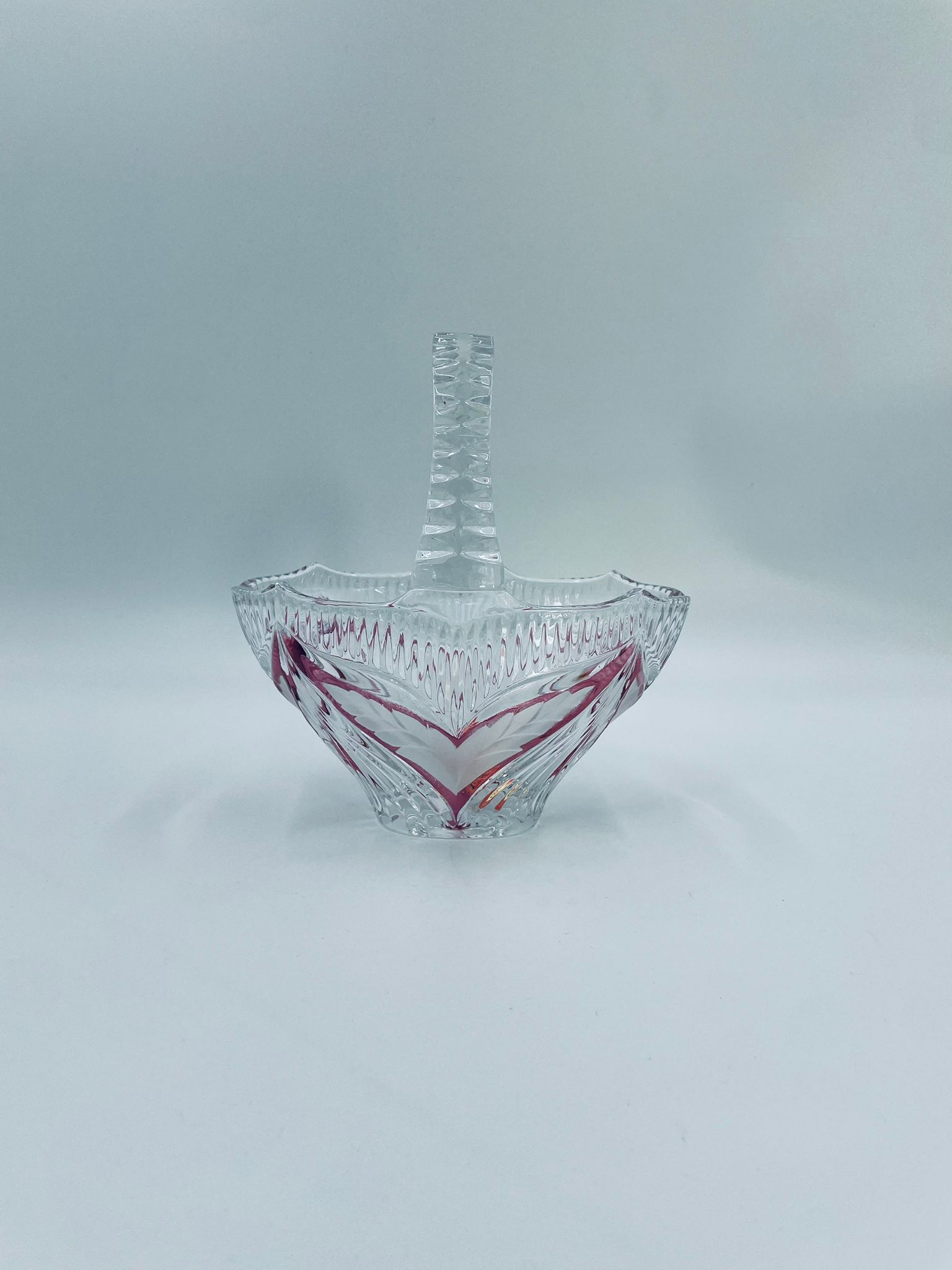A decorative basket by Anna Hutte Bleikristal, made from genuine lead crystal, which contains more than 24% of lead PbO, increasing its clarity and brilliance. The basket is decorated with an intricate embossed pattern of rosettes and fans with red accents.