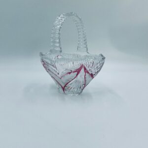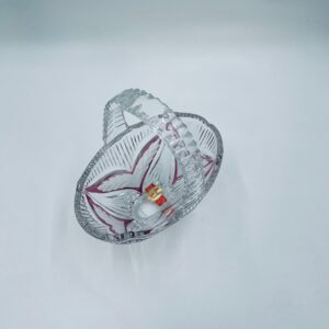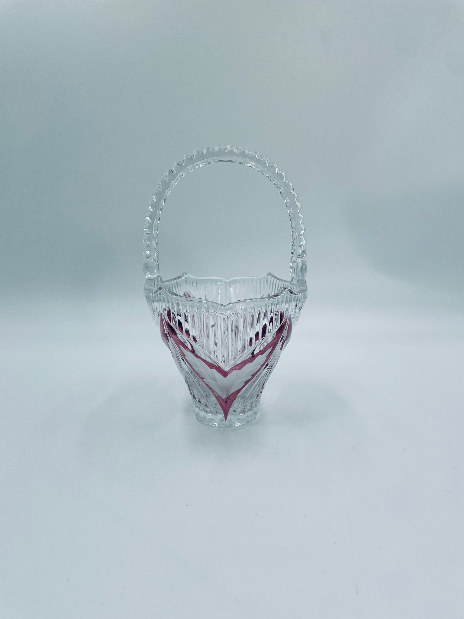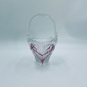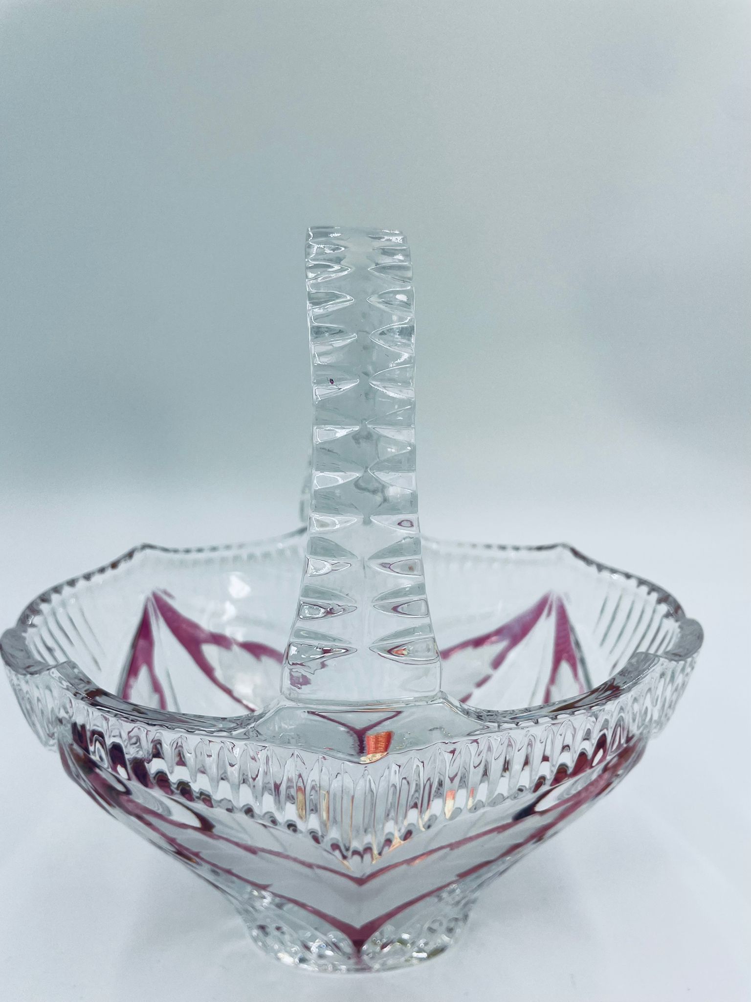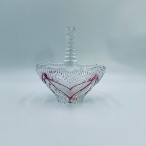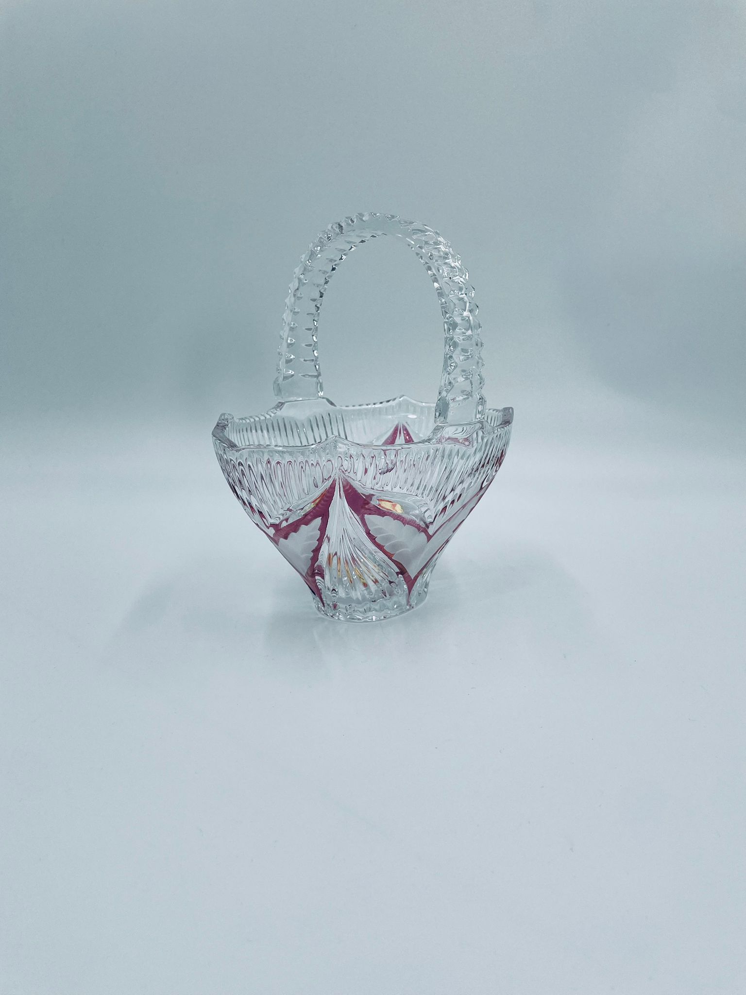 A decorative basket by Anna Hutte Bleikristal, made from genuine lead crystal, which contains more than 24% of lead PbO, increasing its clarity and brilliance. The basket is decorated with an intricate embossed pattern of rosettes and fans with red accents.