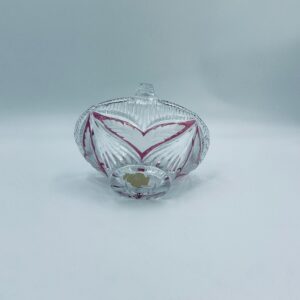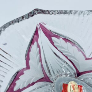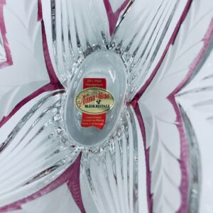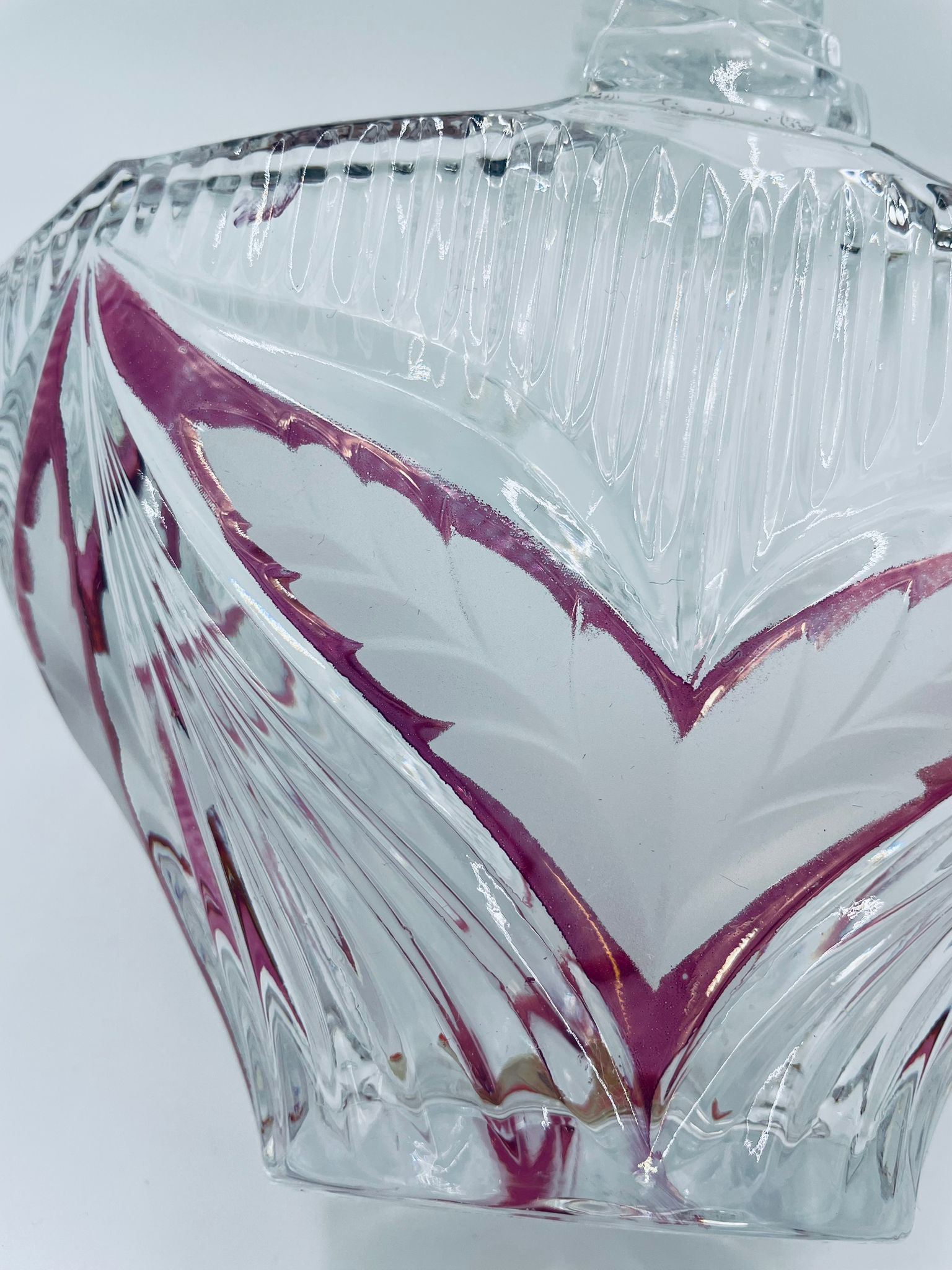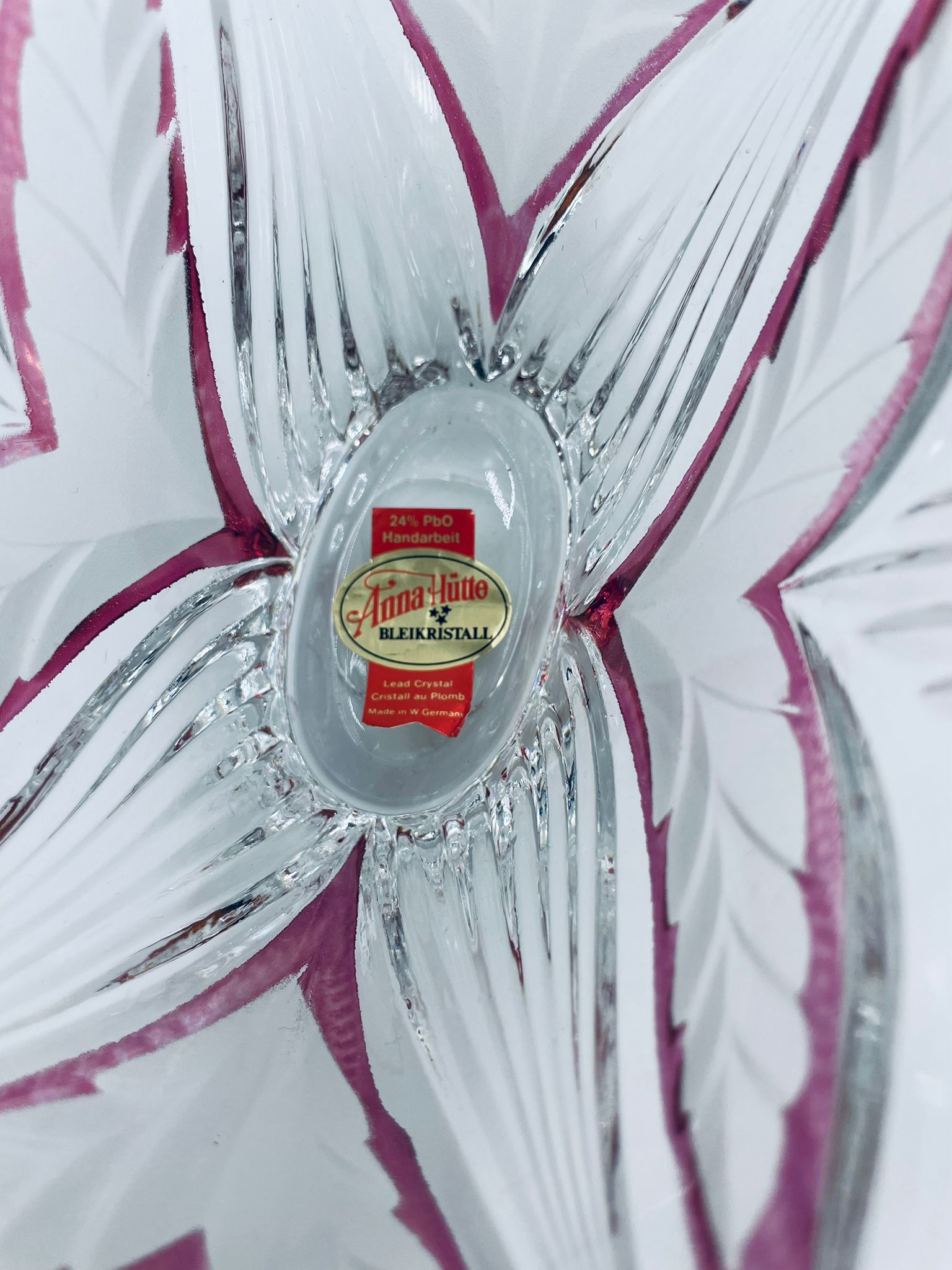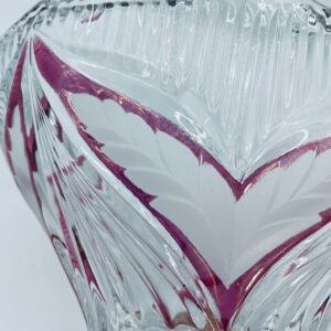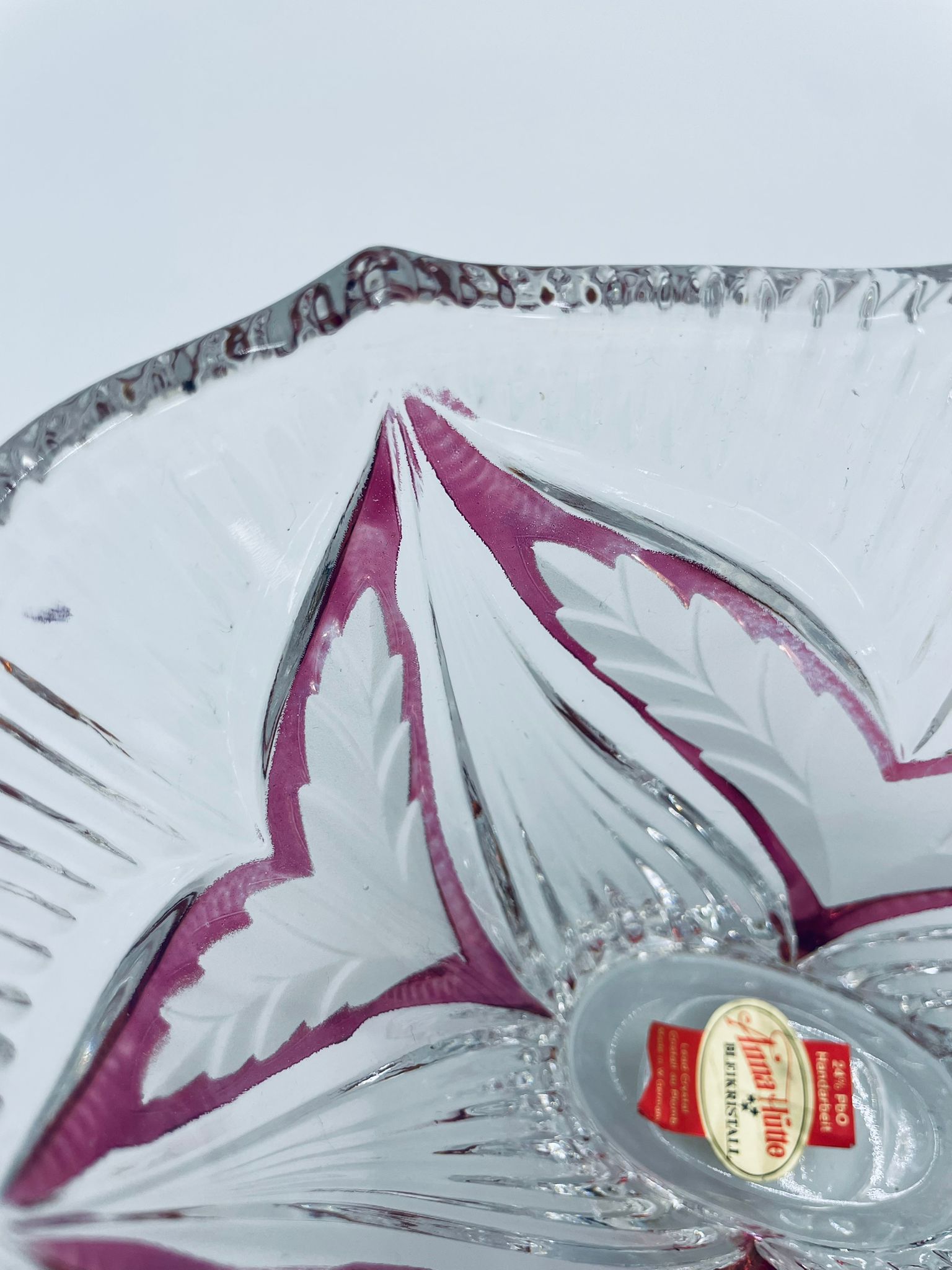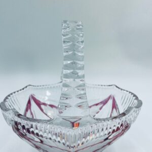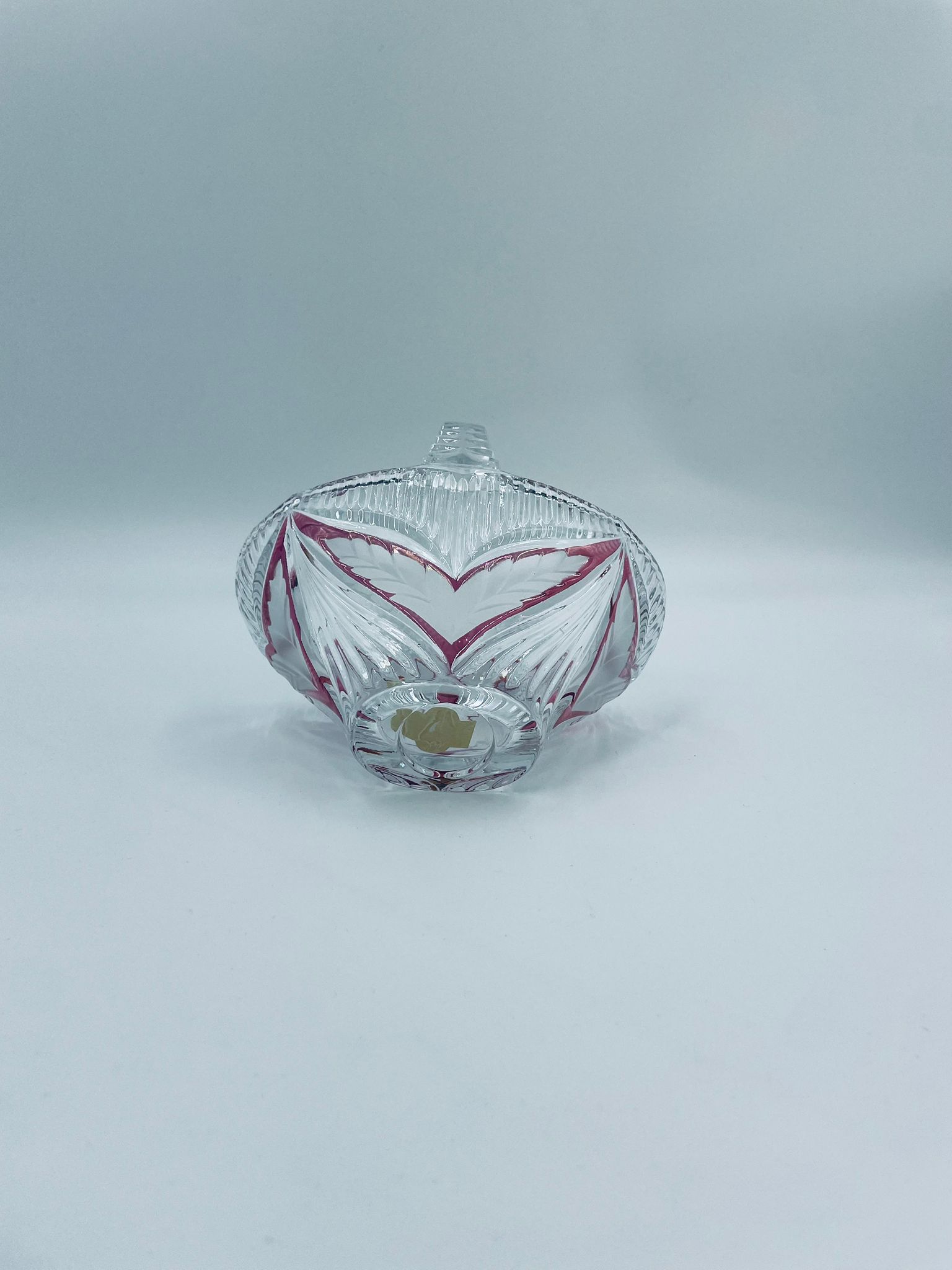A decorative basket by Anna Hutte Bleikristal, made from genuine lead crystal, which contains more than 24% of lead PbO, increasing its clarity and brilliance. The basket is decorated with an intricate embossed pattern of rosettes and fans with red accents.