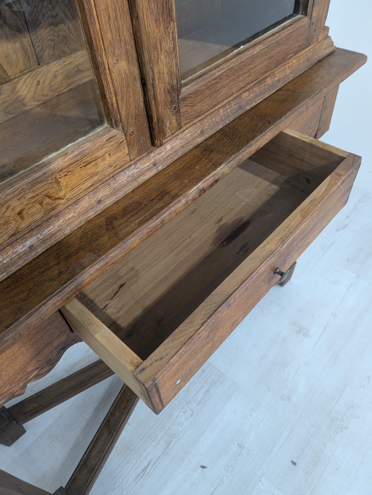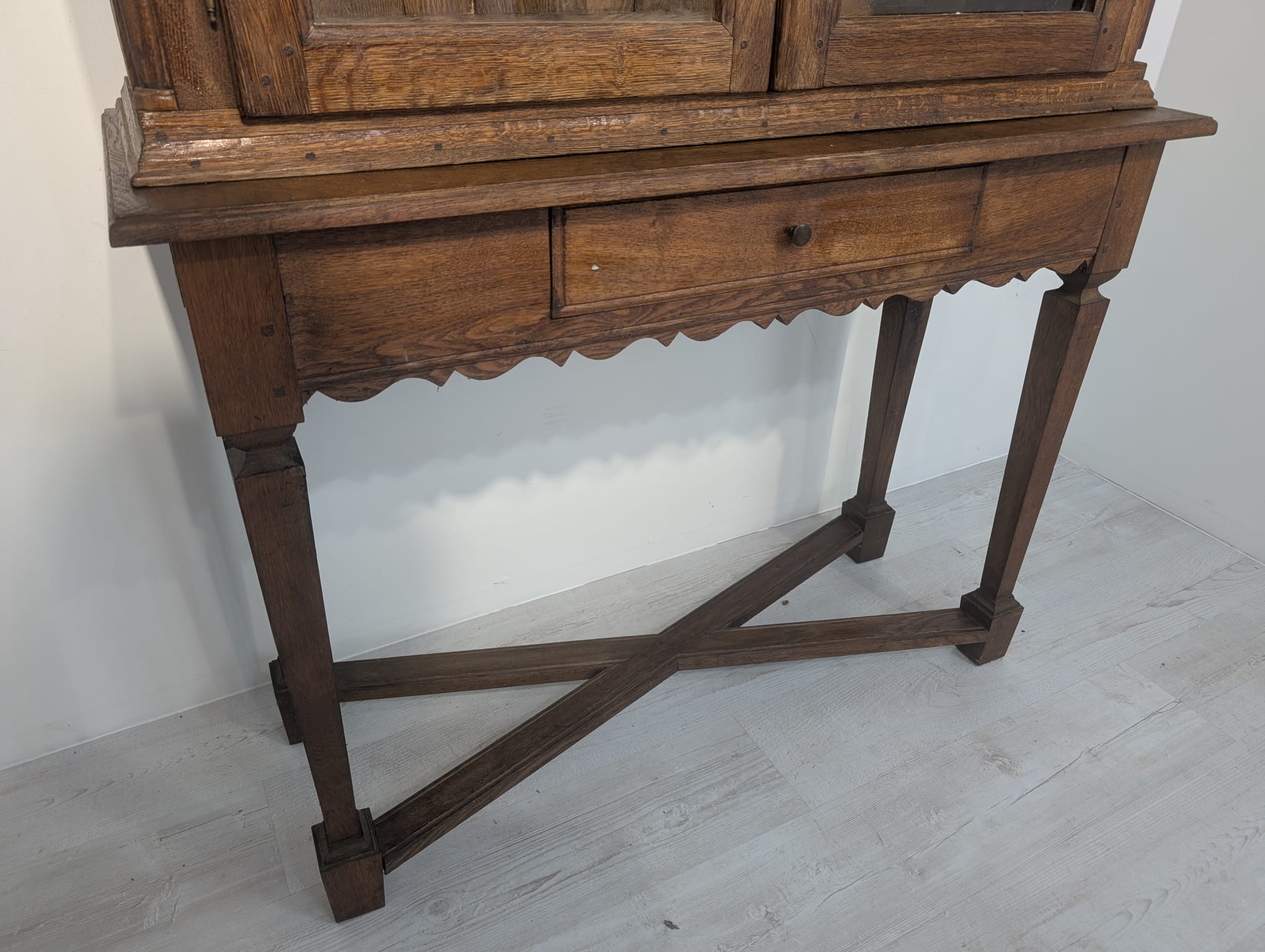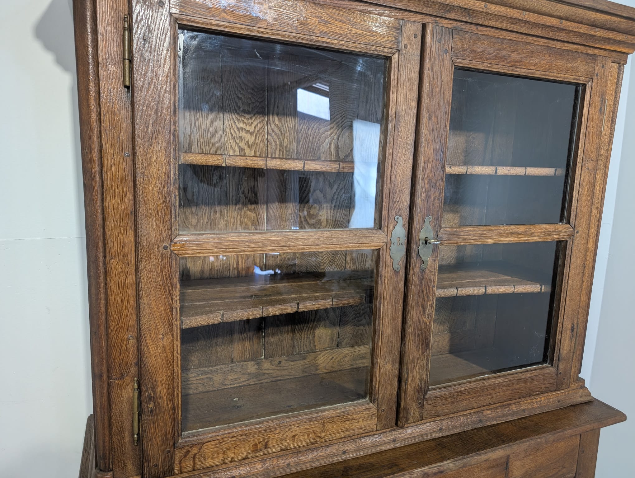 A stylish antique 19th century court style sideboard. Made of solid oak wood, it has two glazed cupboards and two drawers. The whole is in a warm, natural shade of wood. The sideboard will be perfect as an interior decoration in a rustic or classic style.