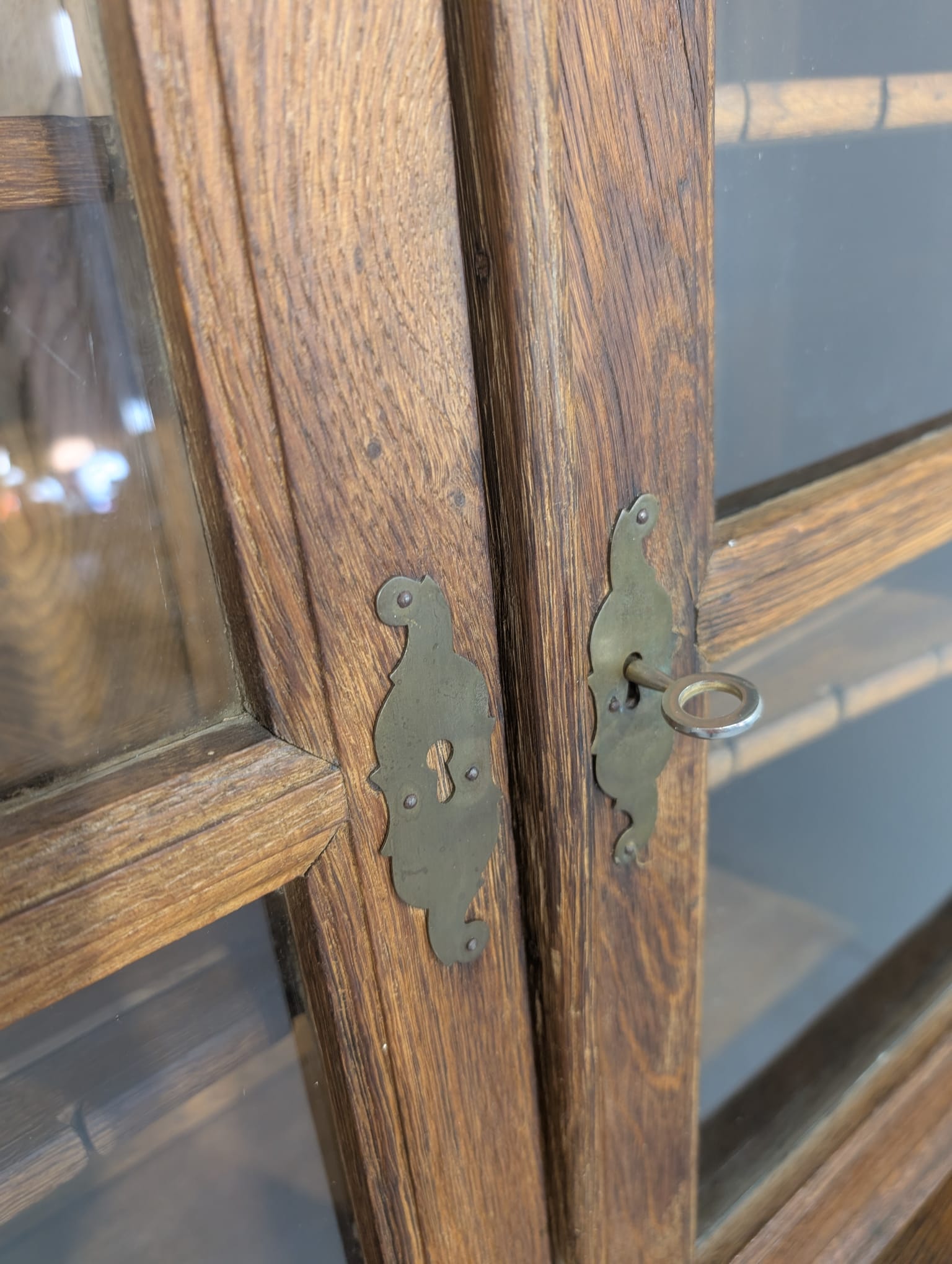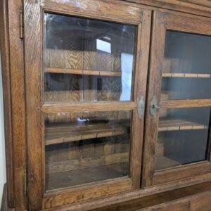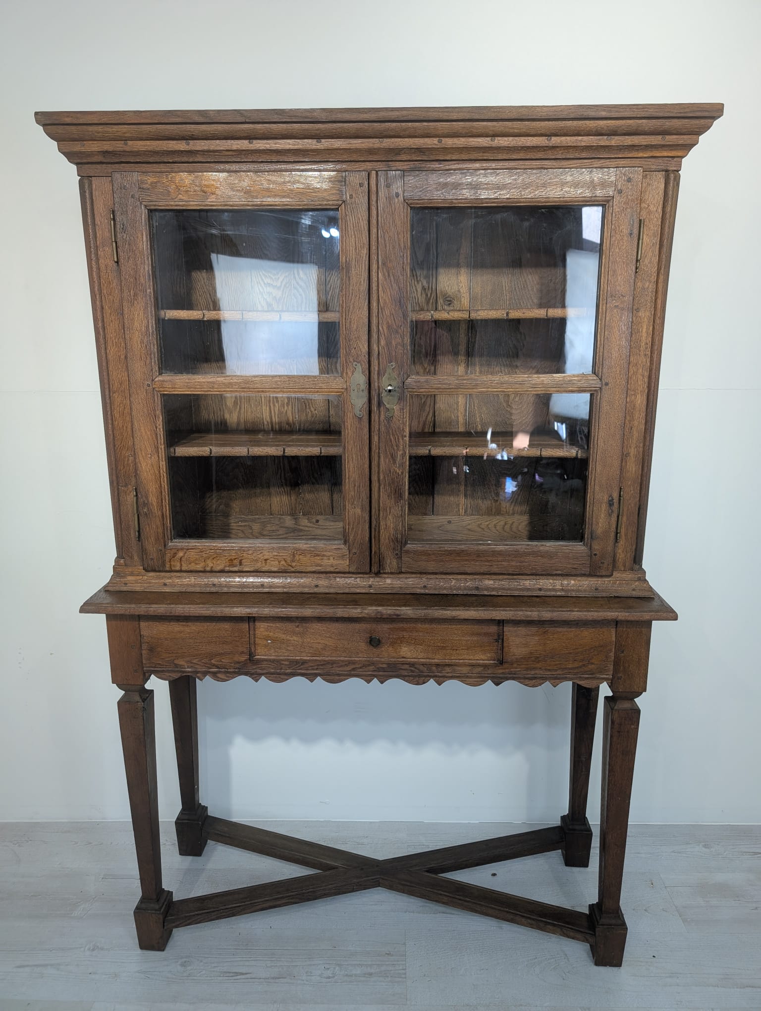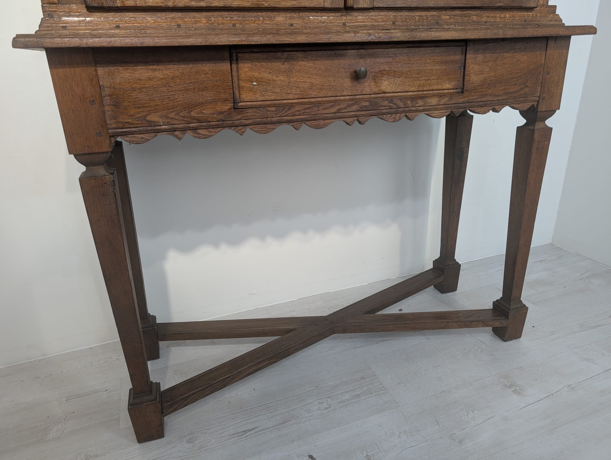 A stylish antique 19th century court style sideboard. Made of solid oak wood, it has two glazed cupboards and two drawers. The whole is in a warm, natural shade of wood. The sideboard will be perfect as an interior decoration in a rustic or classic style.