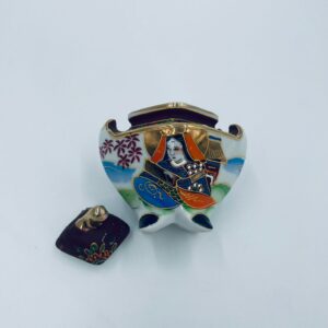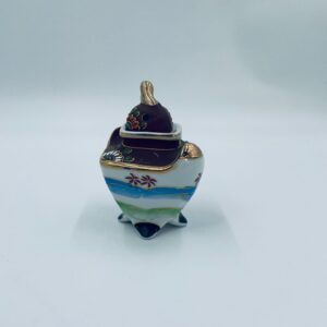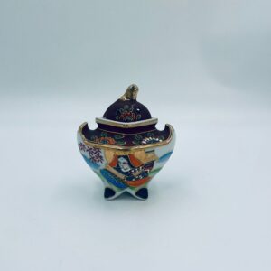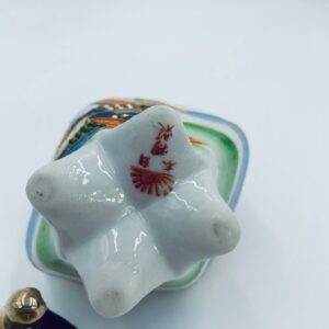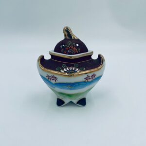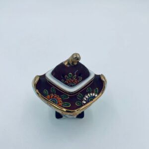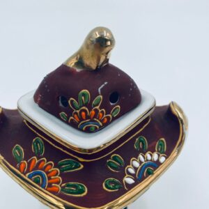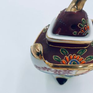 An antique Japanese ladle made by the Nippon Tokusei factory circa 1930s, made using the Moriage technique, in high quality porcelain. A ladle traditionally used in Japanese tea ceremony and meditation. The ladle on four decorative legs, richly decorated with hand-painted, relief decoration, motifs and figures, finished with gilding on the rims. It has rubbing on the gilding.