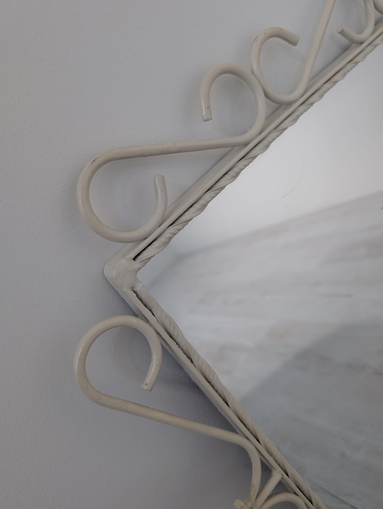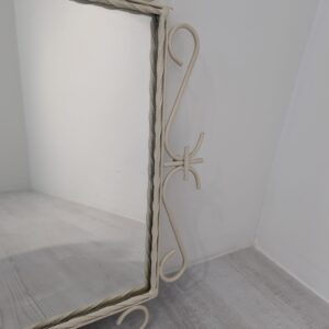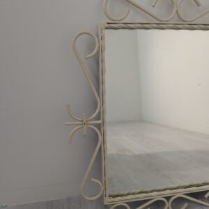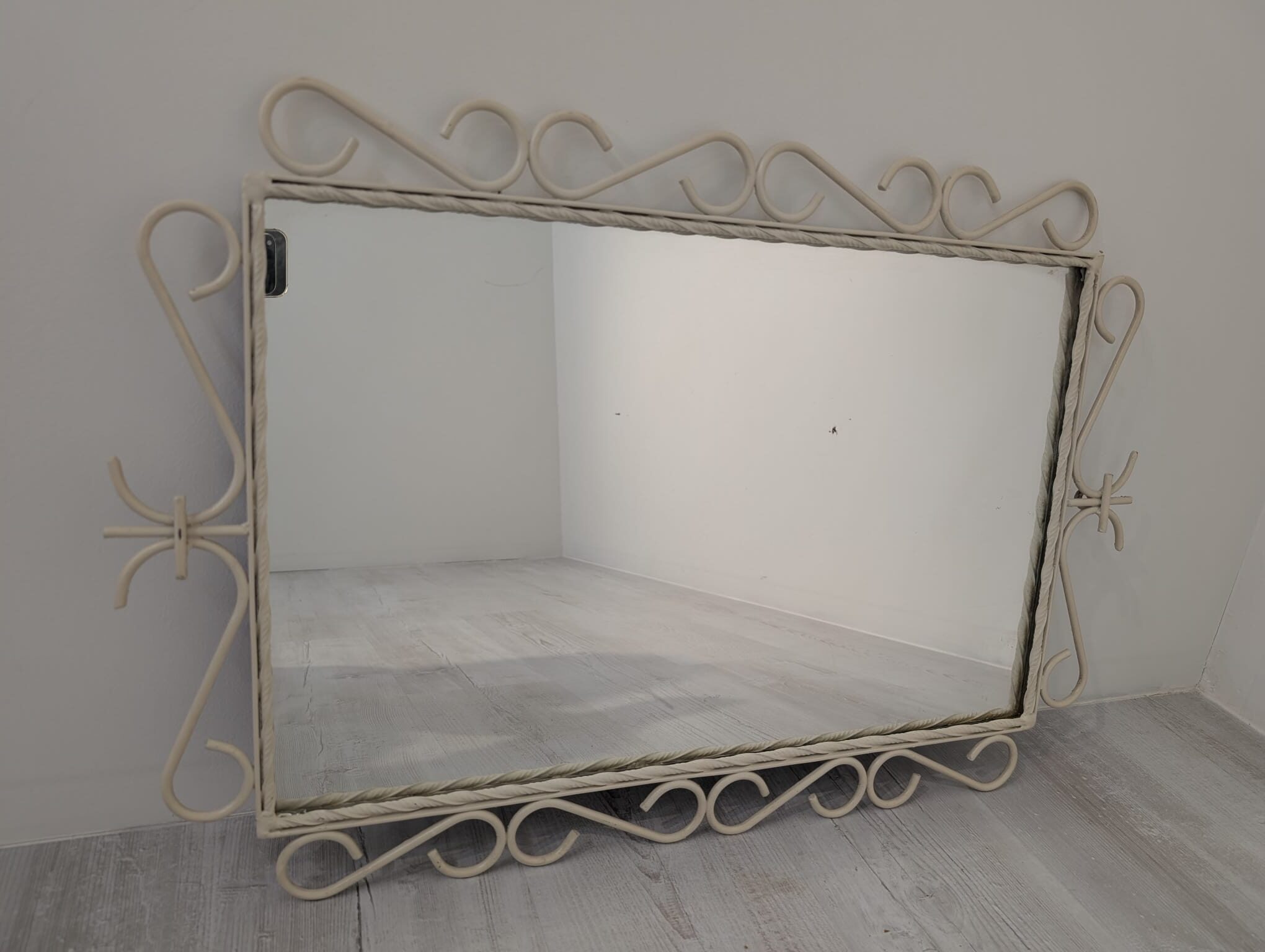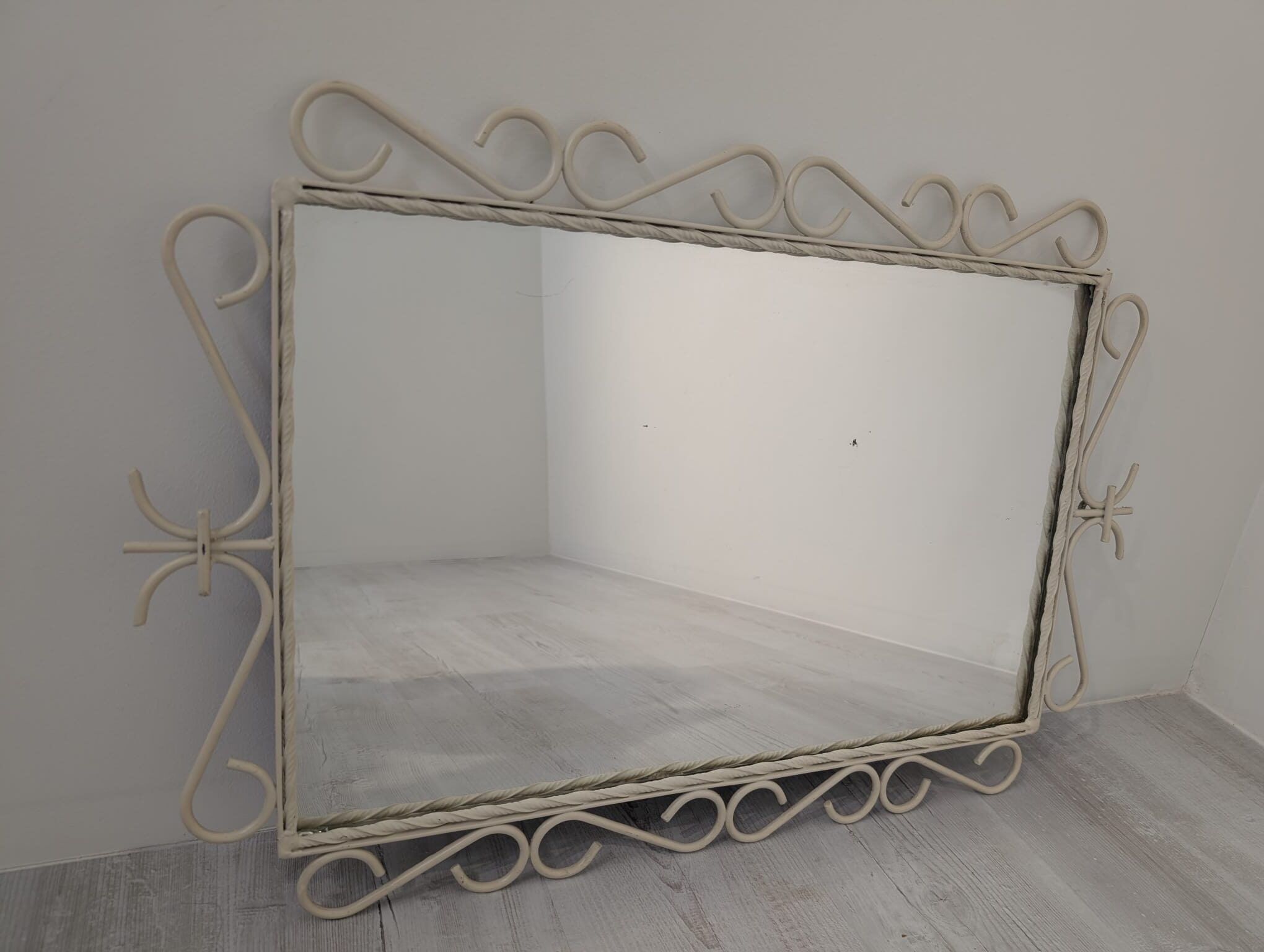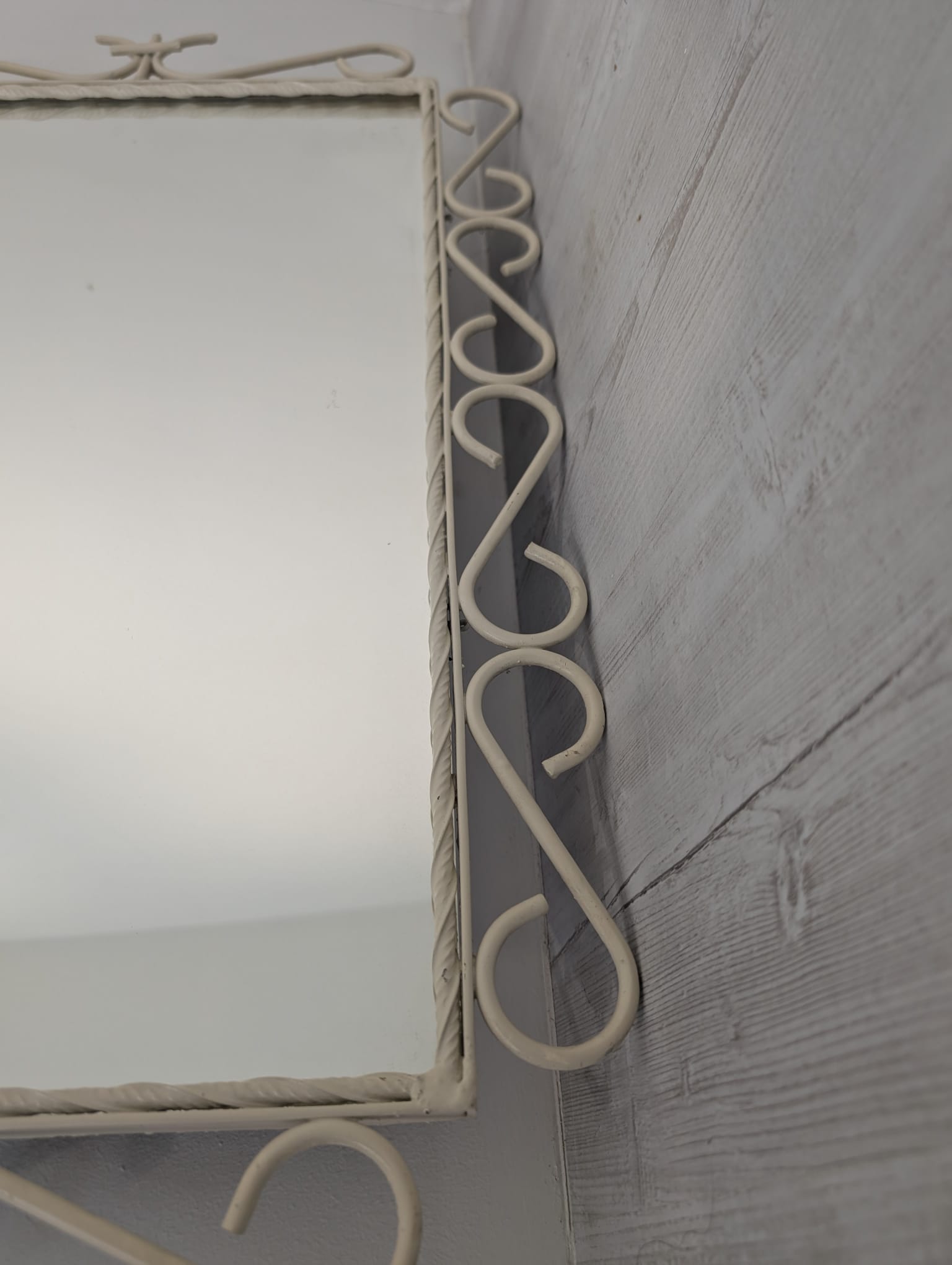 A stylish vintage metal mirror in an ornate frame. The mirror has subtle signs of use but still looks elegant. It will perfectly complement a vintage or rustic interior design.
