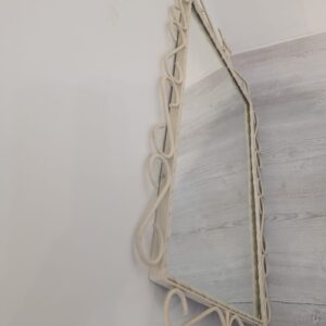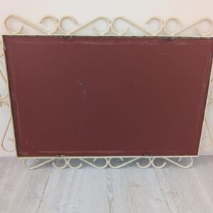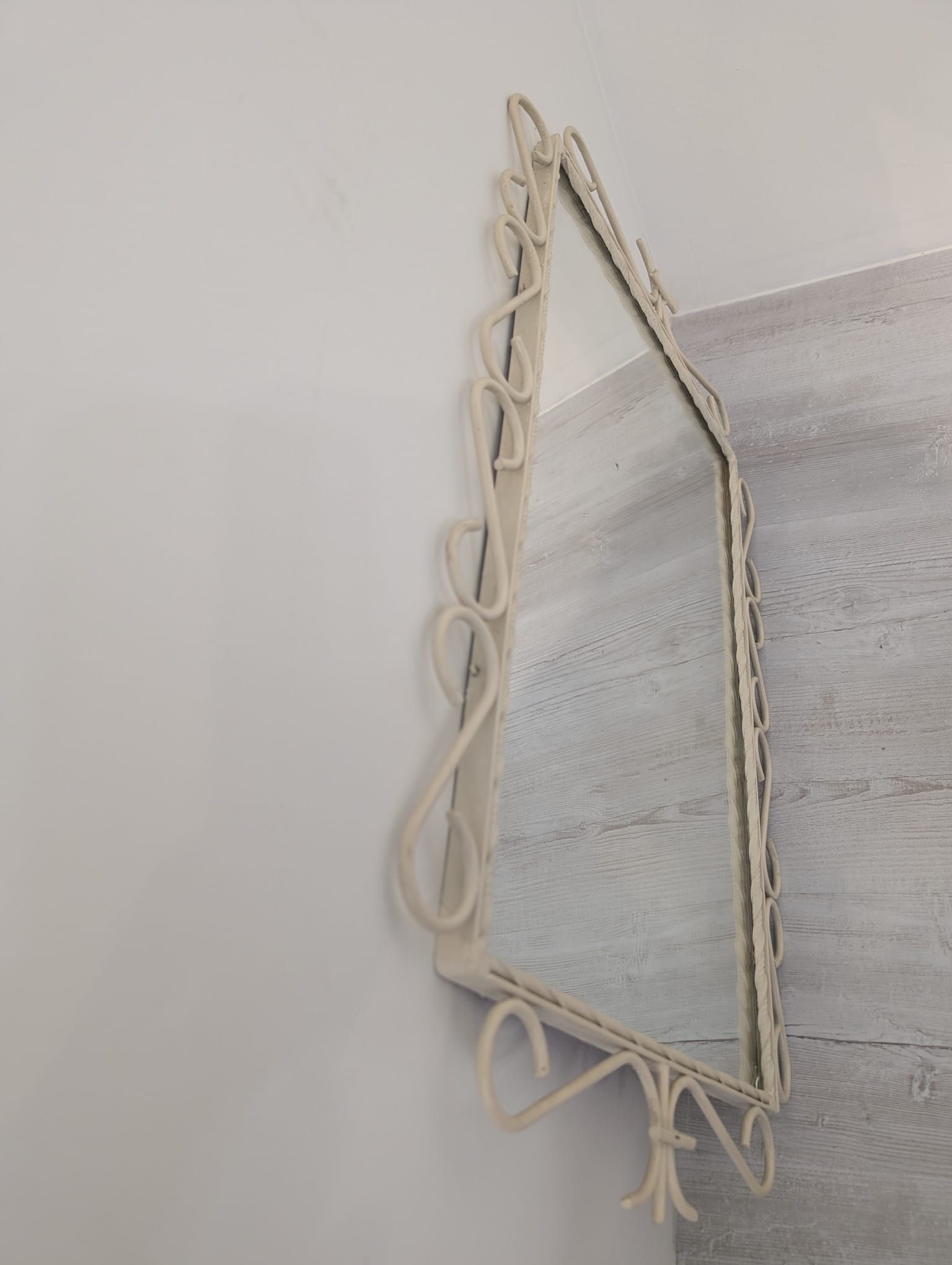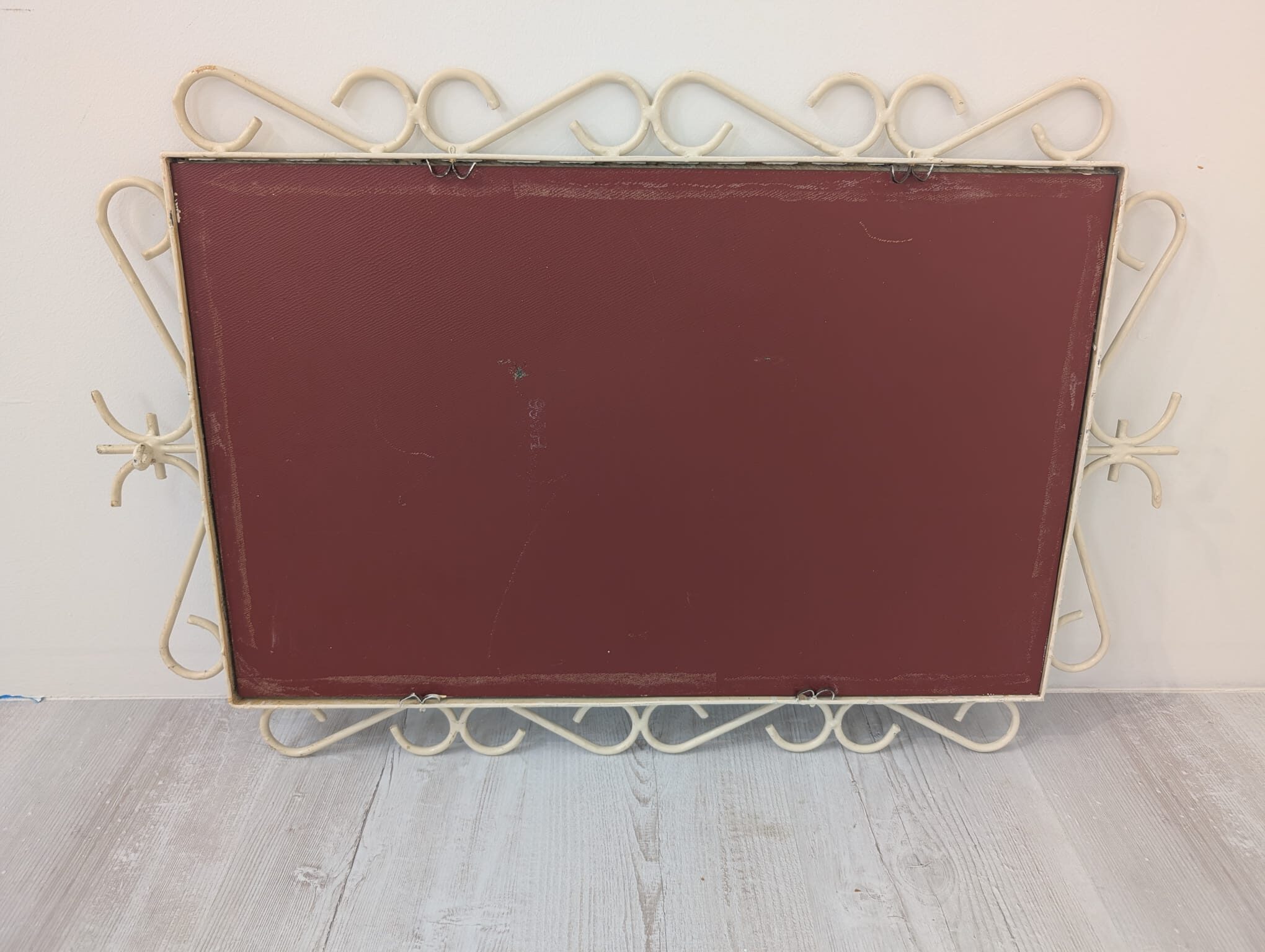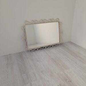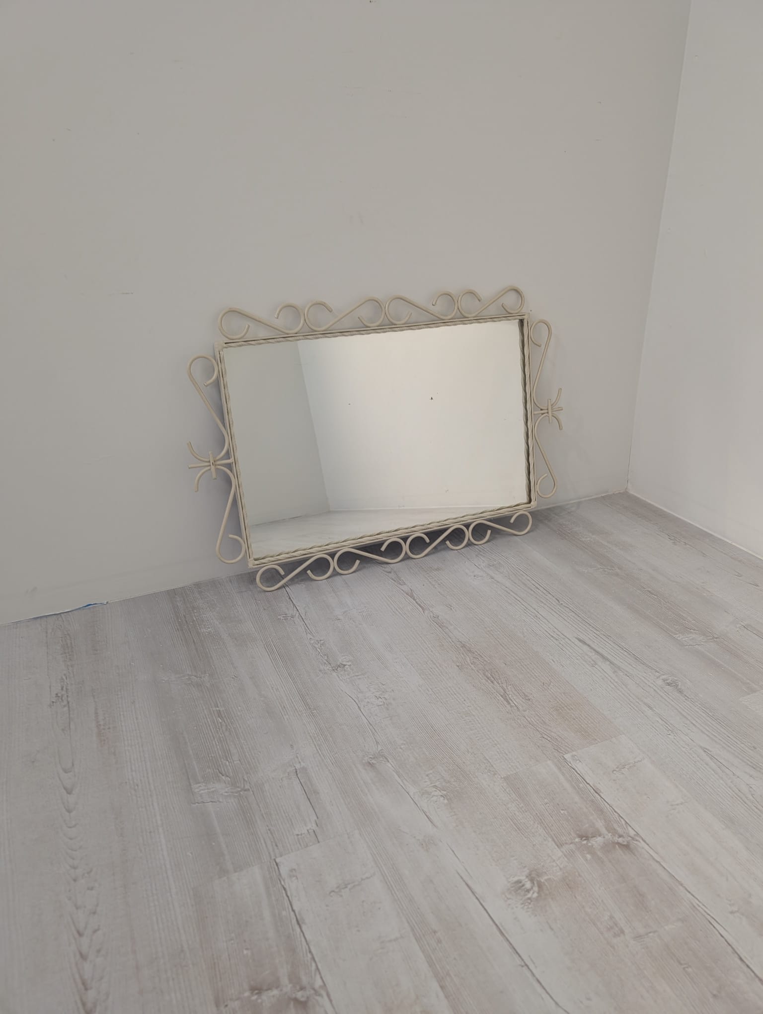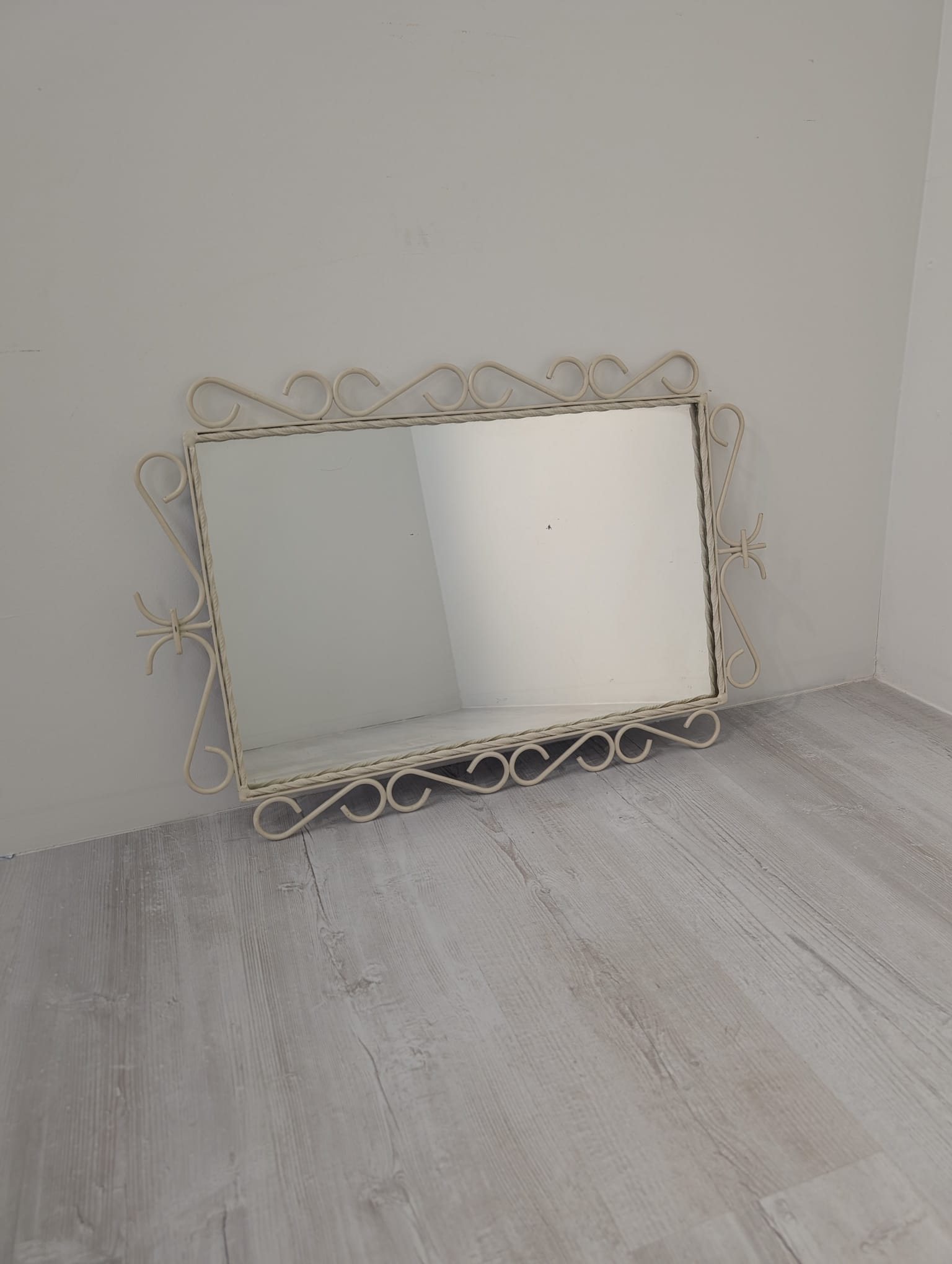 A stylish vintage metal mirror in an ornate frame. The mirror has subtle signs of use but still looks elegant. It will perfectly complement a vintage or rustic interior design.