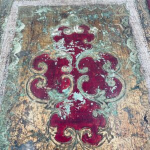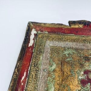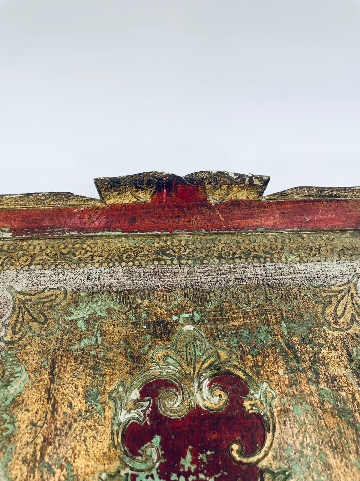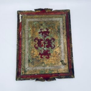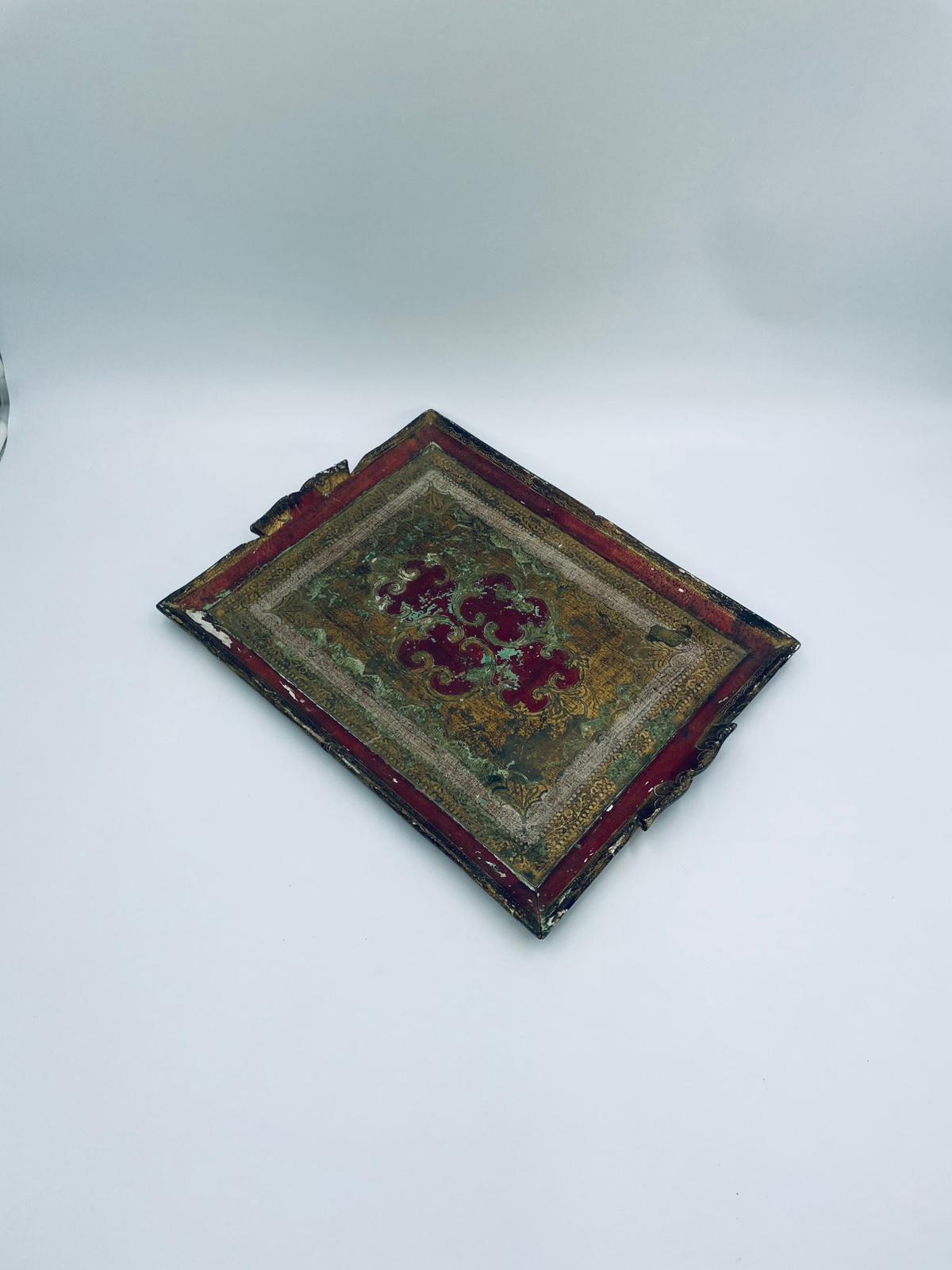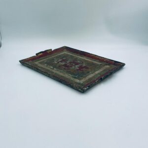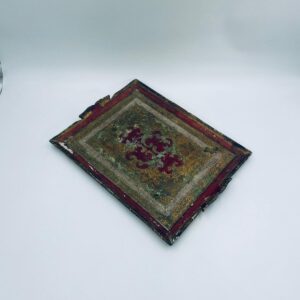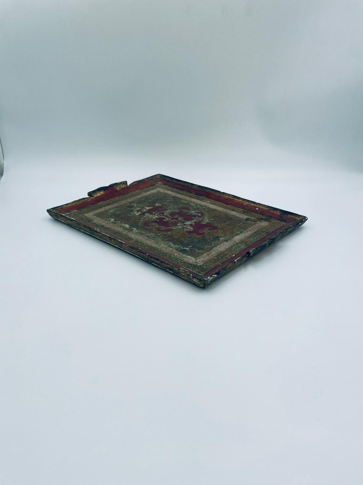 Antyczna taca w Włoskim stylu, wykonana z drewna. Taca z dwoma ozdobnymi uchwytami, charakteryzuje się ręcznie malowanymi, bogatymi zdobieniami w kolorach złota i czerwieni. Posiada liczne przetarcia oraz pęknięcia.