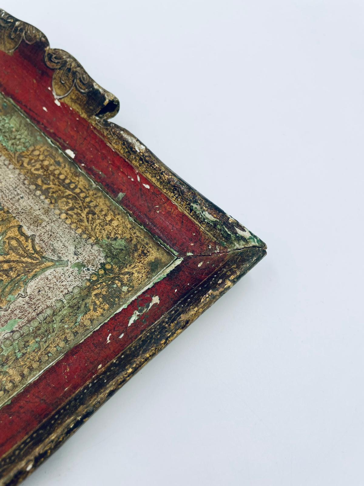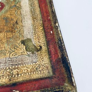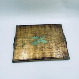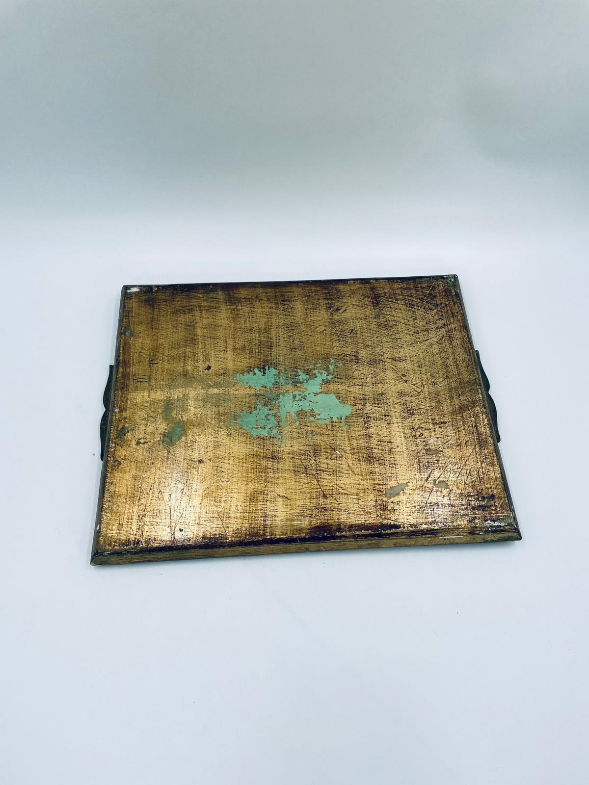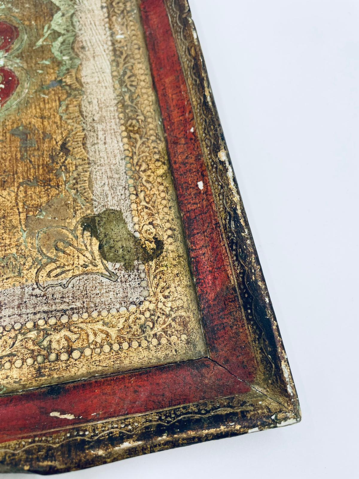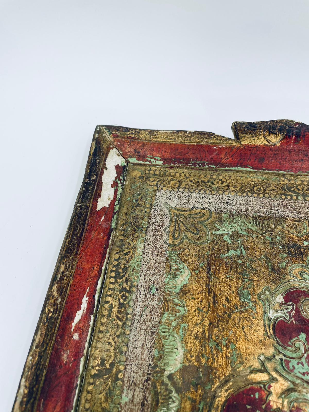 Antyczna taca w Włoskim stylu, wykonana z drewna. Taca z dwoma ozdobnymi uchwytami, charakteryzuje się ręcznie malowanymi, bogatymi zdobieniami w kolorach złota i czerwieni. Posiada liczne przetarcia oraz pęknięcia.