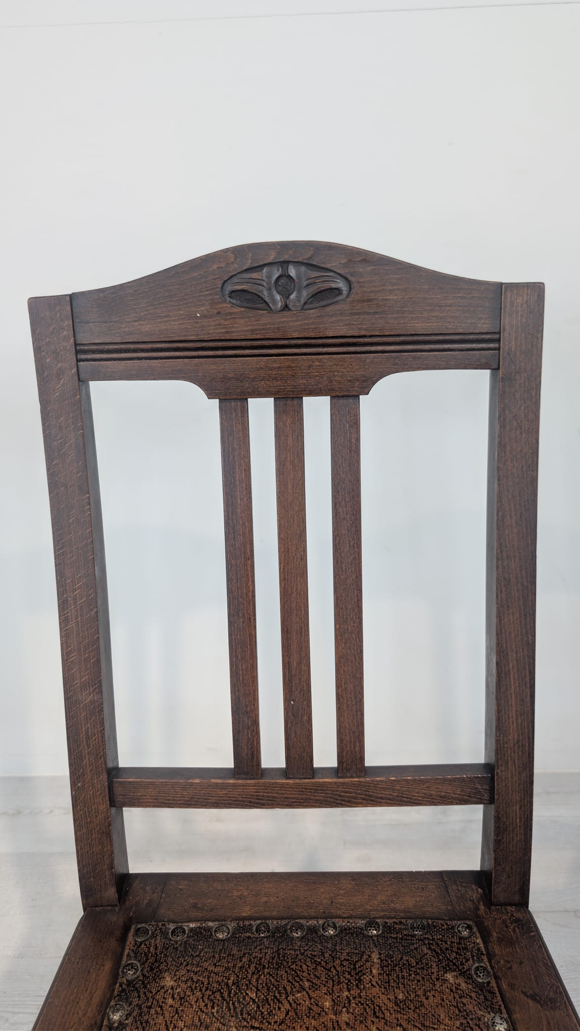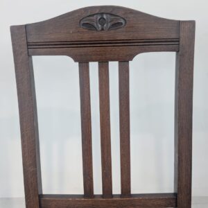 Stylowy, zabytkowy dębowy fotel z oryginalnym, skórzanym siedziskiem. Mebel posiada charakterystyczne zdobienia na oparciu, nadające mu elegancki wygląd. Idealnie pasuje do klasycznego, vintage’owego wnętrza.