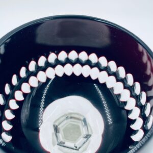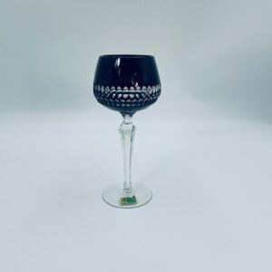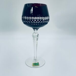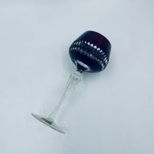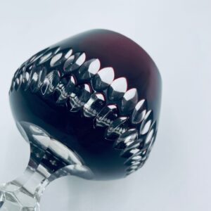Antyczny kieliszek do wina wytworni Lousitzer Kristallglas, wyprodukowany w GDR, wykonany z wysokiej jakości szkła kryształowego. Kieliszek posiada rubinową, dwuwarstwową czarę z bogatym ręcznie szlifowanym, prezycyjnym wzorem, smukłą fasetowana nóżkę i stabilną podstawę.