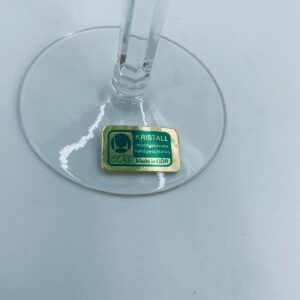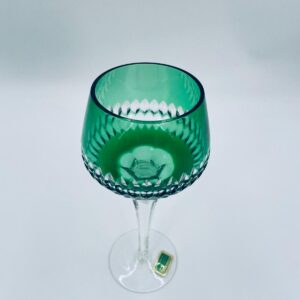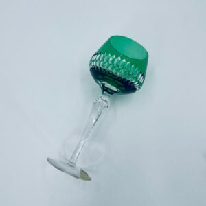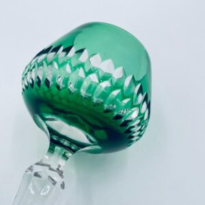 Antyczny kieliszek do wina wytworni Lousitzer Kristallglas, wyprodukowany w GDR, wykonany z wysokiej jakości szkła kryształowego. Kieliszek posiada zieloną, dwuwarstwową czarę z bogatym ręcznie szlifowanym, prezycyjnym wzorem, smukłą fasetowana nóżkę i stabilną podstawę.