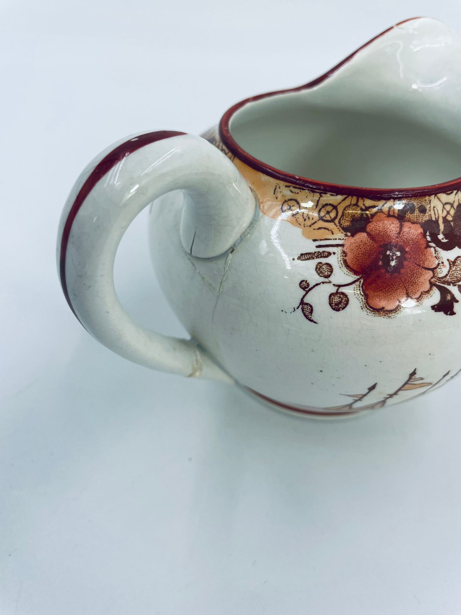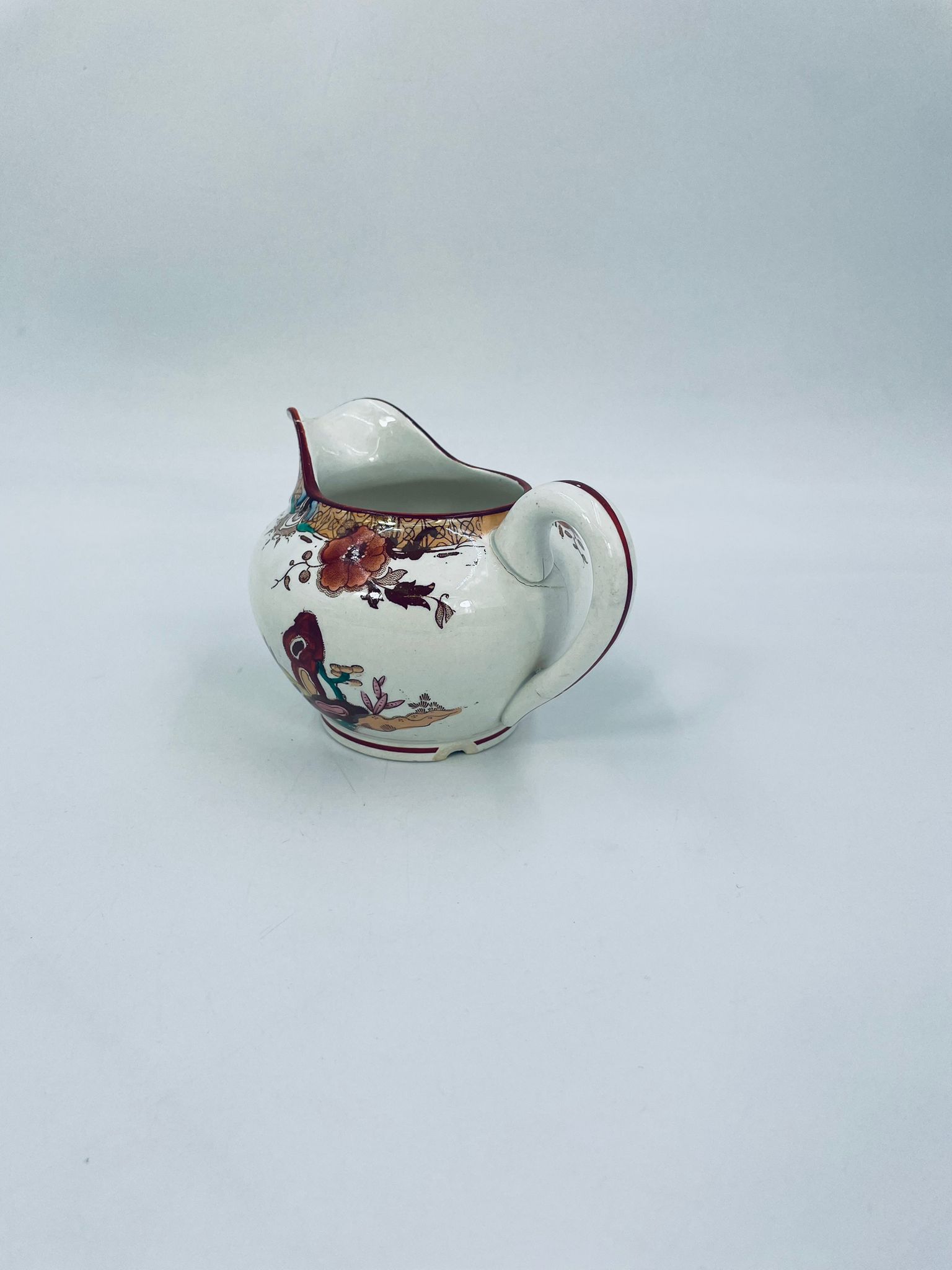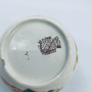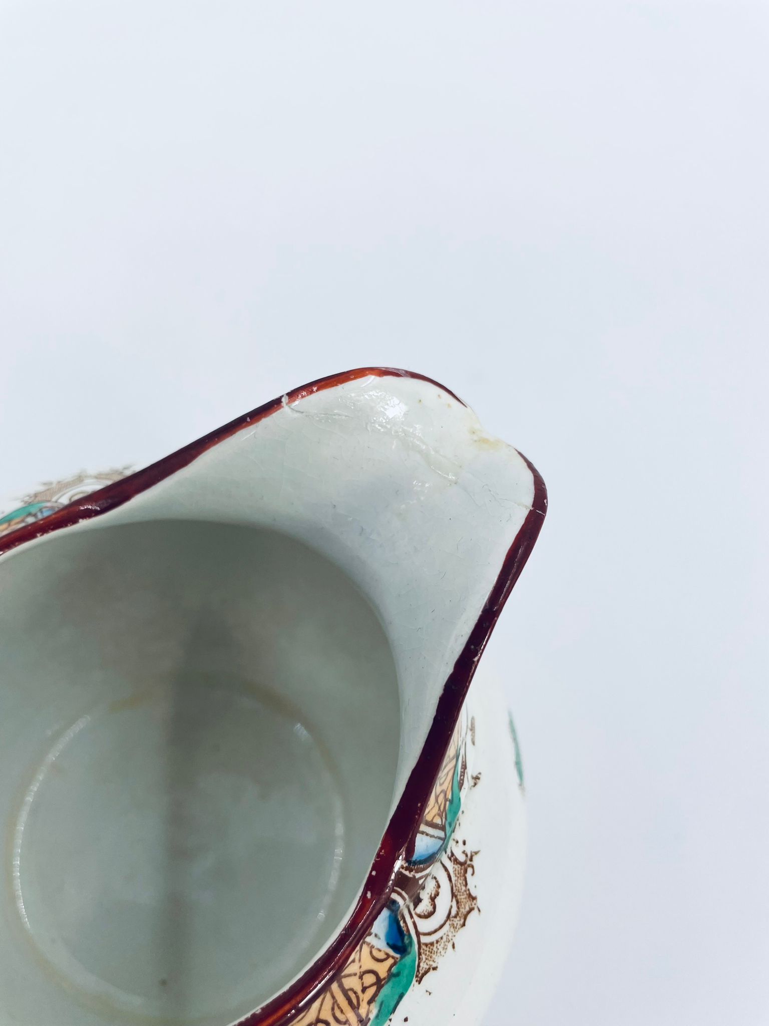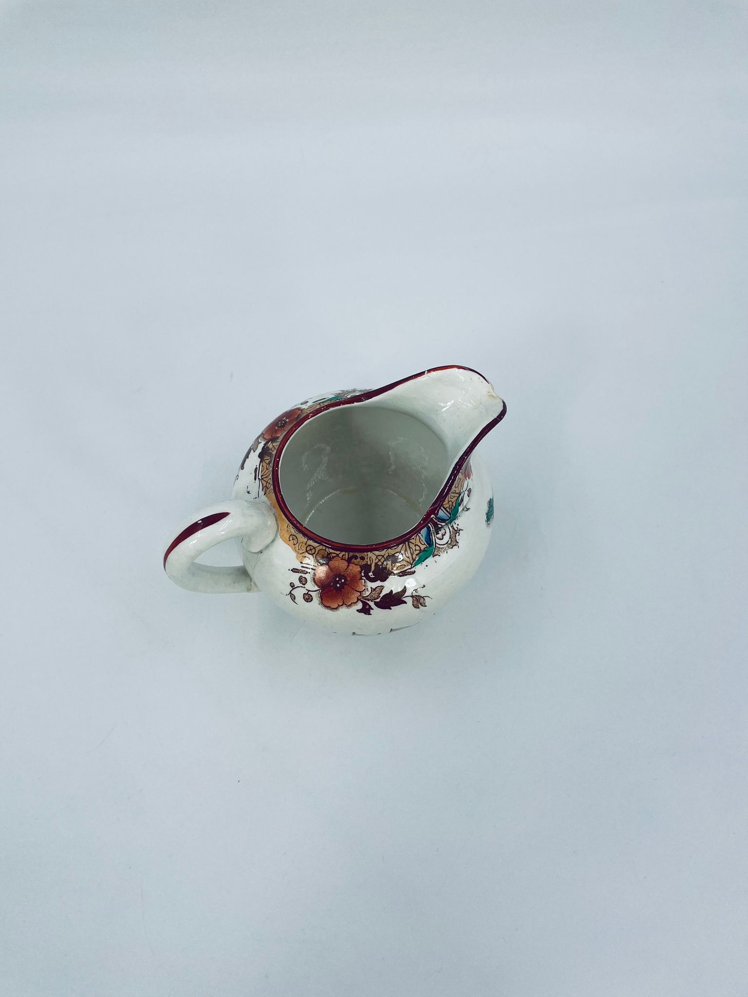 Dzbanuszek na mleko antyczny, francuskiej wytwórni Opaque de Sarreguemines która została założona w 1790r, wykonany z fajansu. Mlecznik charakteryzuje się recznie malowanym, bogatym, wielokolorowym wzorem, który obejmuje zarówno motywy orientalne , jak i kwiatowe, wykończony kolorem bordowym na krawędzi. Jest to przedmiot kolekcjonerski o wartości antykwarycznej. Posiada uszczerbek, pęknięcia oraz przetarcie na kolorze.