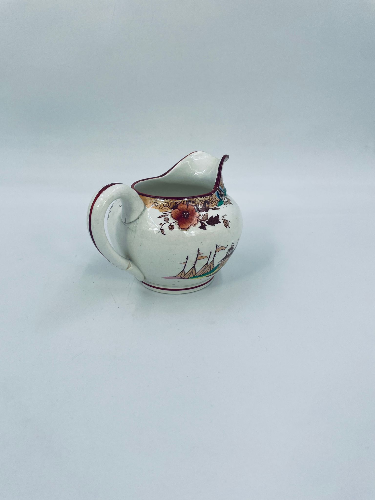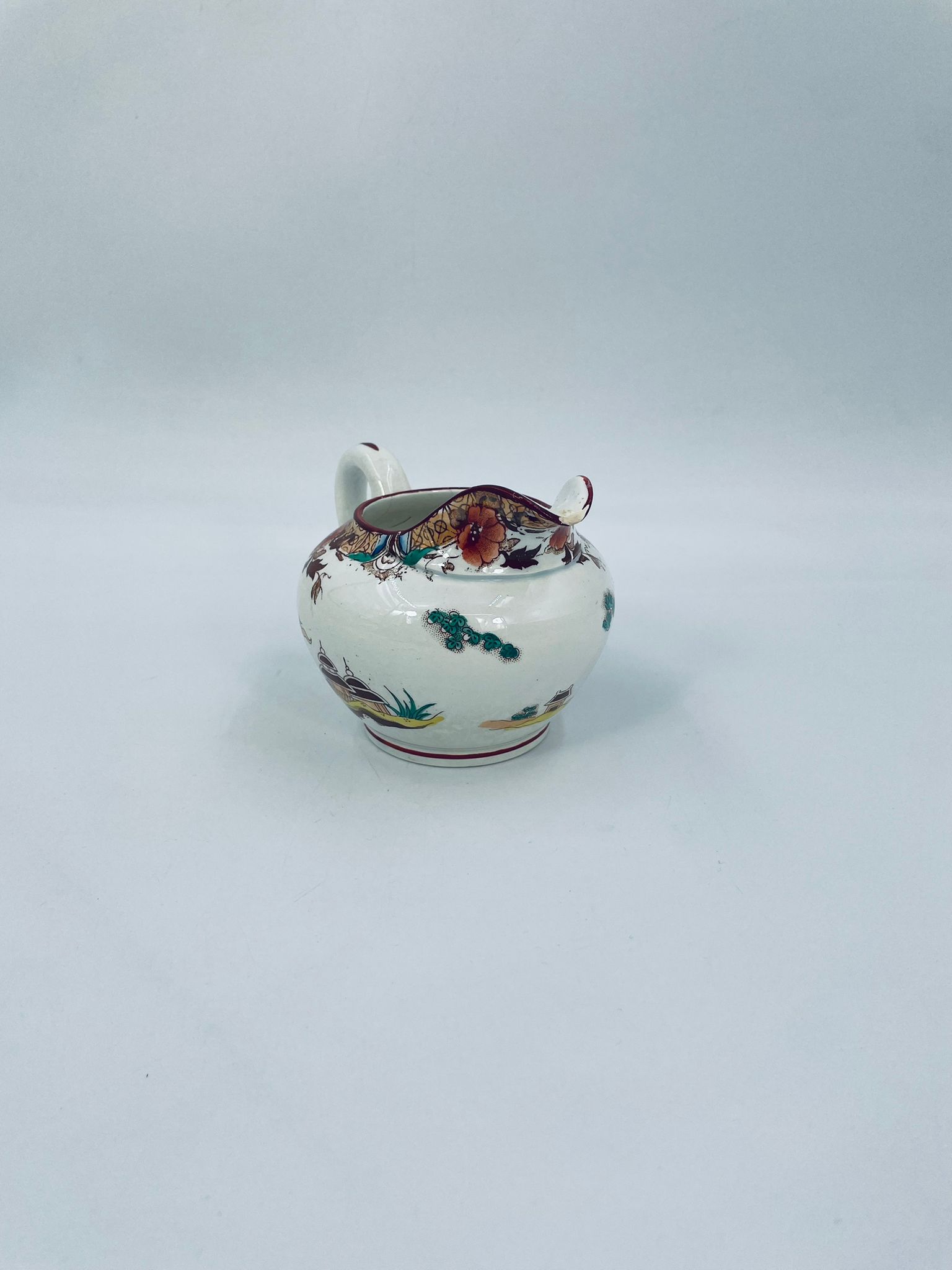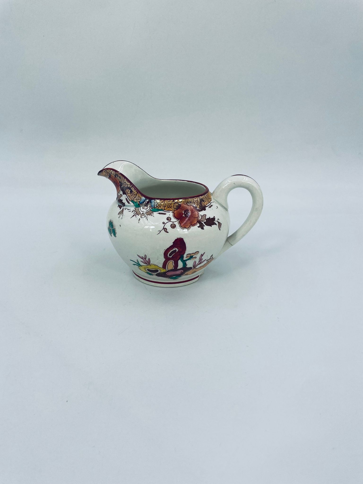 Dzbanuszek na mleko antyczny, francuskiej wytwórni Opaque de Sarreguemines która została założona w 1790r, wykonany z fajansu. Mlecznik charakteryzuje się recznie malowanym, bogatym, wielokolorowym wzorem, który obejmuje zarówno motywy orientalne , jak i kwiatowe, wykończony kolorem bordowym na krawędzi. Jest to przedmiot kolekcjonerski o wartości antykwarycznej. Posiada uszczerbek, pęknięcia oraz przetarcie na kolorze.