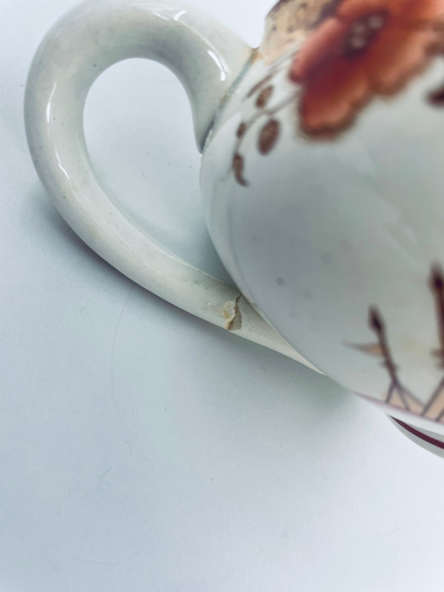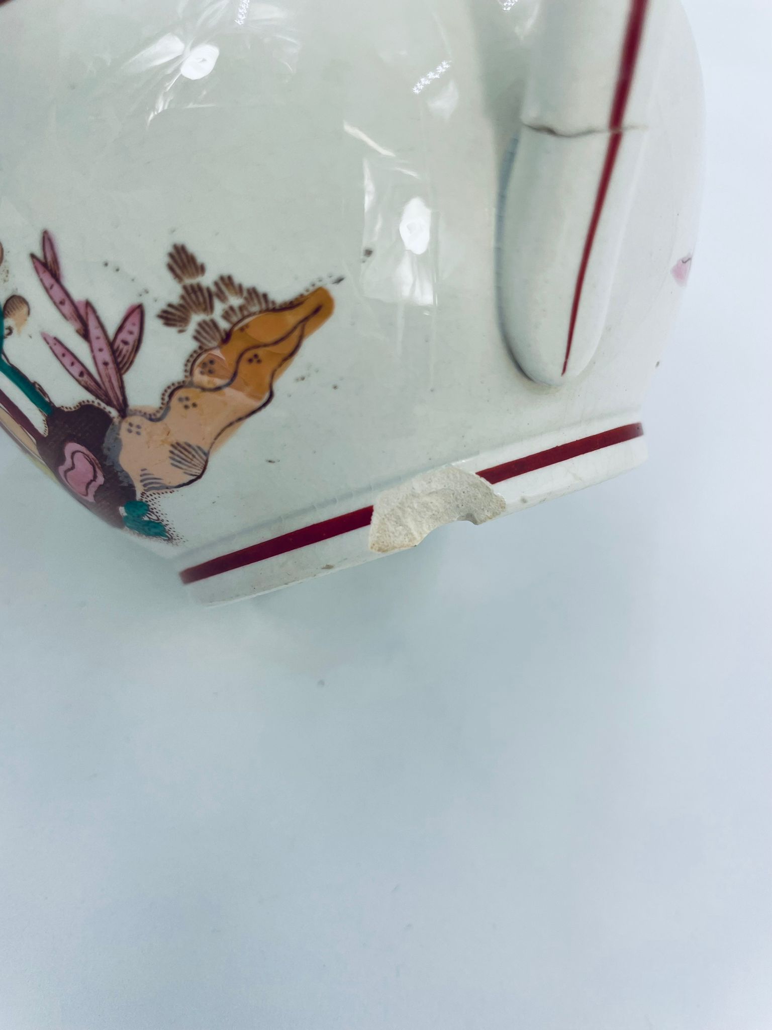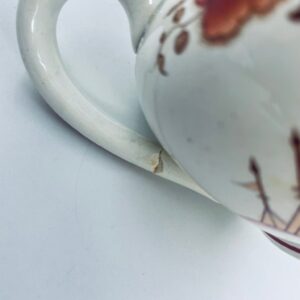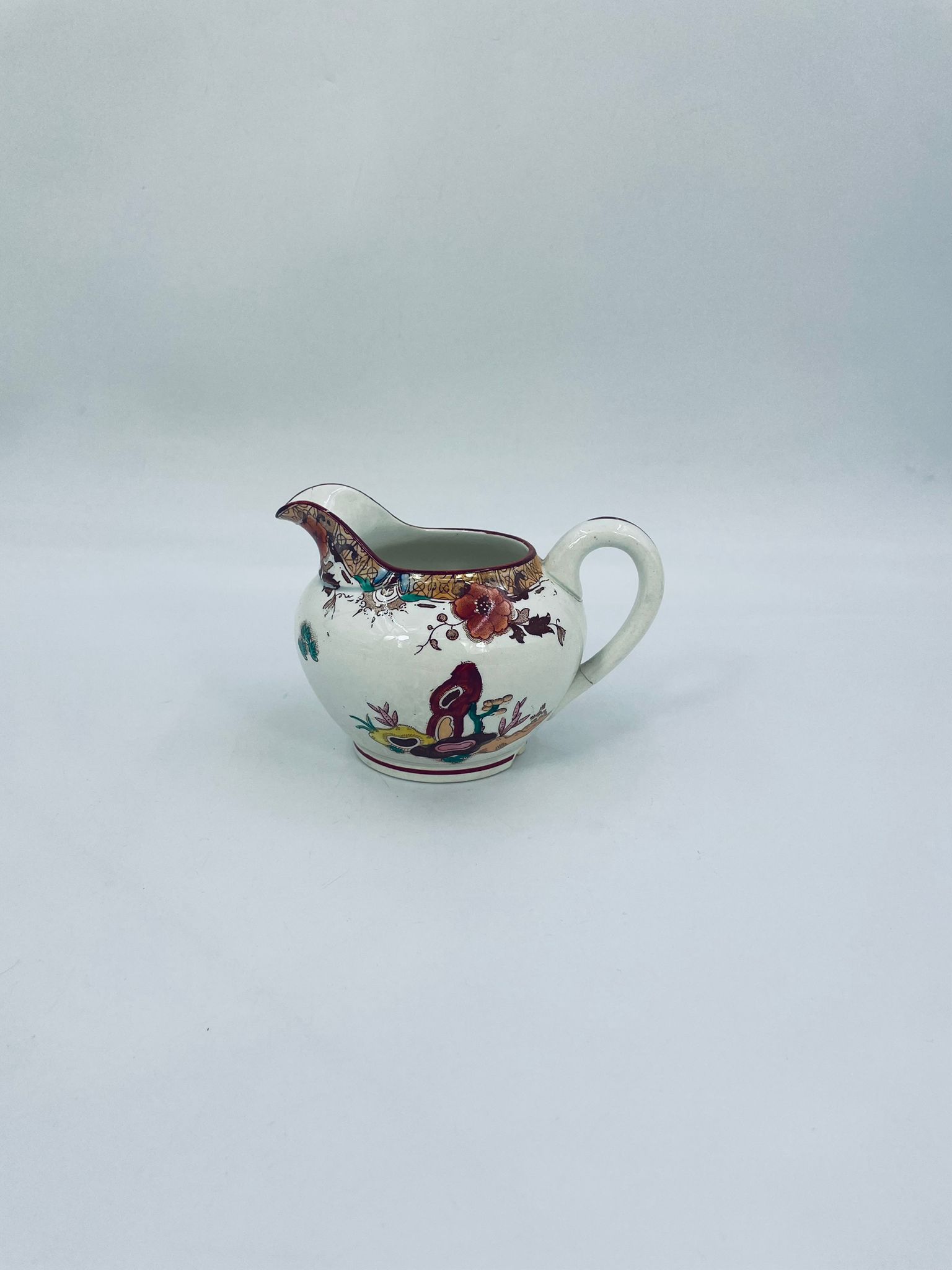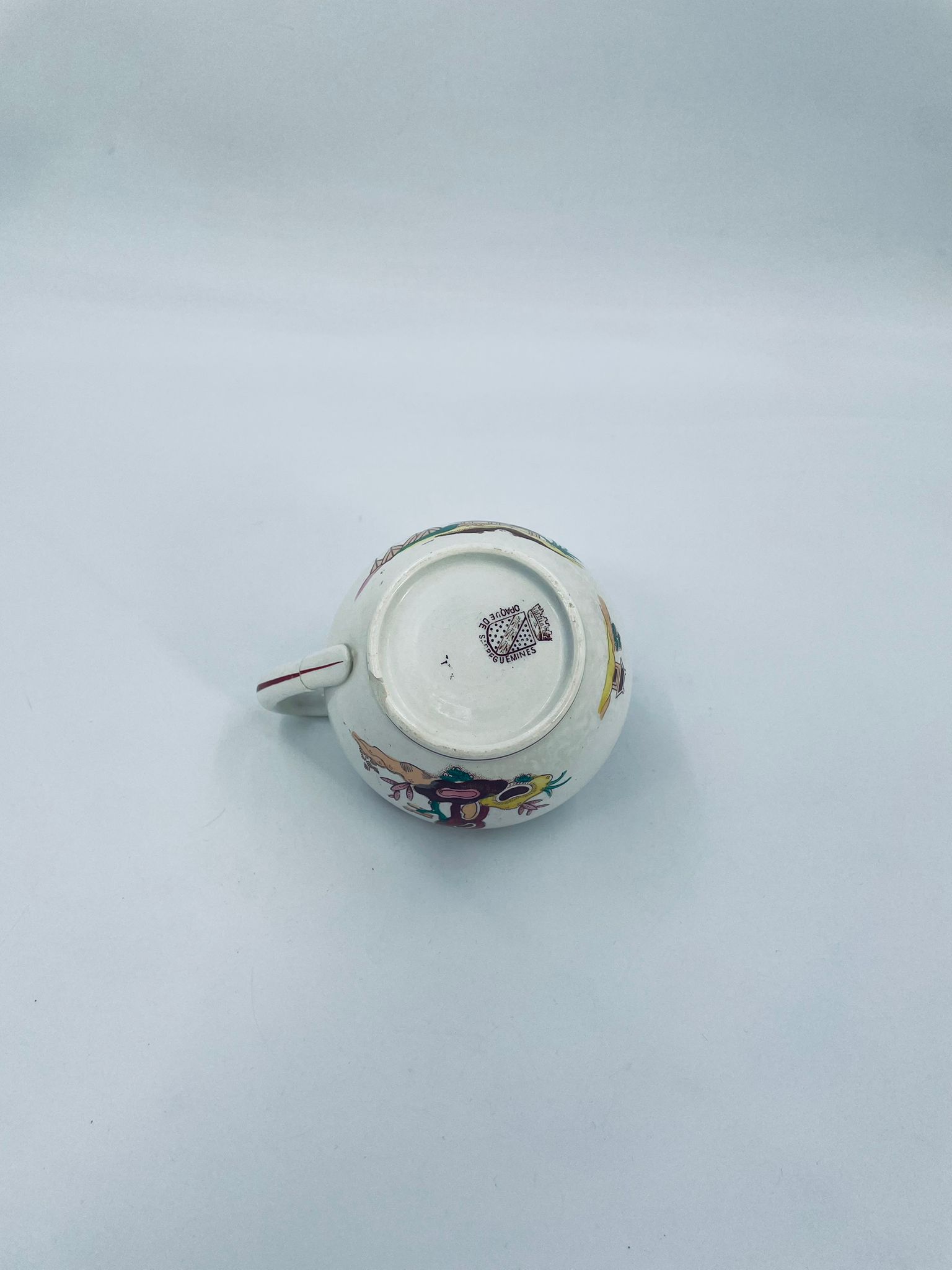 Dzbanuszek na mleko antyczny, francuskiej wytwórni Opaque de Sarreguemines która została założona w 1790r, wykonany z fajansu. Mlecznik charakteryzuje się recznie malowanym, bogatym, wielokolorowym wzorem, który obejmuje zarówno motywy orientalne , jak i kwiatowe, wykończony kolorem bordowym na krawędzi. Jest to przedmiot kolekcjonerski o wartości antykwarycznej. Posiada uszczerbek, pęknięcia oraz przetarcie na kolorze.