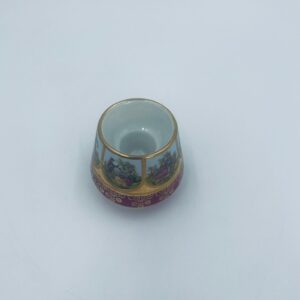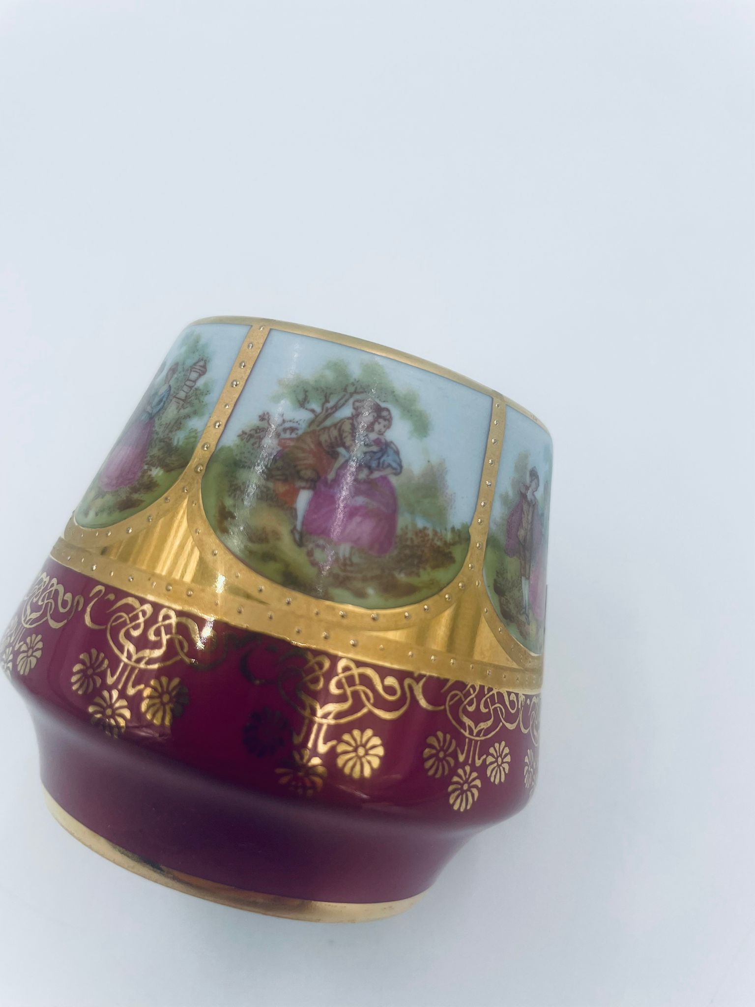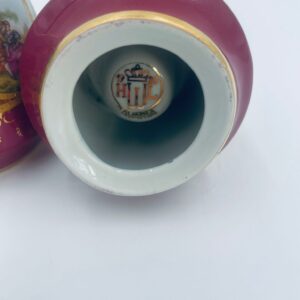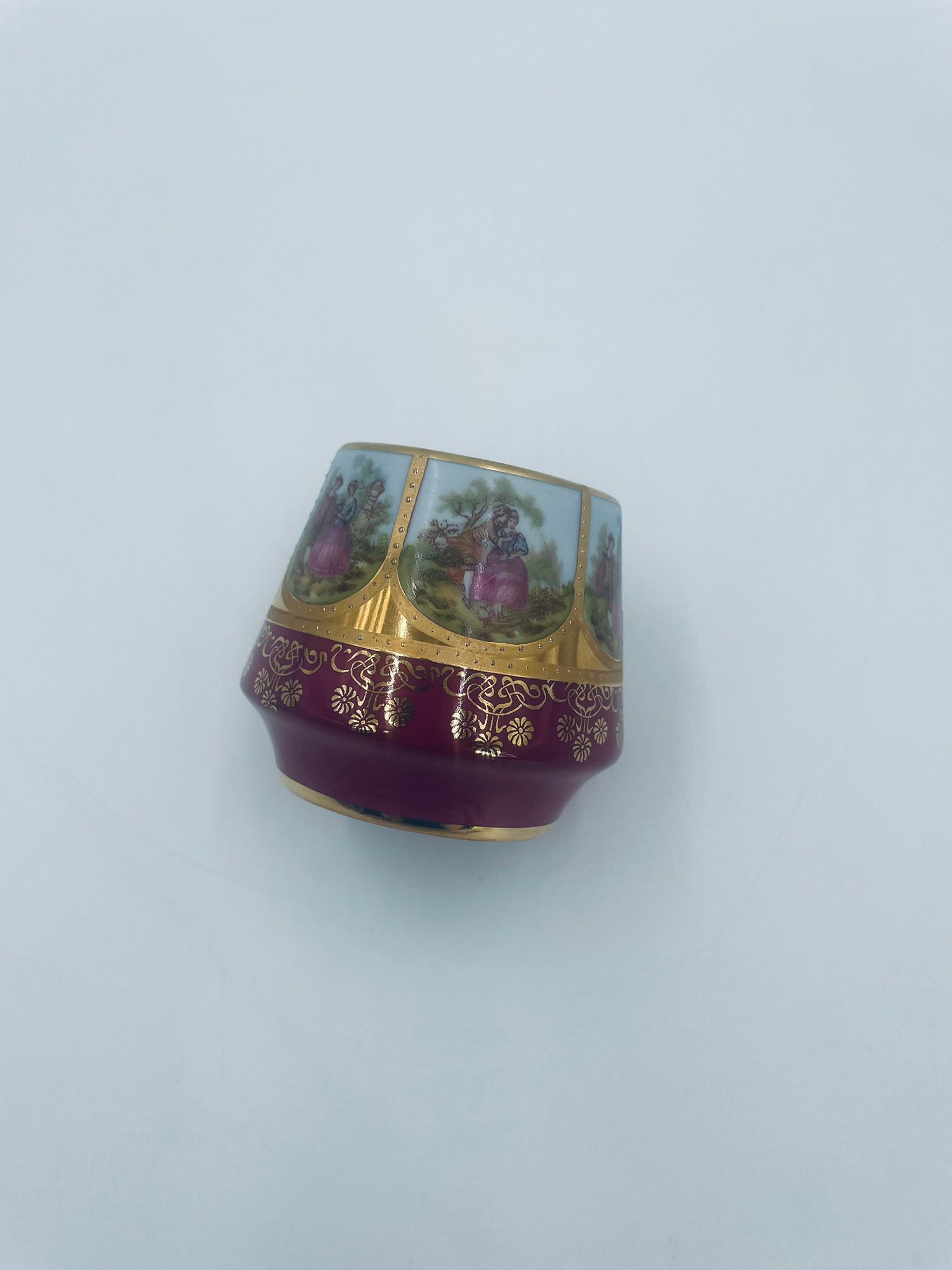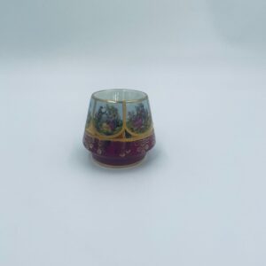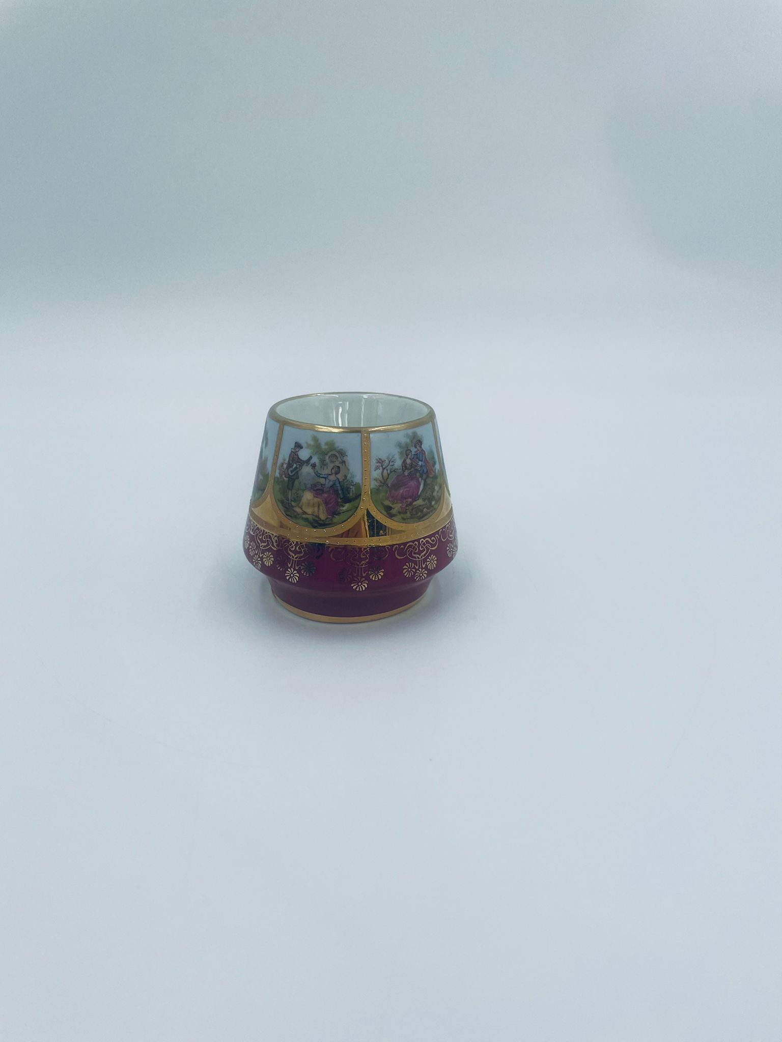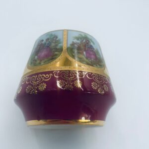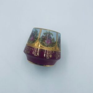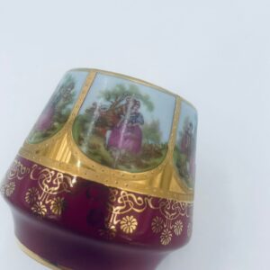 Antyczny świecznik dekoracyjny wytwórni HWL Bavaria , datowany na 1926r., wykonany z wysokiej jakości porcelany. Świecznik charakteryzuje się ręcznym, bogatym złoceniem , medalionami przedstawiającymi barokowe scenki rodzajowe oraz złotymi ornamentami na bordowym tle, wykończony złoceniem na krawędzi.