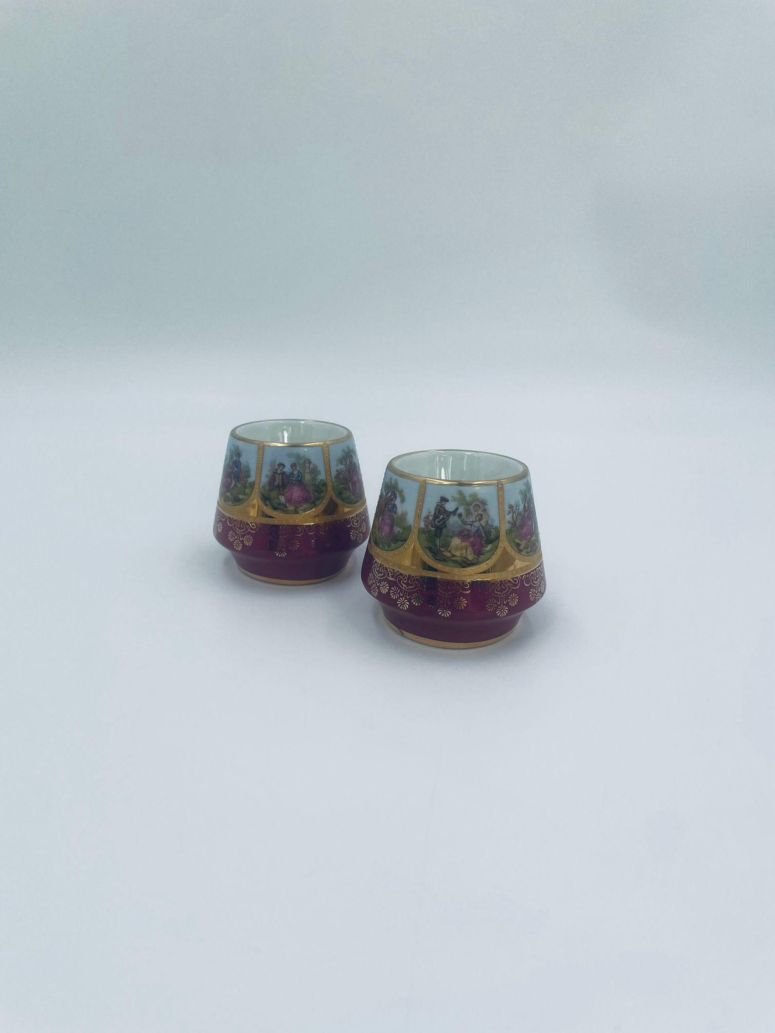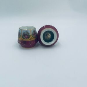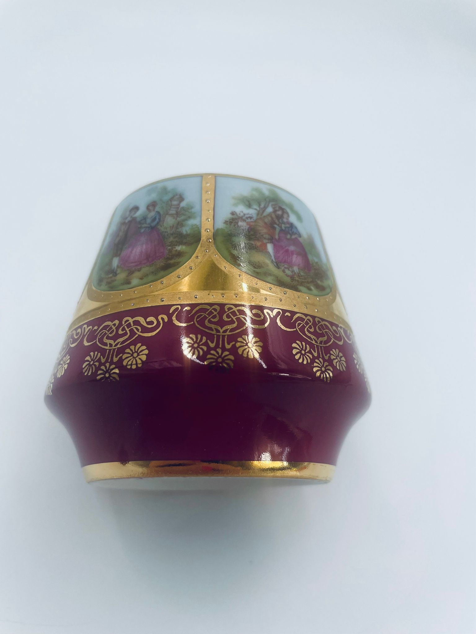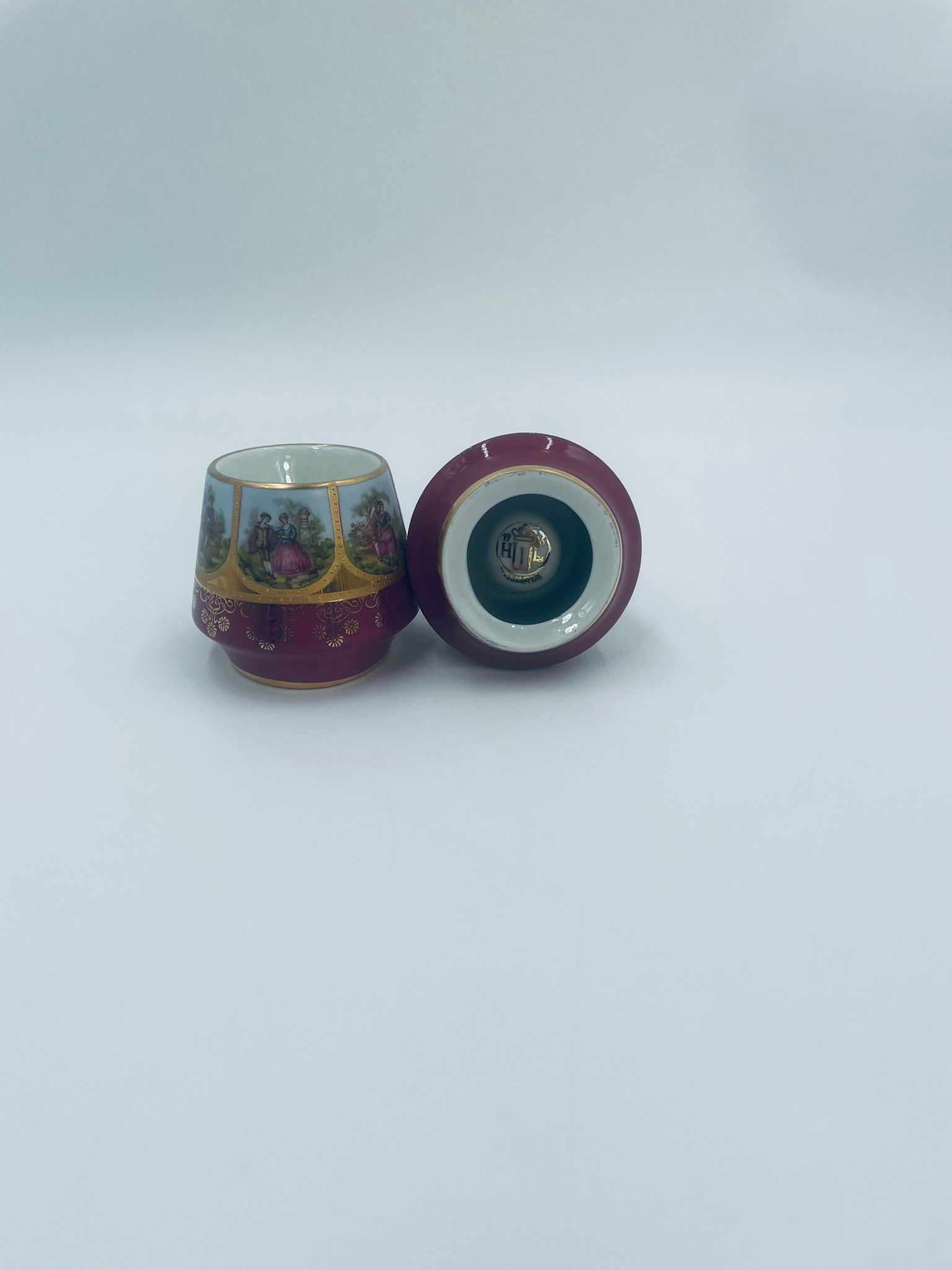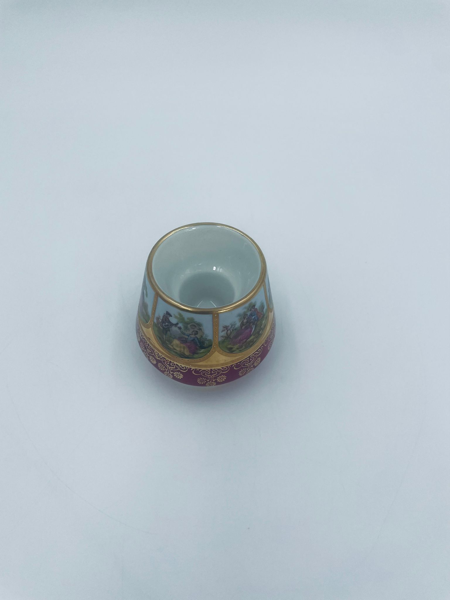 Antyczny świecznik dekoracyjny wytwórni HWL Bavaria , datowany na 1926r., wykonany z wysokiej jakości porcelany. Świecznik charakteryzuje się ręcznym, bogatym złoceniem , medalionami przedstawiającymi barokowe scenki rodzajowe oraz złotymi ornamentami na bordowym tle, wykończony złoceniem na krawędzi.