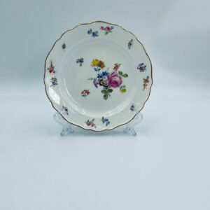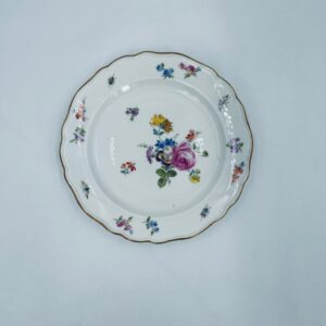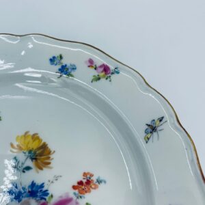 Antyczny talerz deserowy królewskiej manufaktury Miśnia Meissen, wykonany z wysokiej jakości białej porcelany. Talerz charakteryzuje się ręcznie malowanym wzorem kwiatowym, wzorem motyli oraz złoceniem na falowanym rancie.