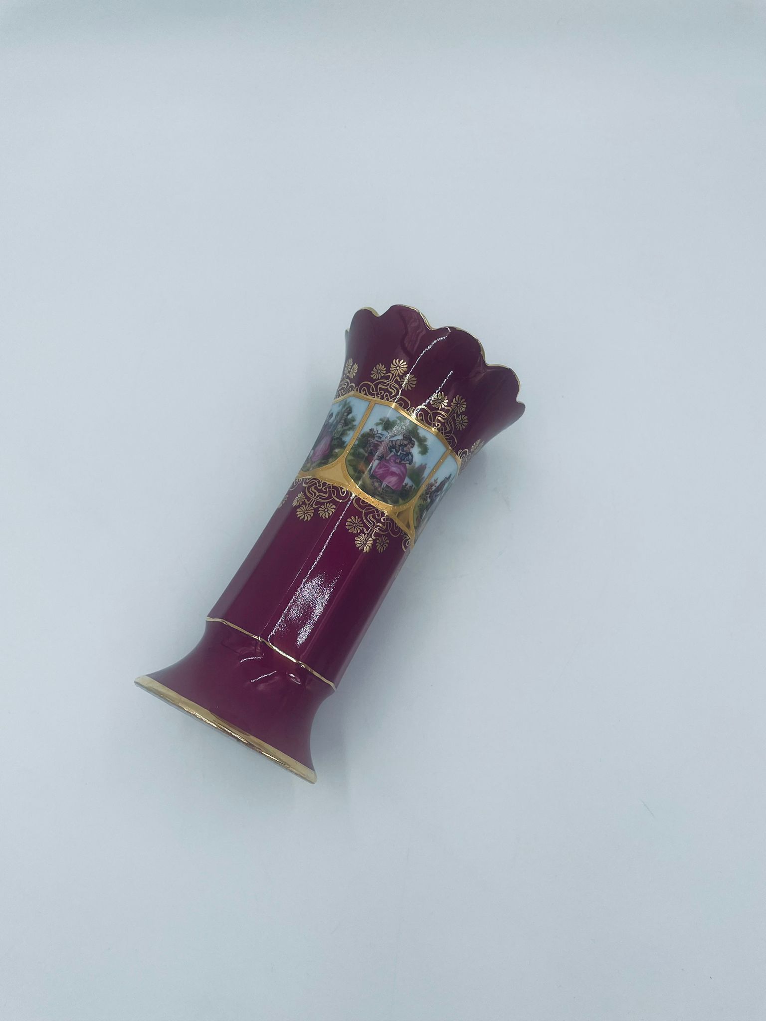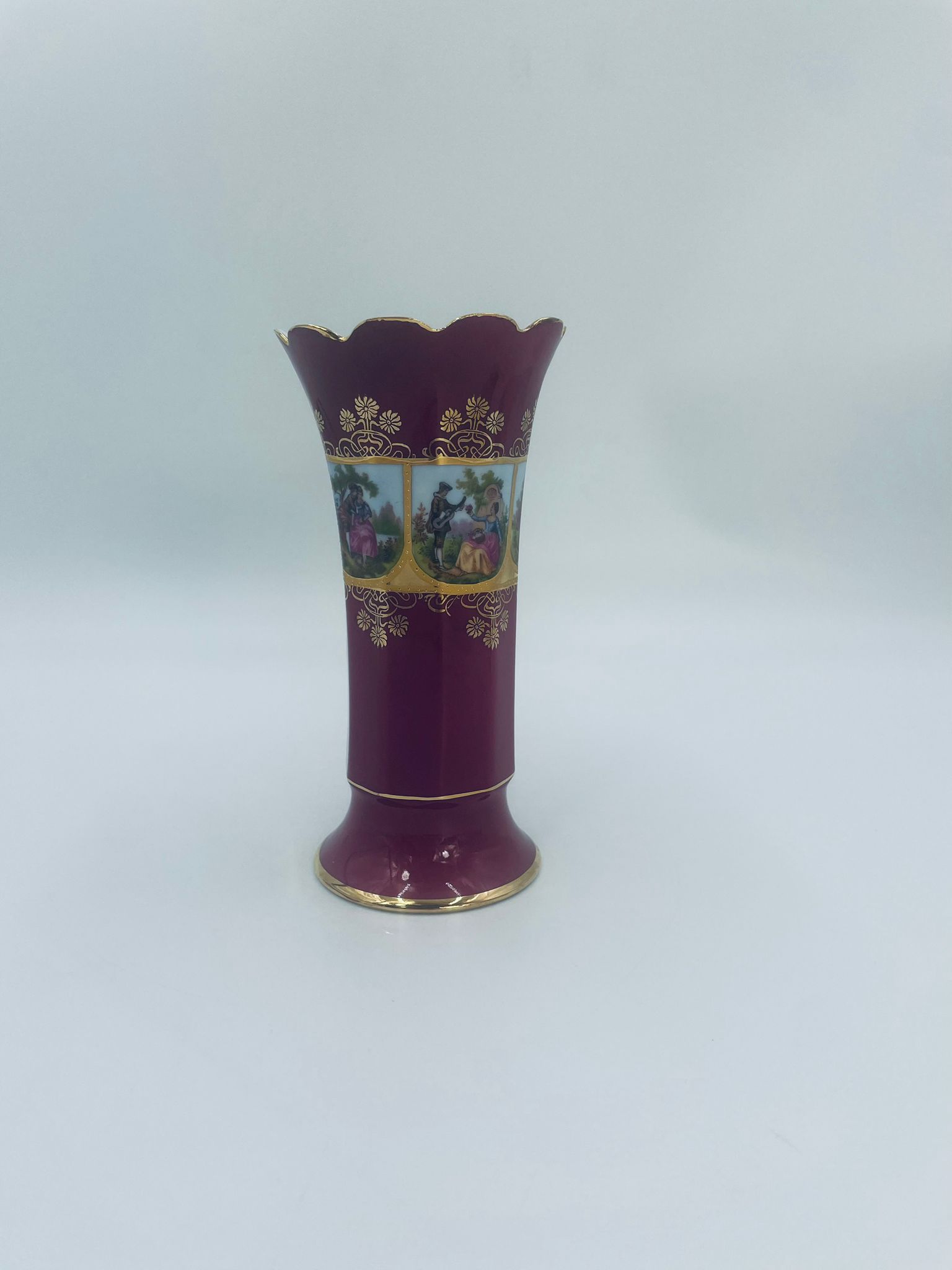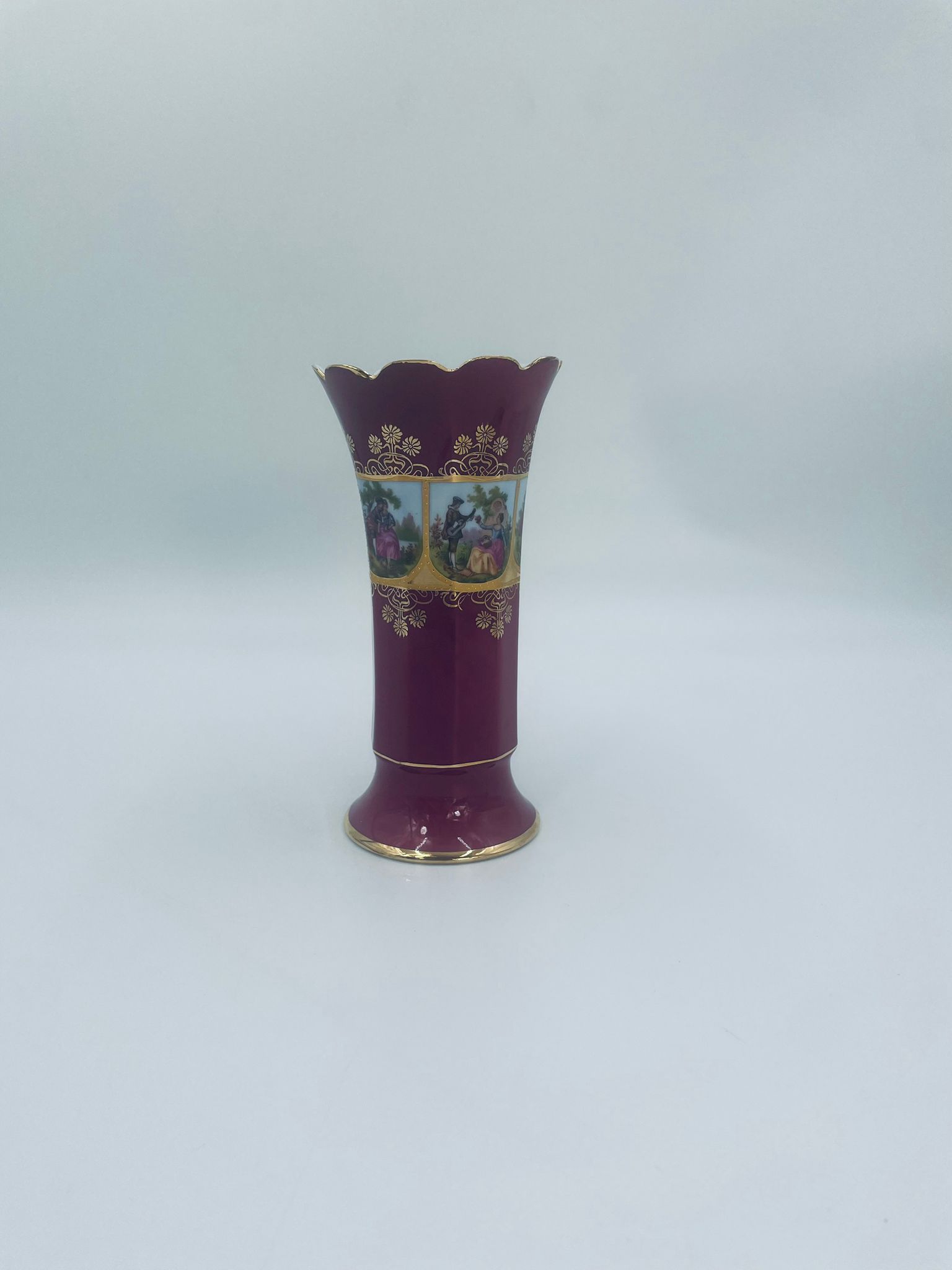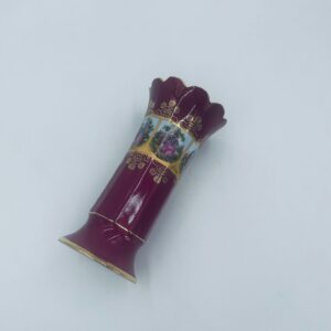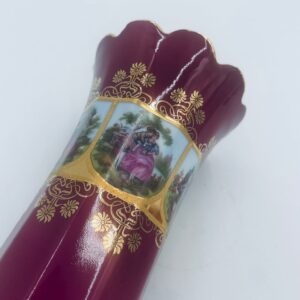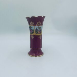 Antyczny wazon dekoracyjny wytwórni Paul Leitner Wiesau, datowany na 1926r., wykonany z wysokiej jakości porcelany. Wazon charakteryzuje się ręcznym, bogatym złoceniem, medalionami przedstawiającymi barokowe scenki rodzajowe oraz złotymi ornamentami na bordowym tle, wykończony złoceniem na falistej krawędzi. Posiada przetarcie na złoceniu.