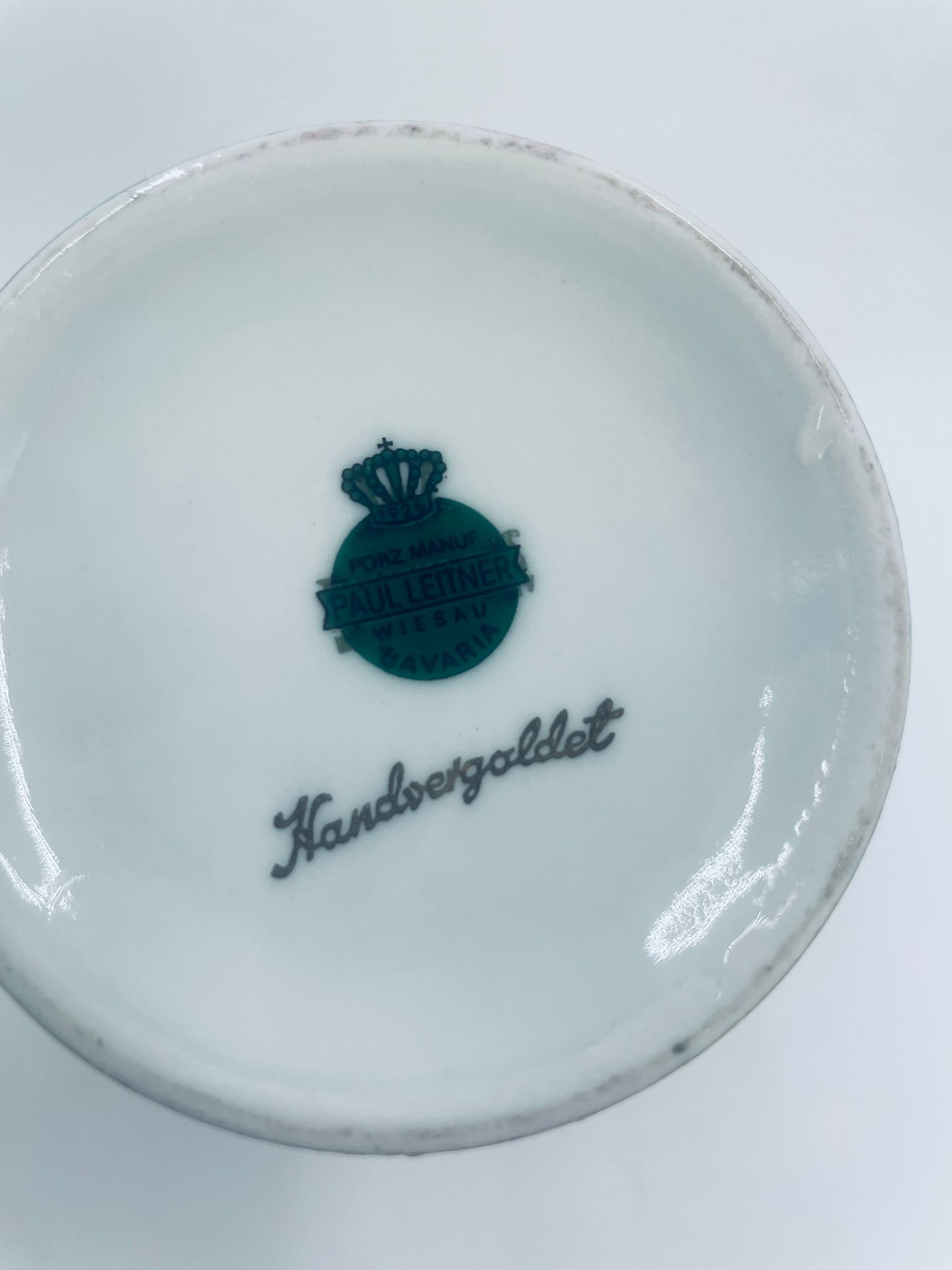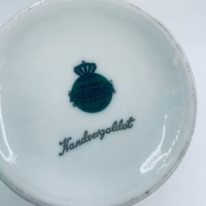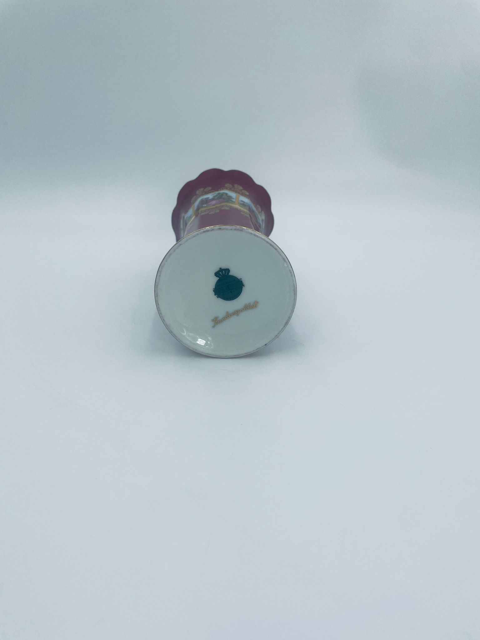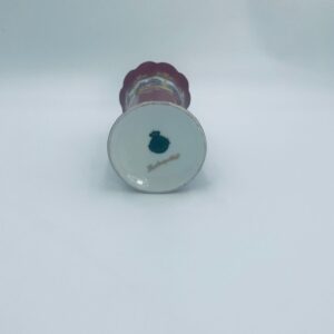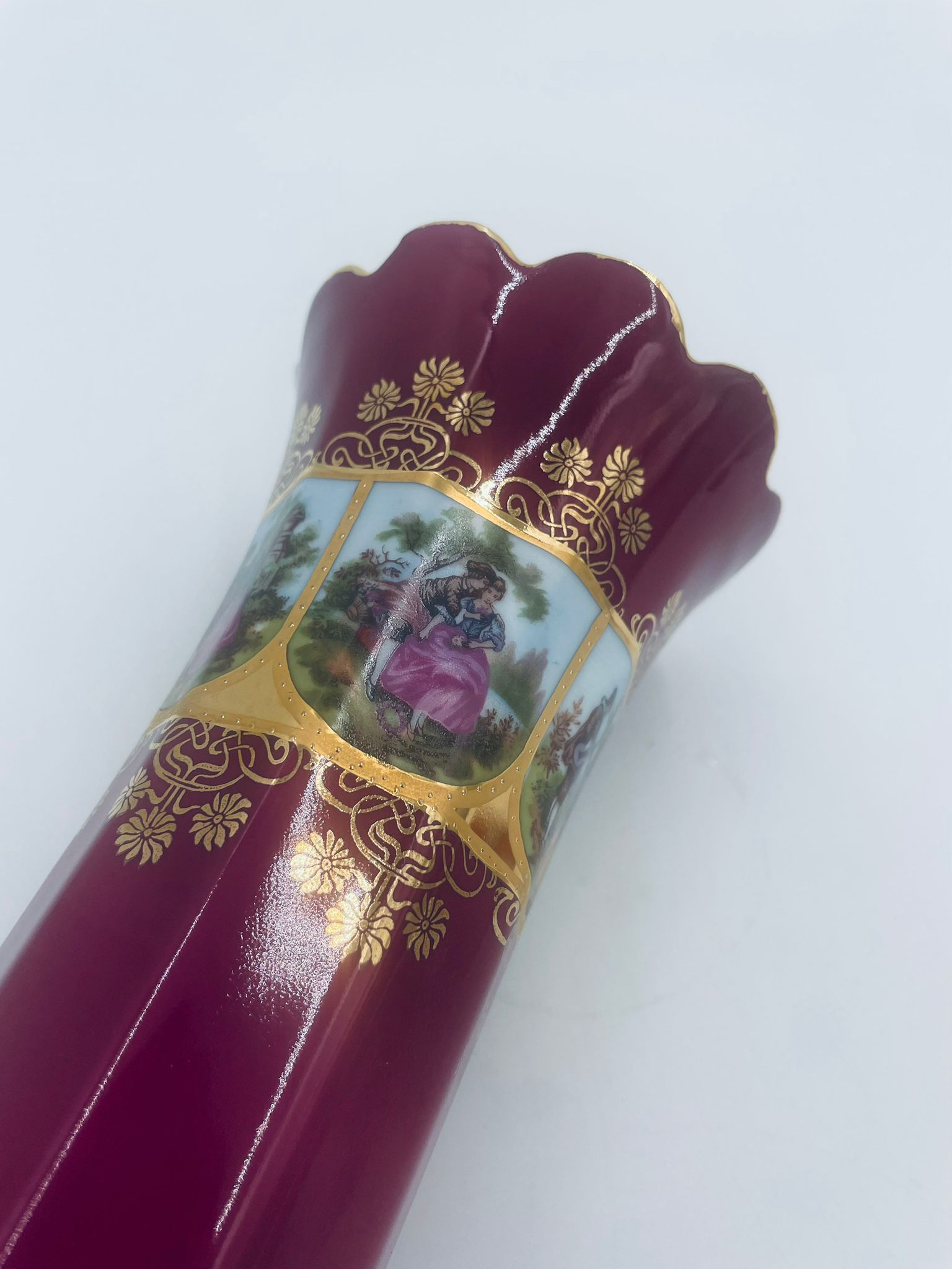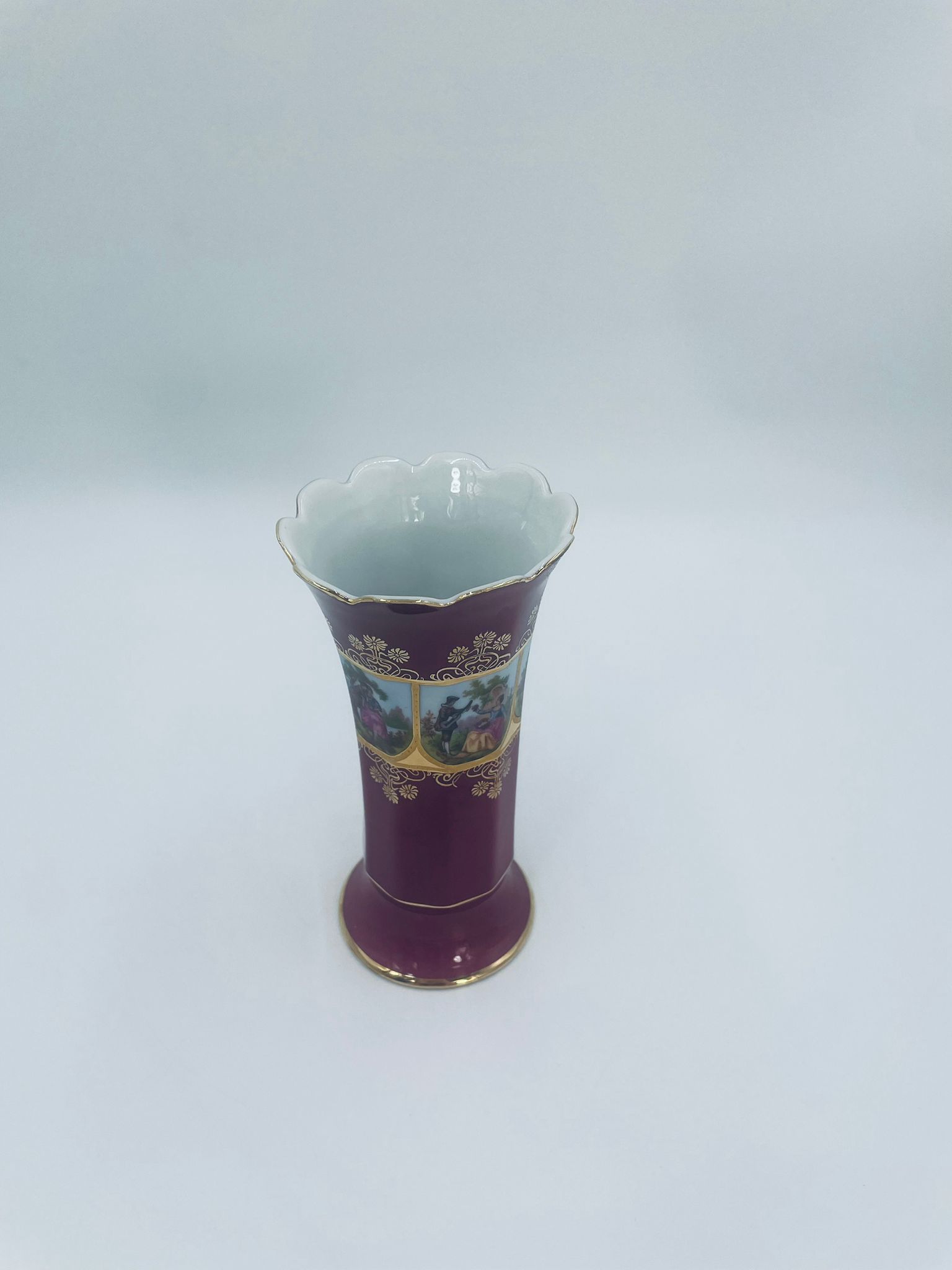 Antyczny wazon dekoracyjny wytwórni Paul Leitner Wiesau, datowany na 1926r., wykonany z wysokiej jakości porcelany. Wazon charakteryzuje się ręcznym, bogatym złoceniem, medalionami przedstawiającymi barokowe scenki rodzajowe oraz złotymi ornamentami na bordowym tle, wykończony złoceniem na falistej krawędzi. Posiada przetarcie na złoceniu.