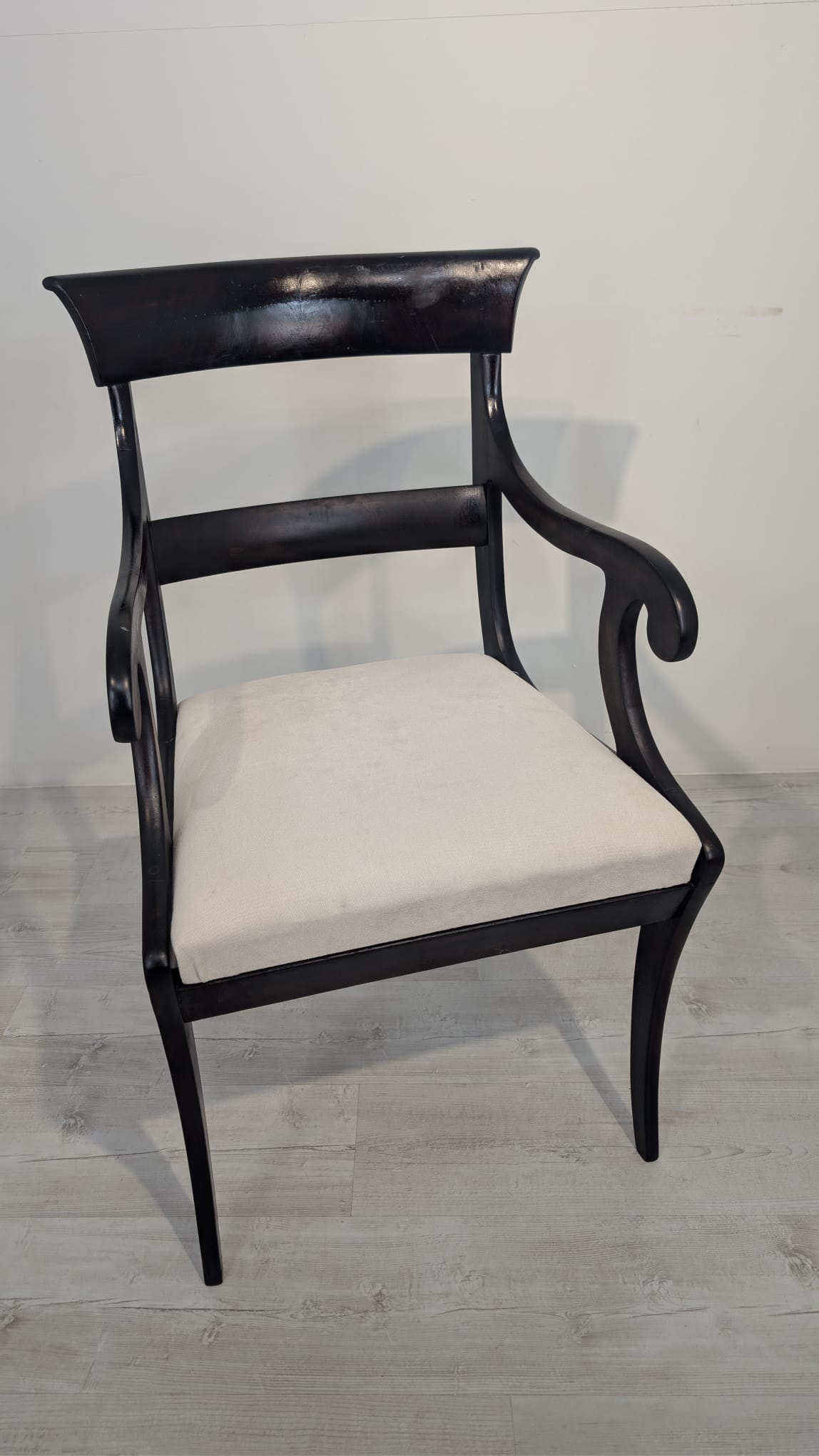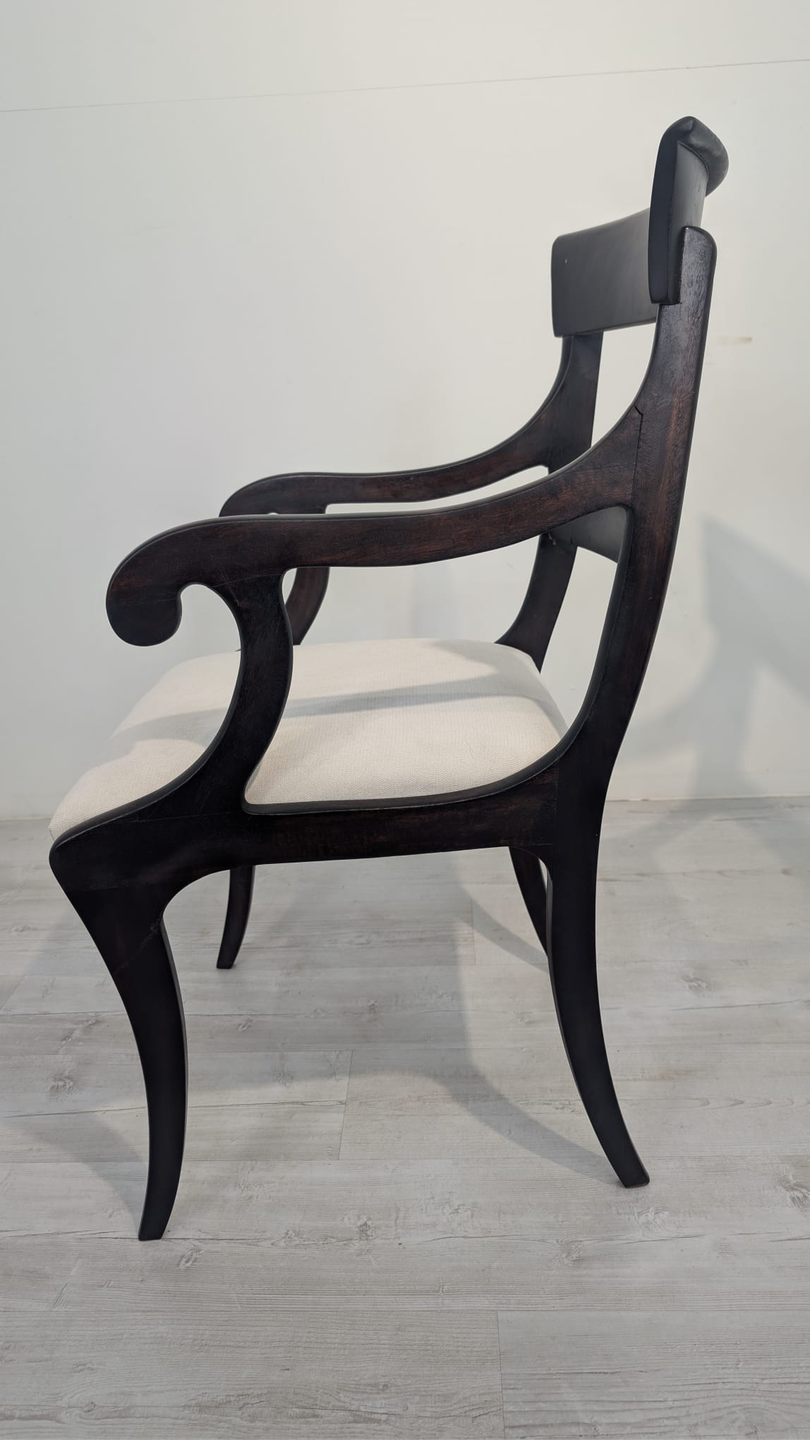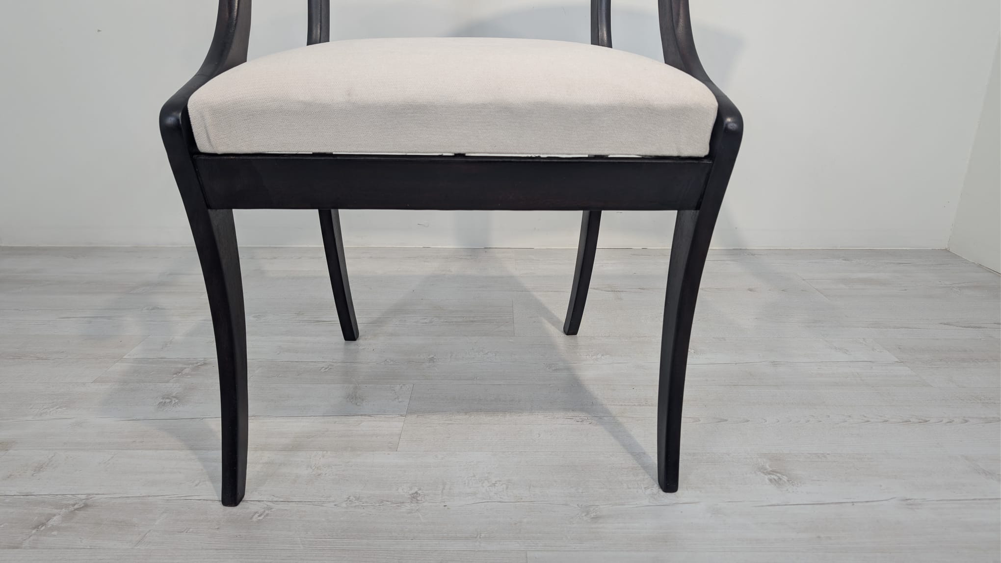 Stylowy fotel Biedermeier z początku XX wieku. Mebel w dobrym stanie, wykonany z drewna w ciemnym kolorze. Posiada charakterystyczne dla tego stylu łagodne, zaokrąglone kształty. Fotel będzie doskonałym dodatkiem do klasycznego lub vintage’owego wnętrza.