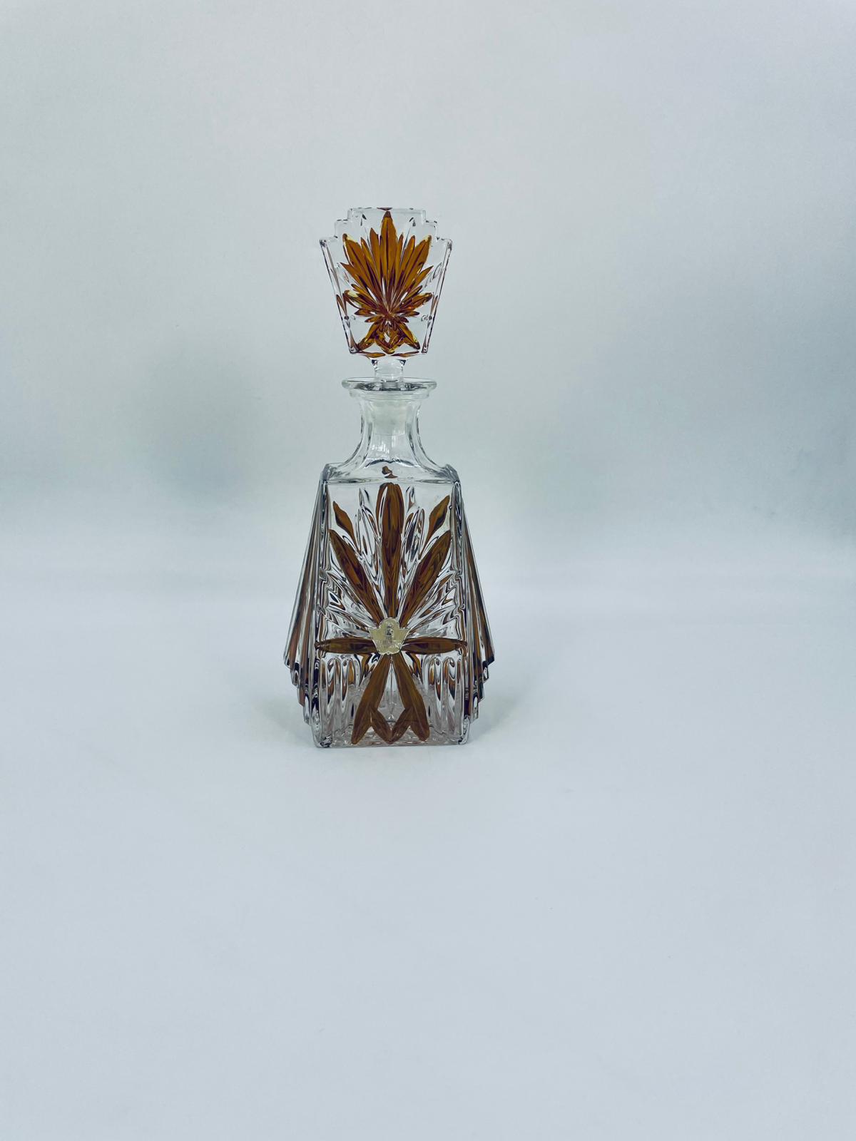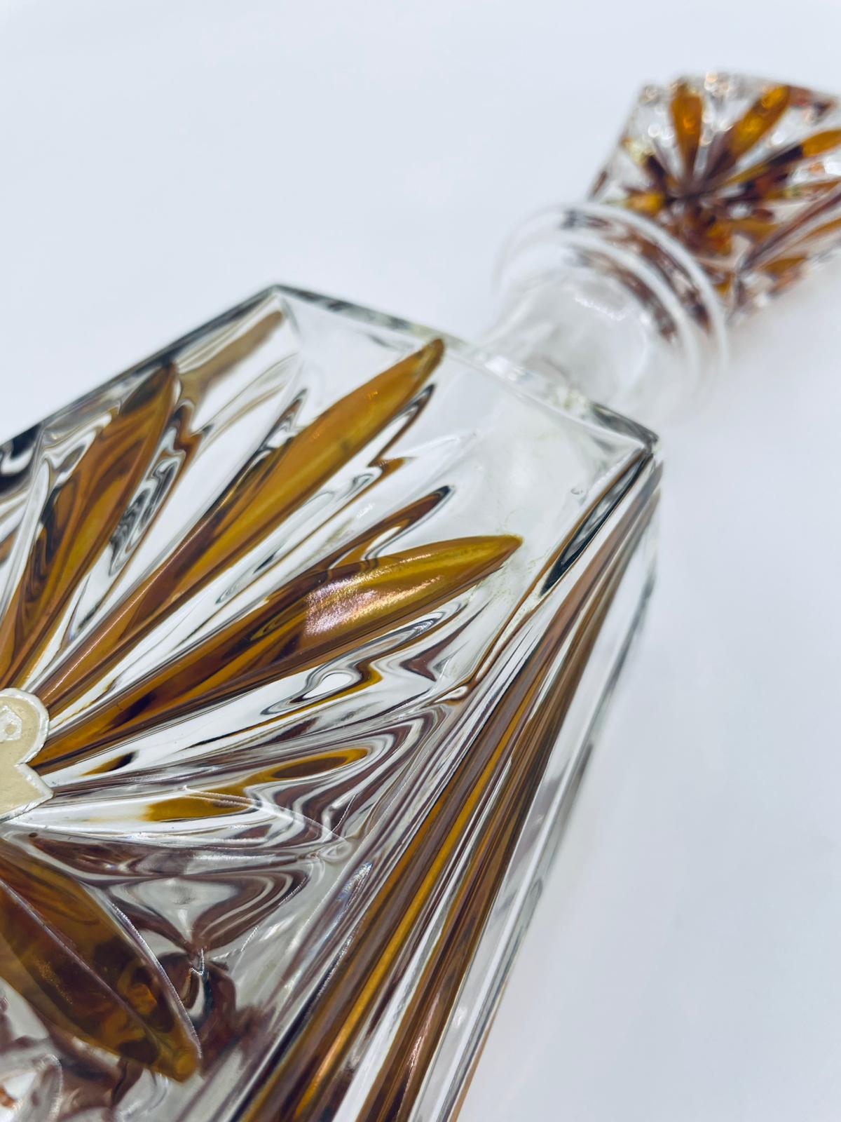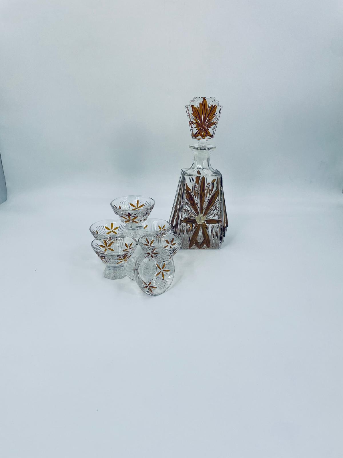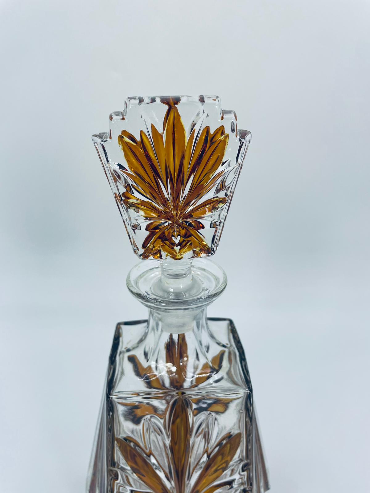 Art Deco style decanter set with six glasses, made of high quality lead crystal glass. The beautiful set is characterised by geometric shapes and stylised amber decorations. The decanter has a decorative matching stopper. Wide-bottomed glasses on decorative legs. One glass has a small damage to the base.