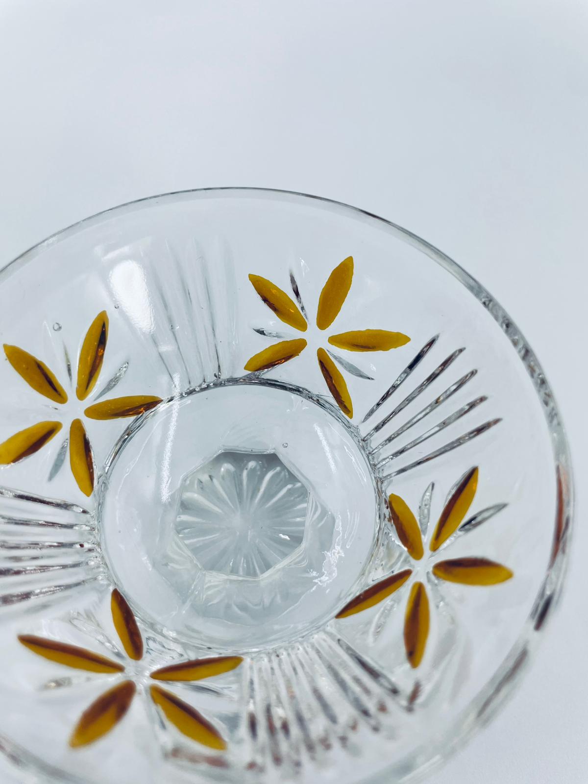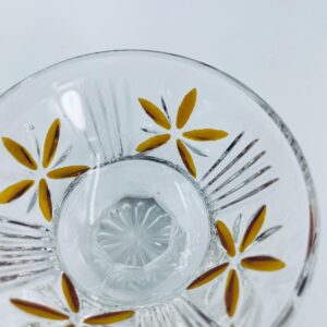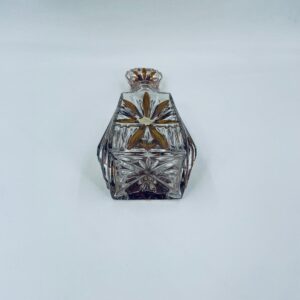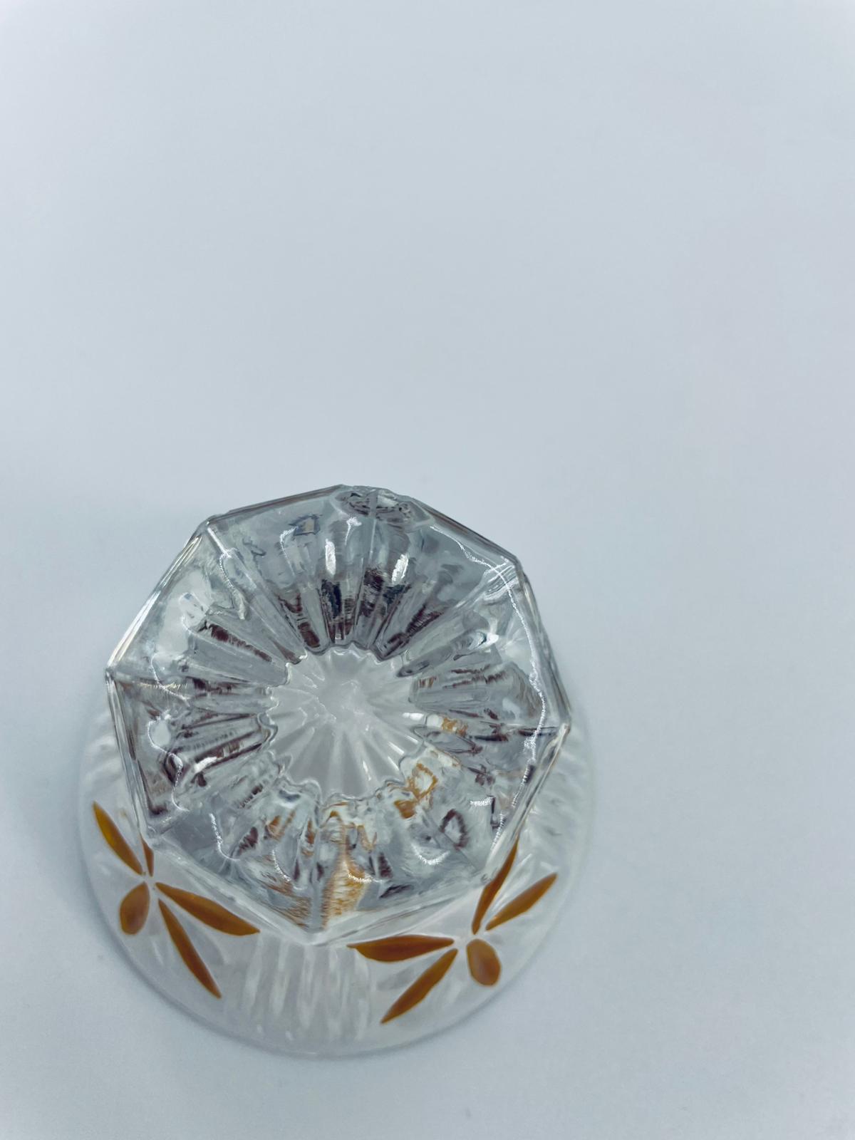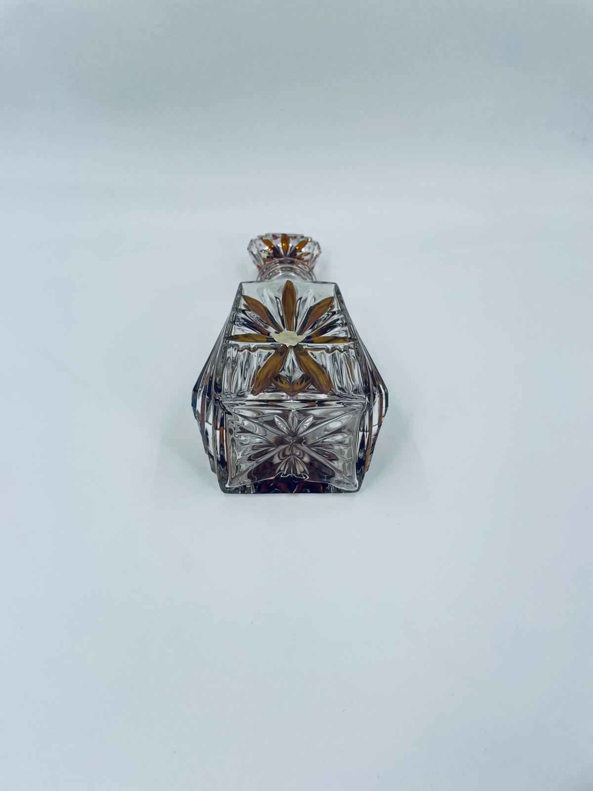 Art Deco style decanter set with six glasses, made of high quality lead crystal glass. The beautiful set is characterised by geometric shapes and stylised amber decorations. The decanter has a decorative matching stopper. Wide-bottomed glasses on decorative legs. One glass has a small damage to the base.