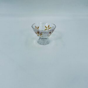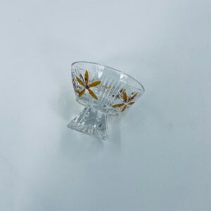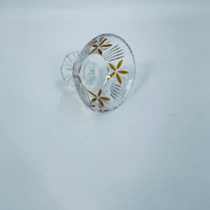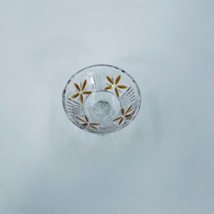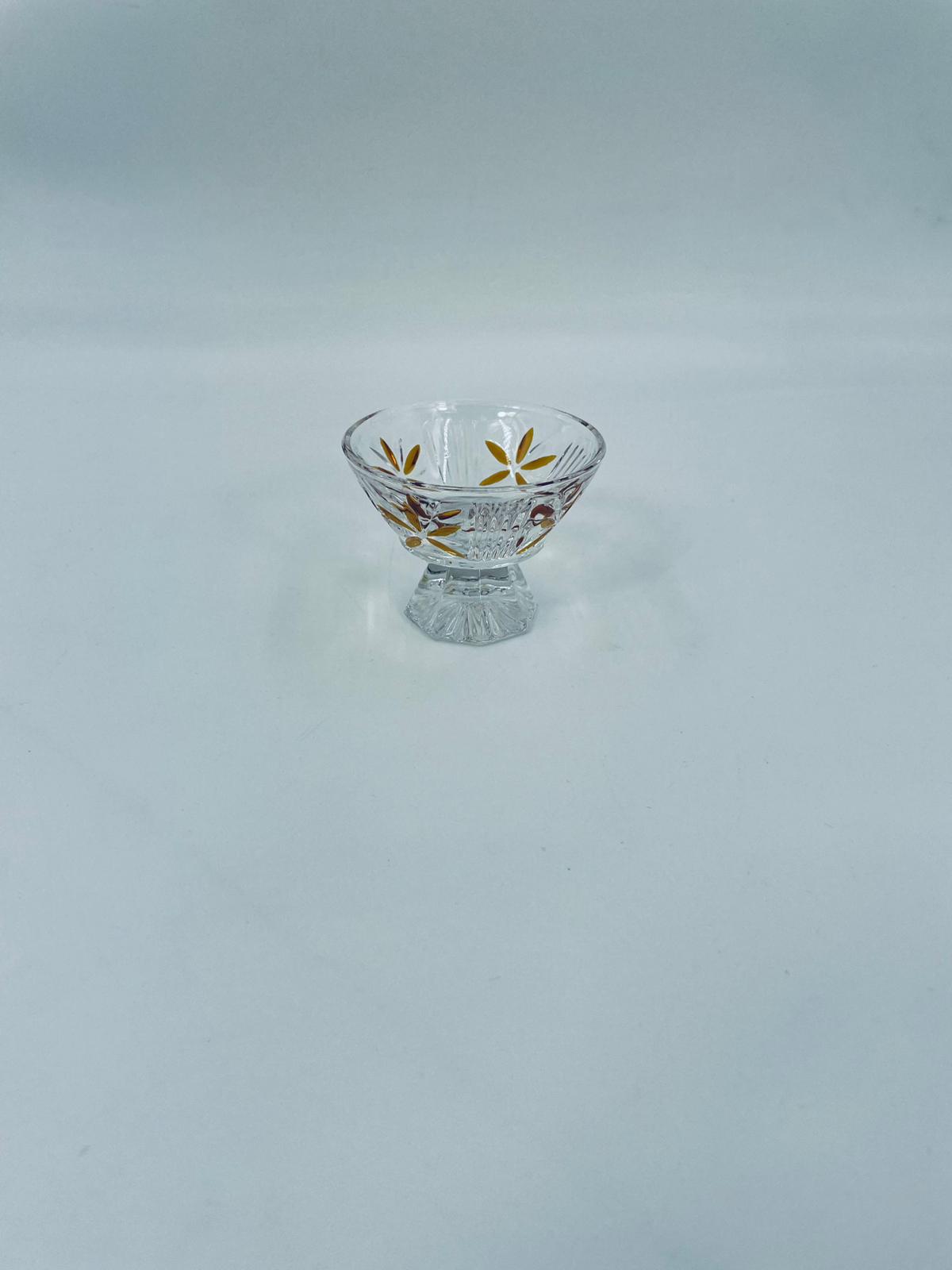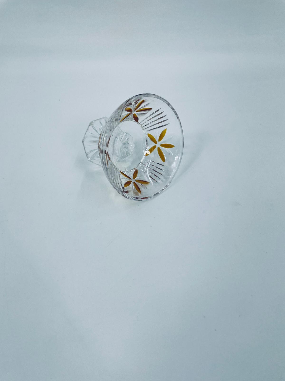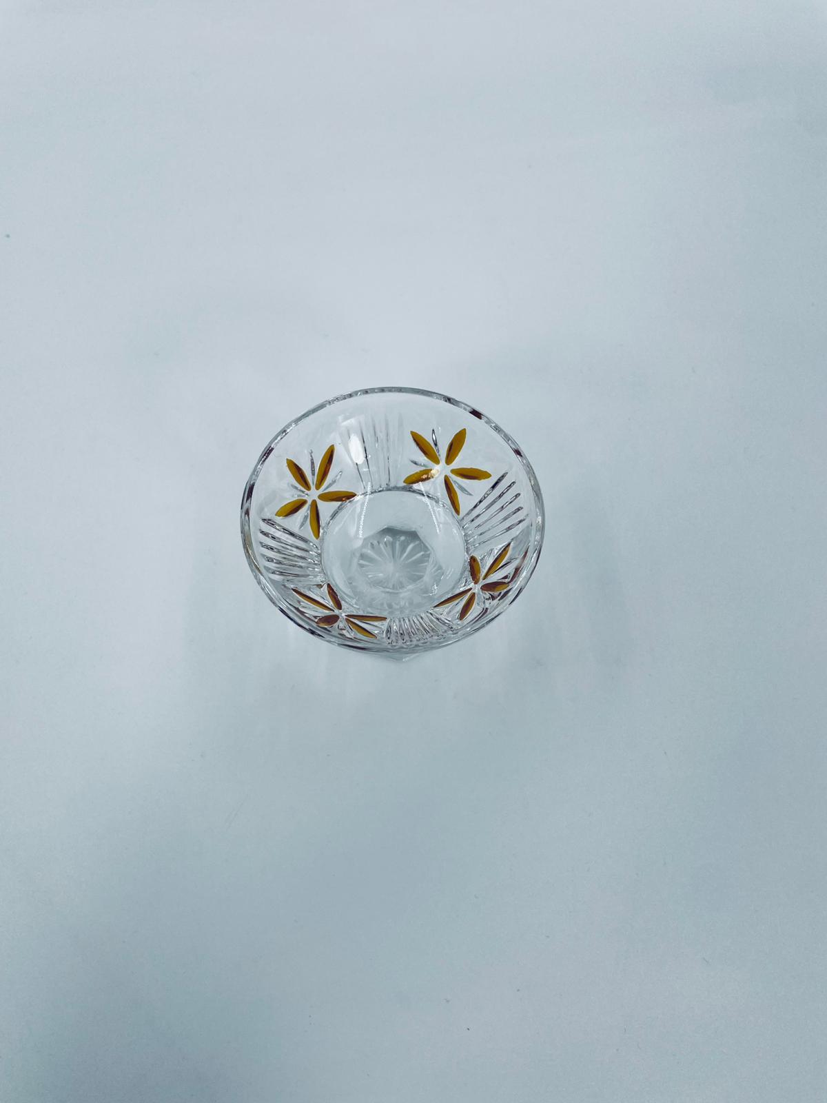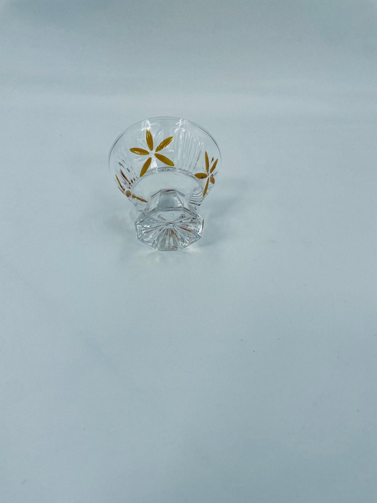 Art Deco style decanter set with six glasses, made of high quality lead crystal glass. The beautiful set is characterised by geometric shapes and stylised amber decorations. The decanter has a decorative matching stopper. Wide-bottomed glasses on decorative legs. One glass has a small damage to the base.
