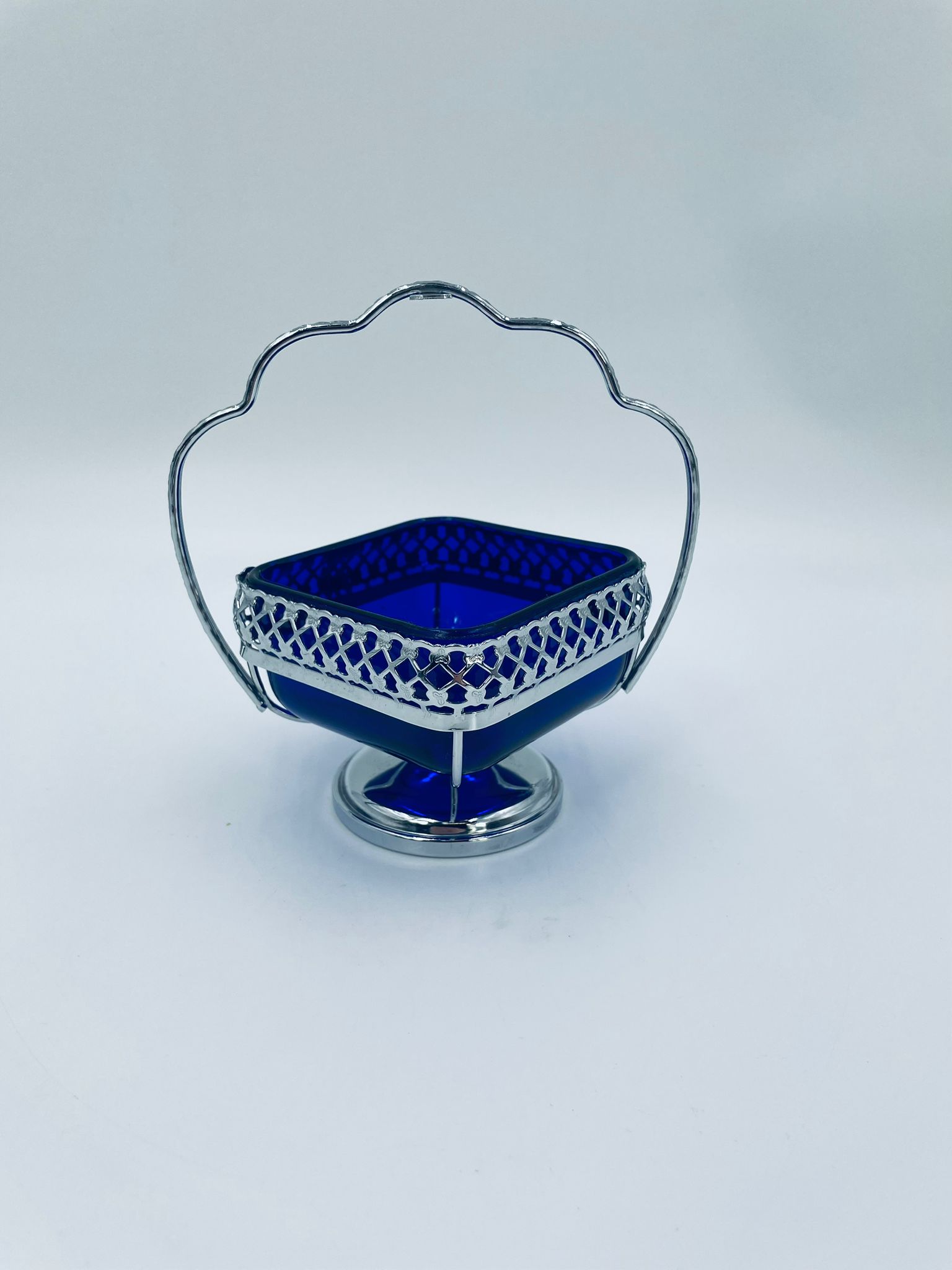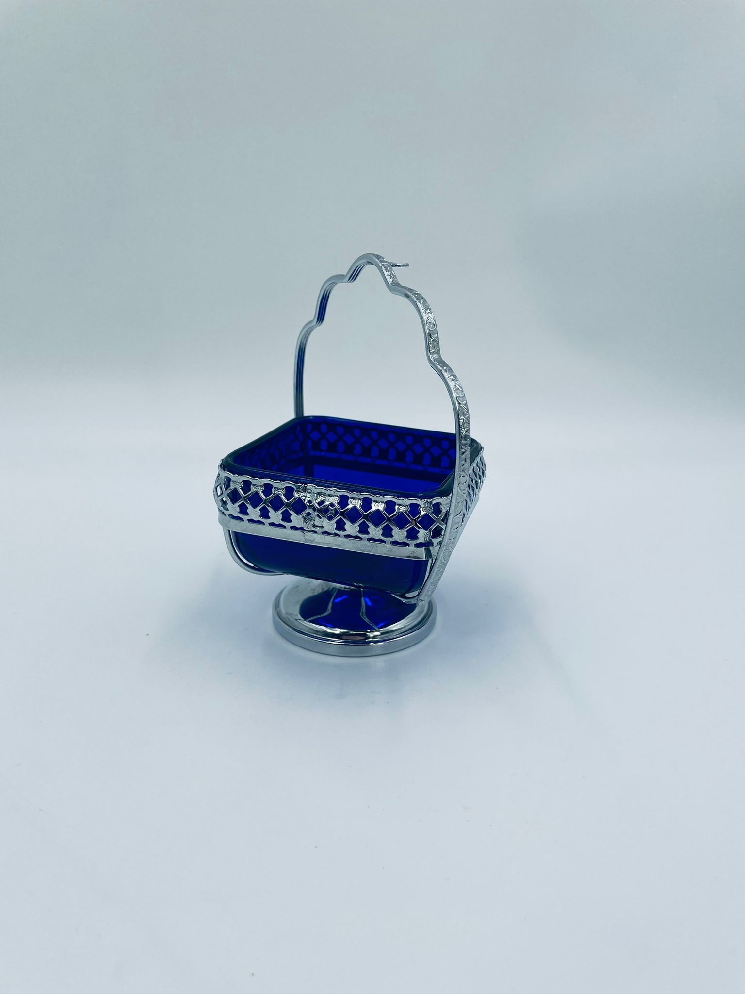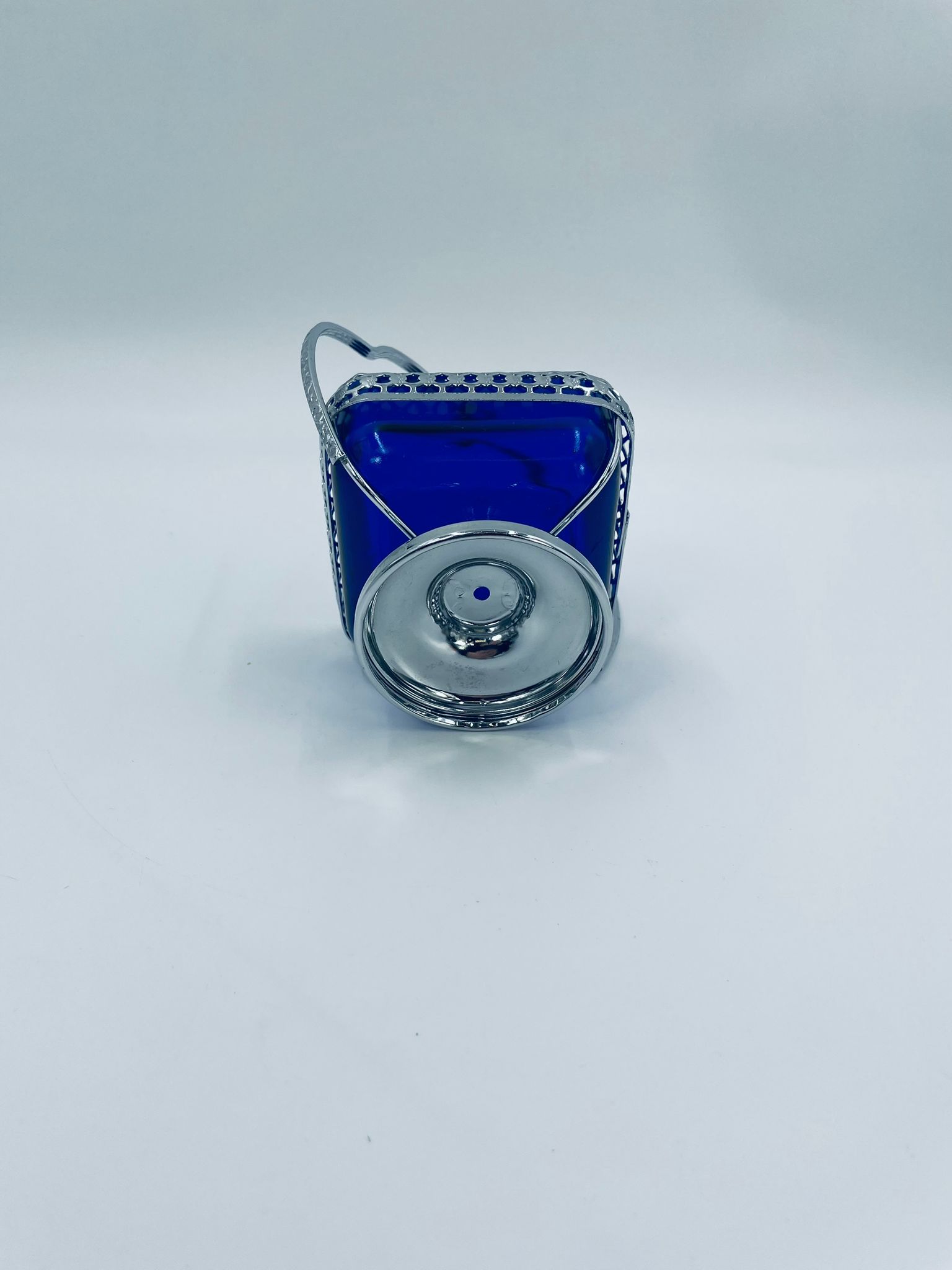 Sugar bowl, Bomboniera in Art Deco style, sugar bowl made of high quality cobalt coloured glass, set in a plated openwork basket with a decorative handle.