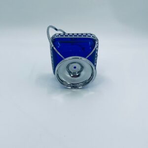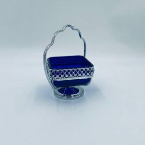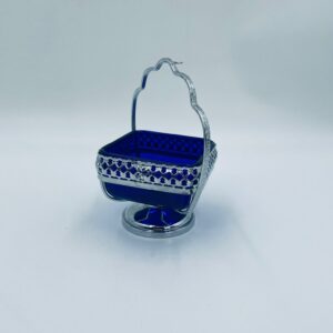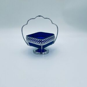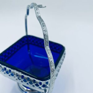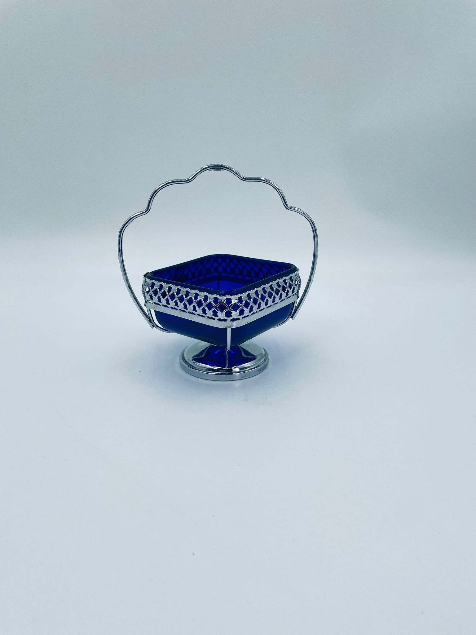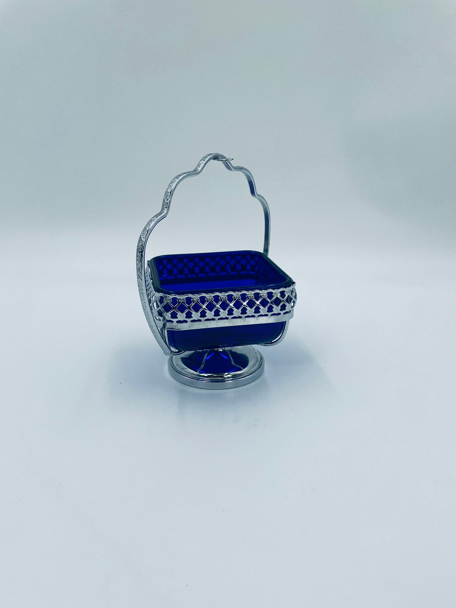 Sugar bowl, Bomboniera in Art Deco style, sugar bowl made of high quality cobalt coloured glass, set in a plated openwork basket with a decorative handle.