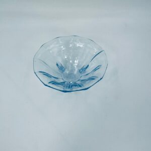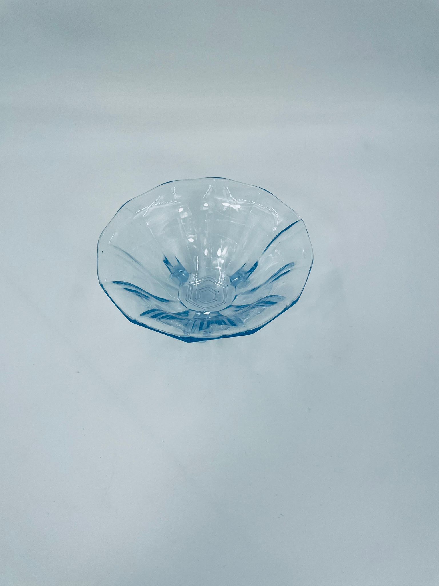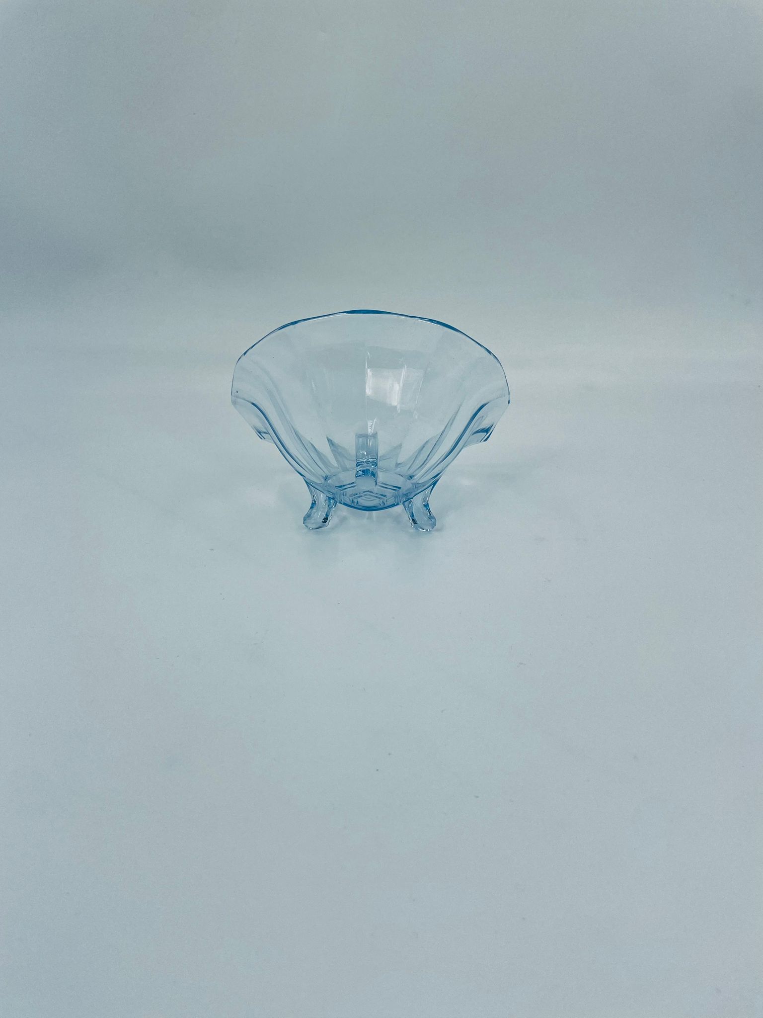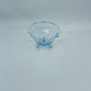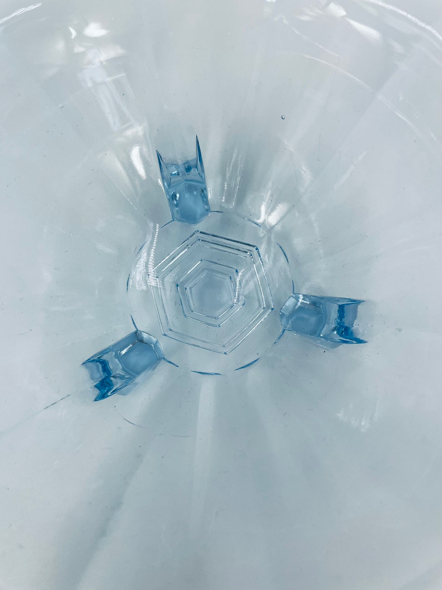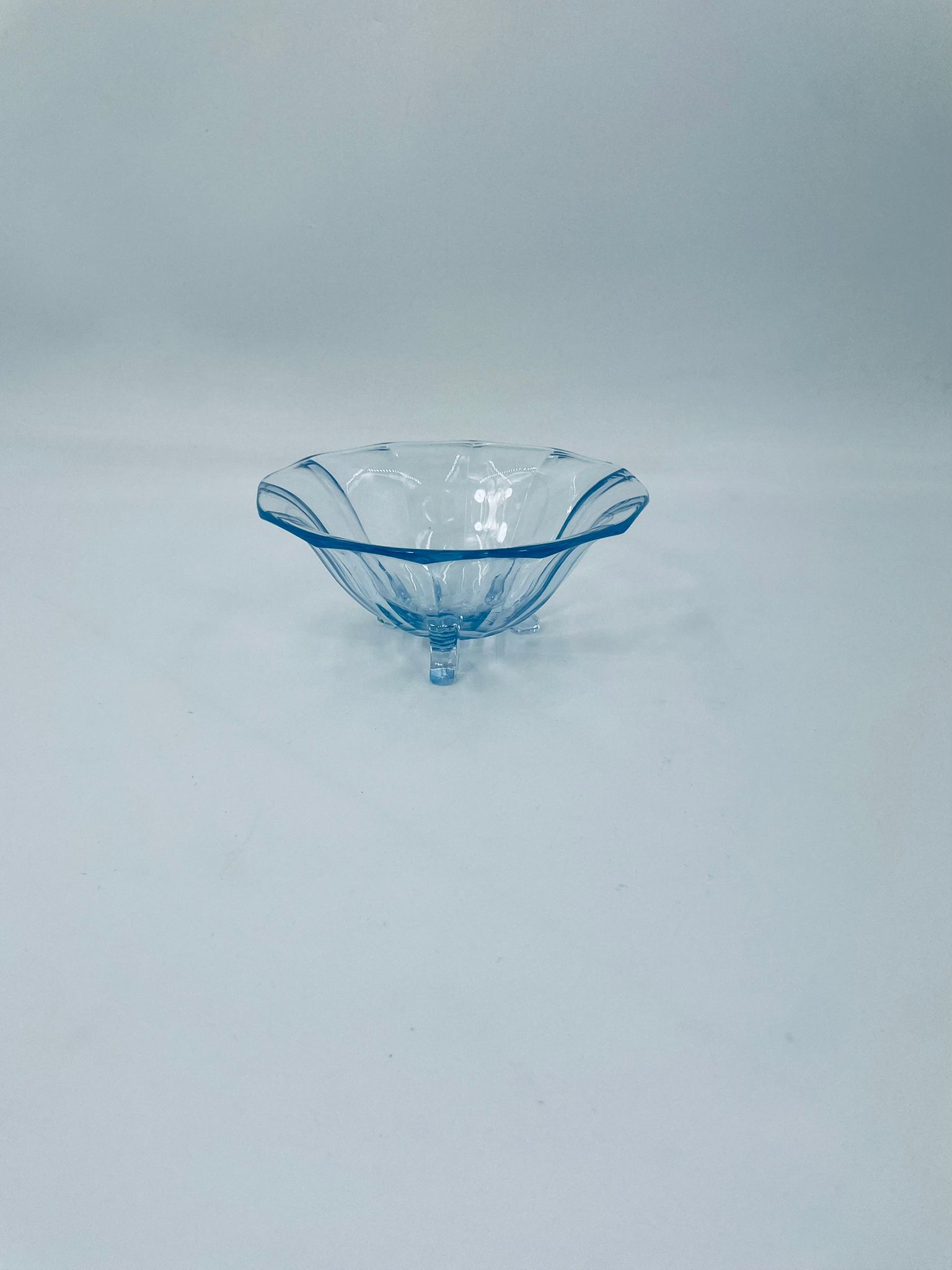 Art Deco style bowl, made of glass in a delicate blue shade. The bowl has a polygonal shape with wavy edges, set on three legs. It features a geometric star pattern on the bottom of the dish. Ideal as a salad bowl for sweets, fruit or other small items.