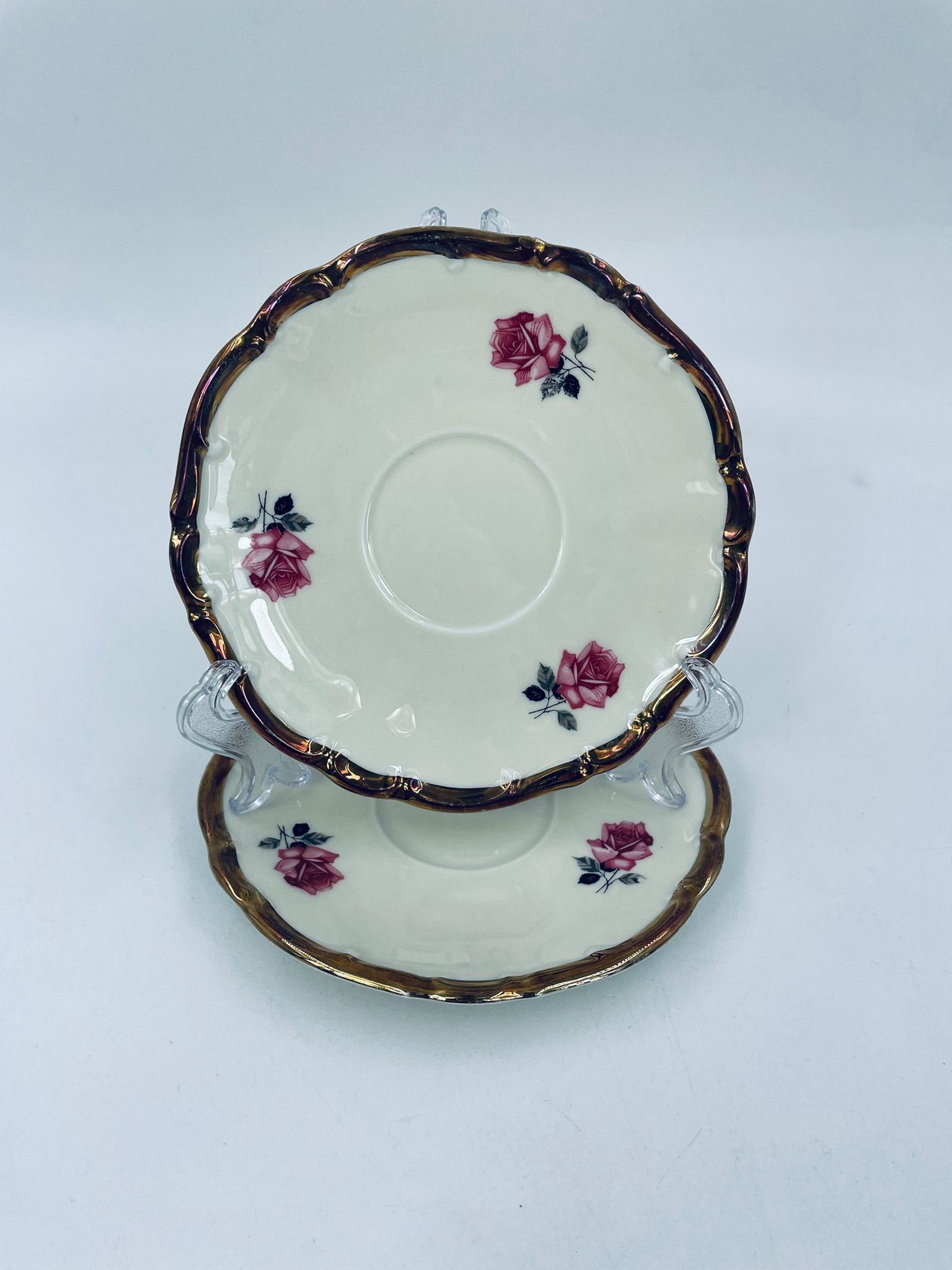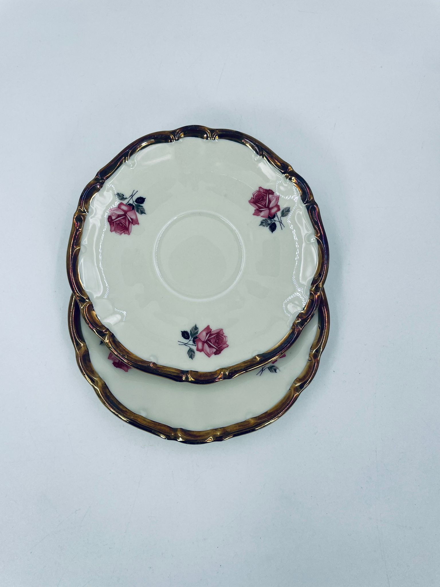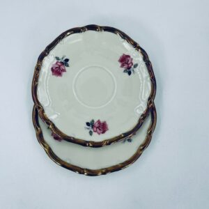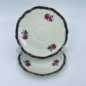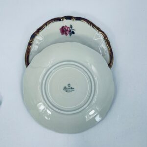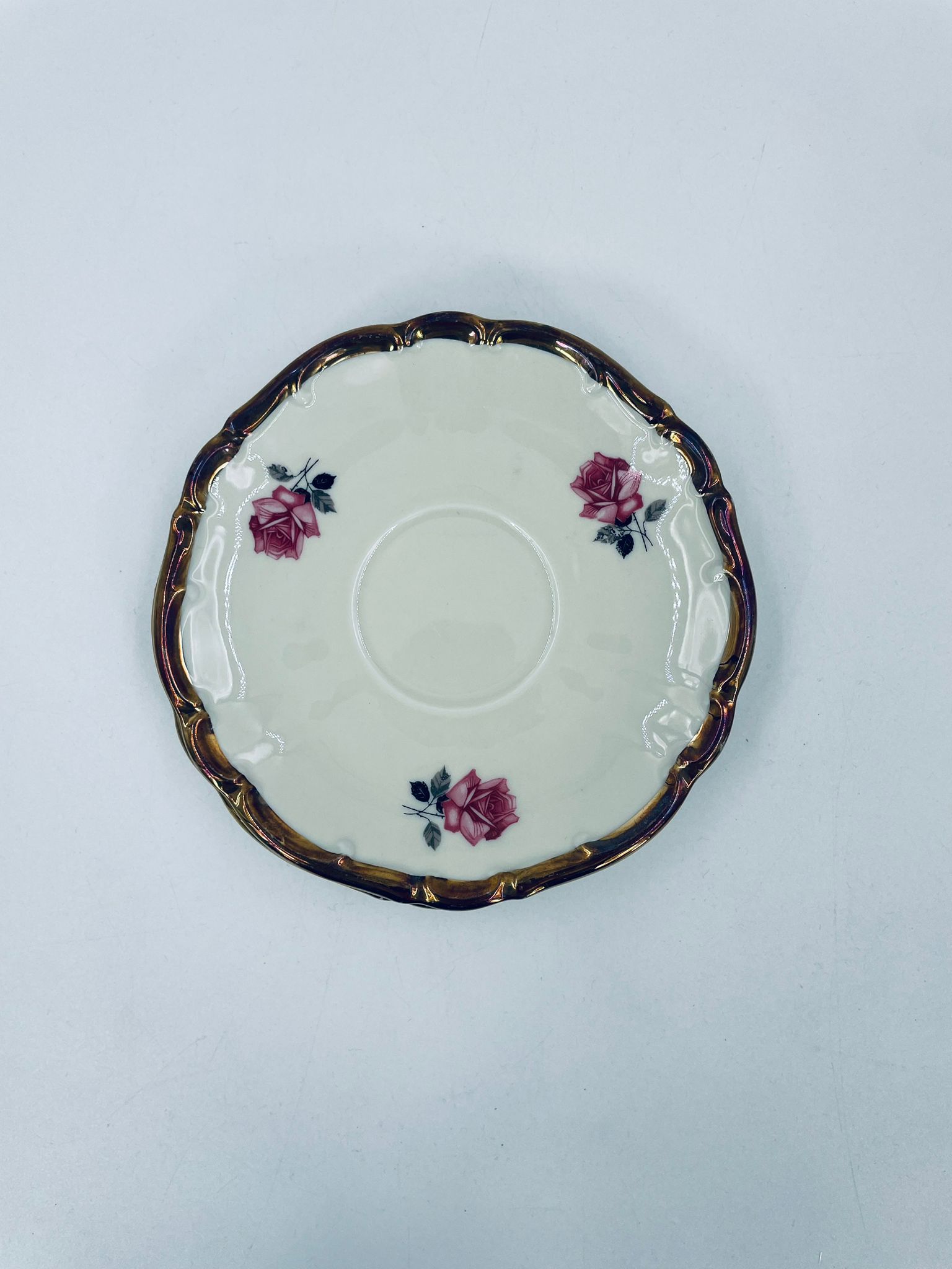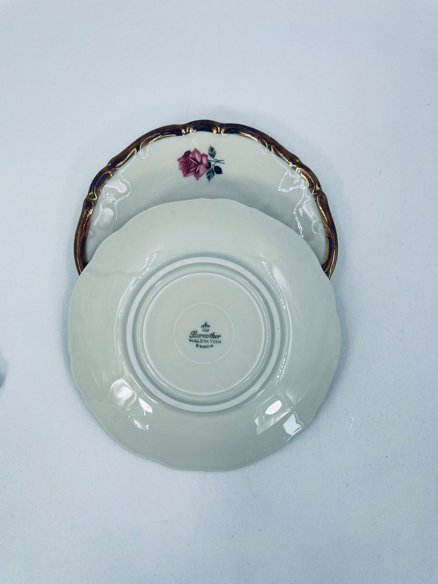 Porcelain cup saucer by Bareuther Waldsassen Bavaria , in ecru with a delicate floral pattern of pink roses on a branch in black and grey, finished in gold on the rim.