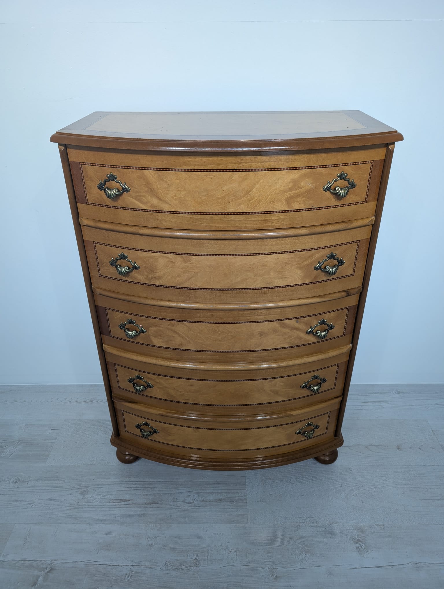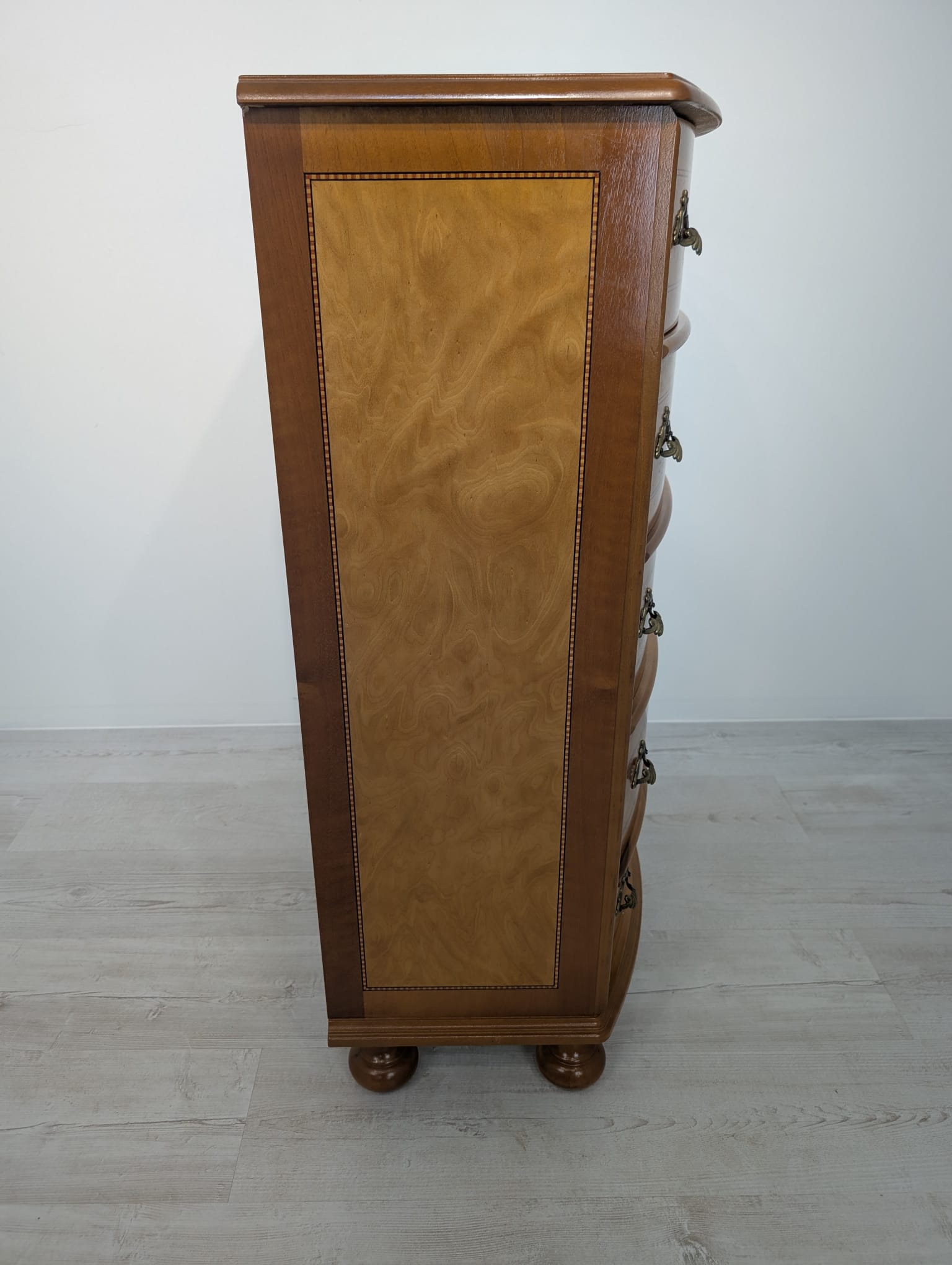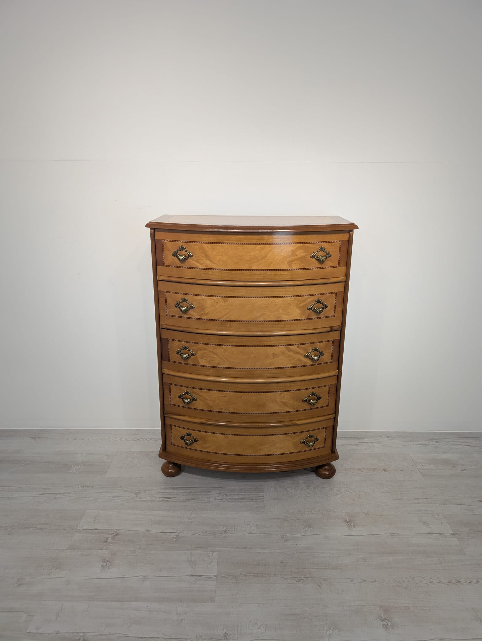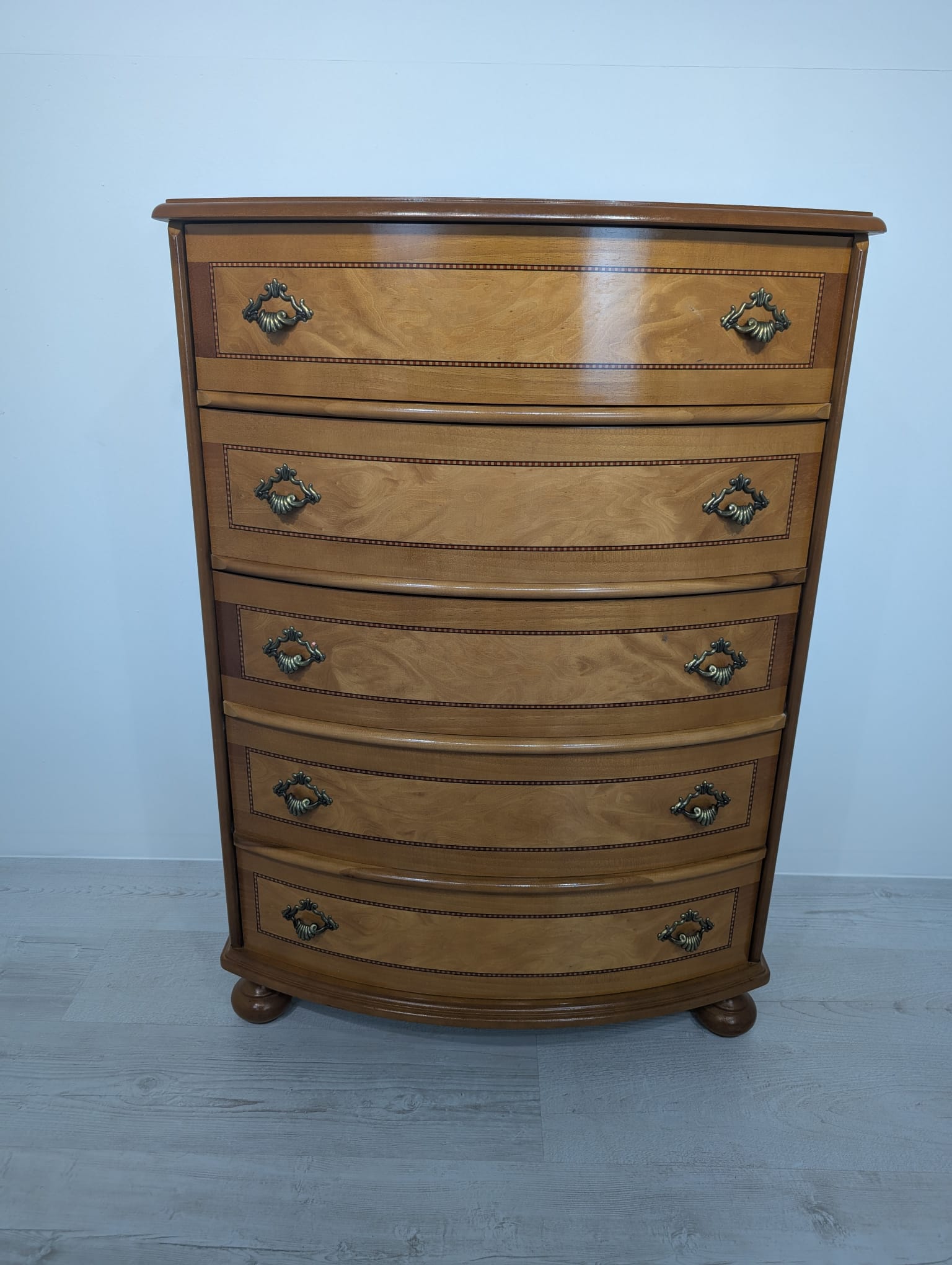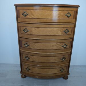 Belly chest of drawers with 5 drawers covered in marquetry.