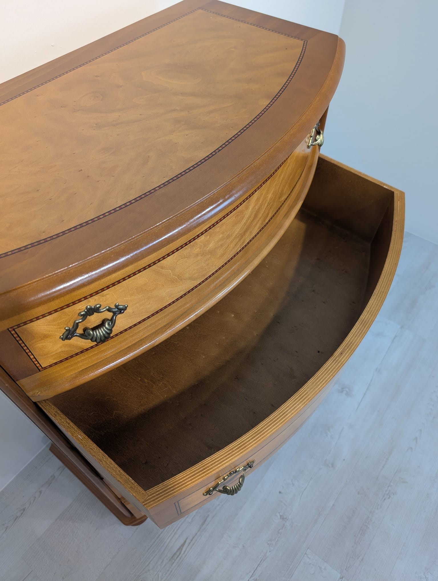 Cabinet, bentwood chest of drawers with inlay in walnut from the 1950s