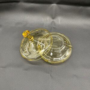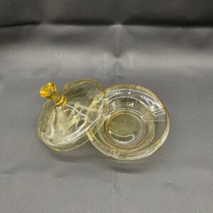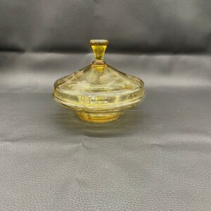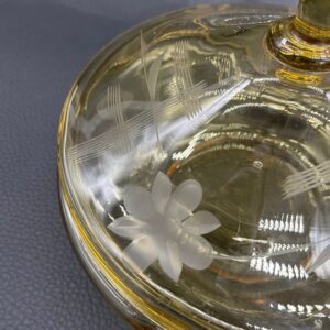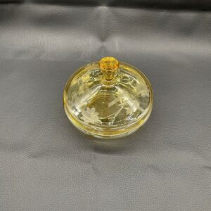 Bomboniera, puzdro w stylu Art Deco, wykonana z wyskiej jakości szkła kryształowego. Bomboniera w miodowym kolorze, posiada ozdobną pokrywę z ręcznie szlifowanymi wzorami kwiatowymi i liniami.