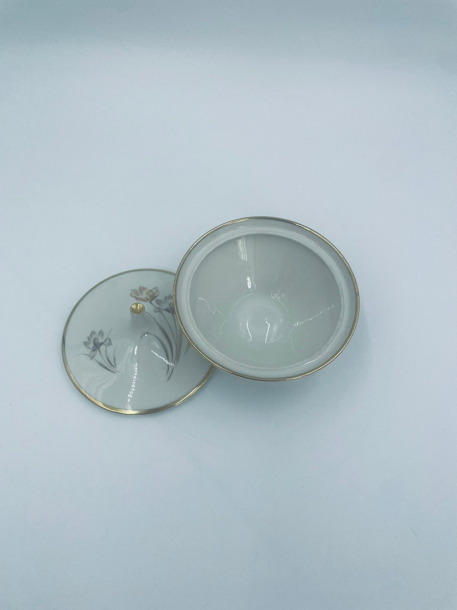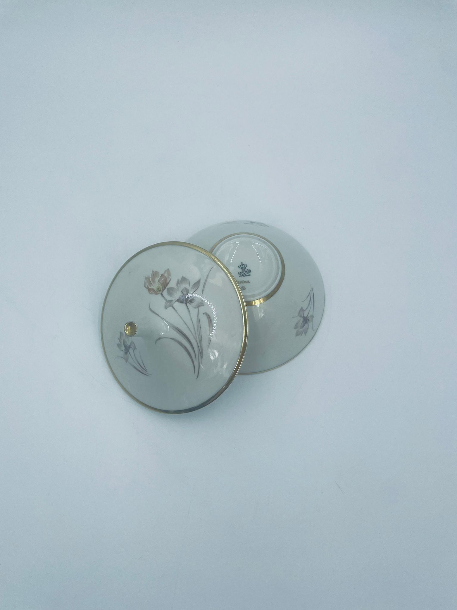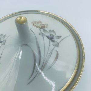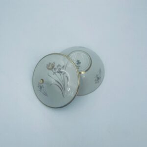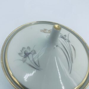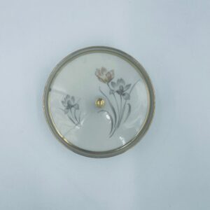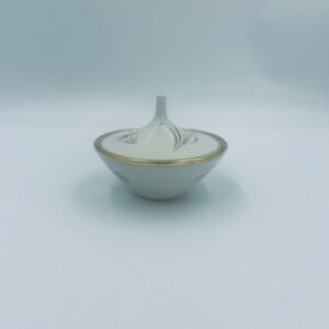 Bombonierka , cukiernica wytwórni Alka Kunst, datowana na lata 1953-1970r, wykonana z wysokiej jakości porcelany w kolorze ecru. Cukiernica we wzorze „Carina”, charakteryzuje się delikatnym motywem kwiatowym, wykończona złoceniem na krawędziach oraz uchwycie. Posiada przetarcie na złoceniu.