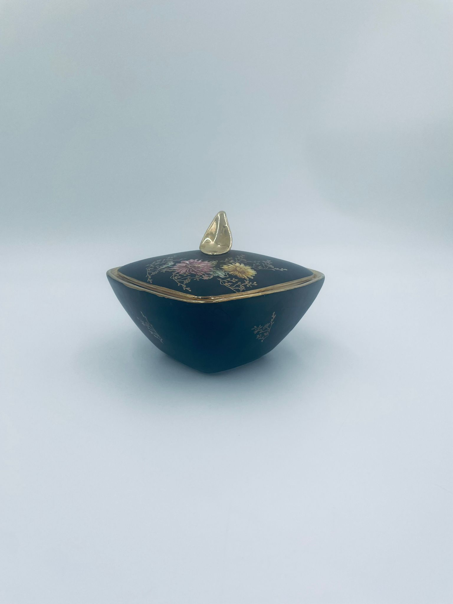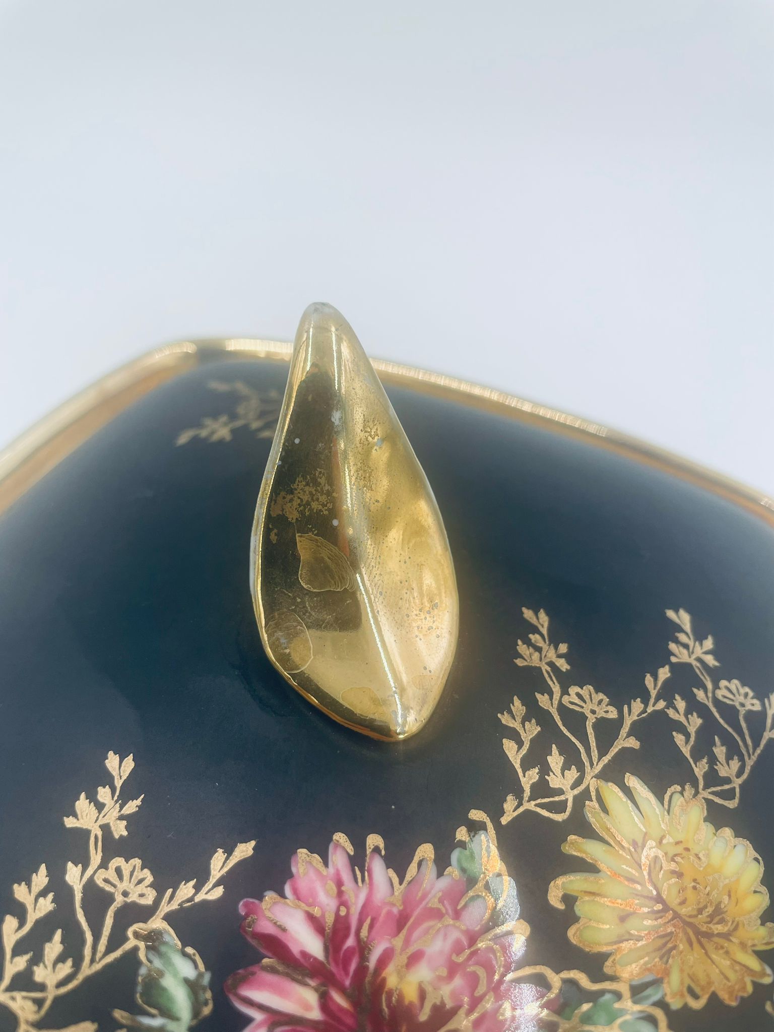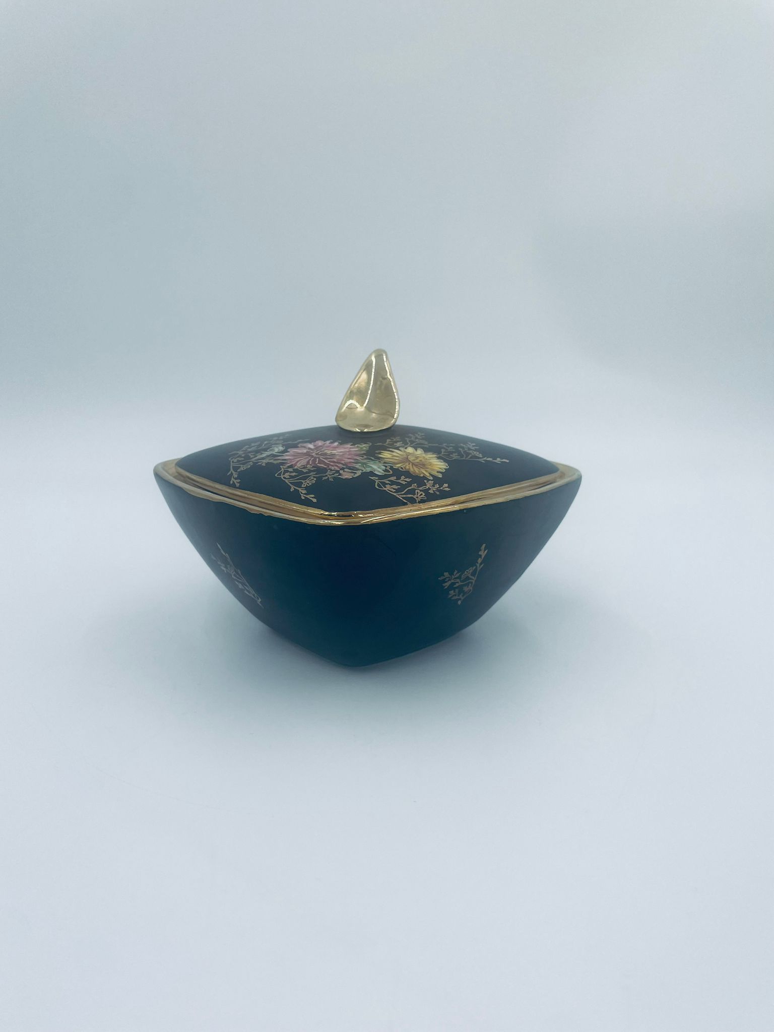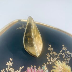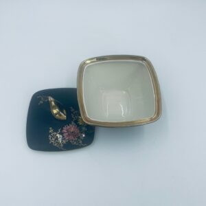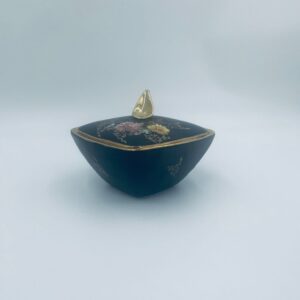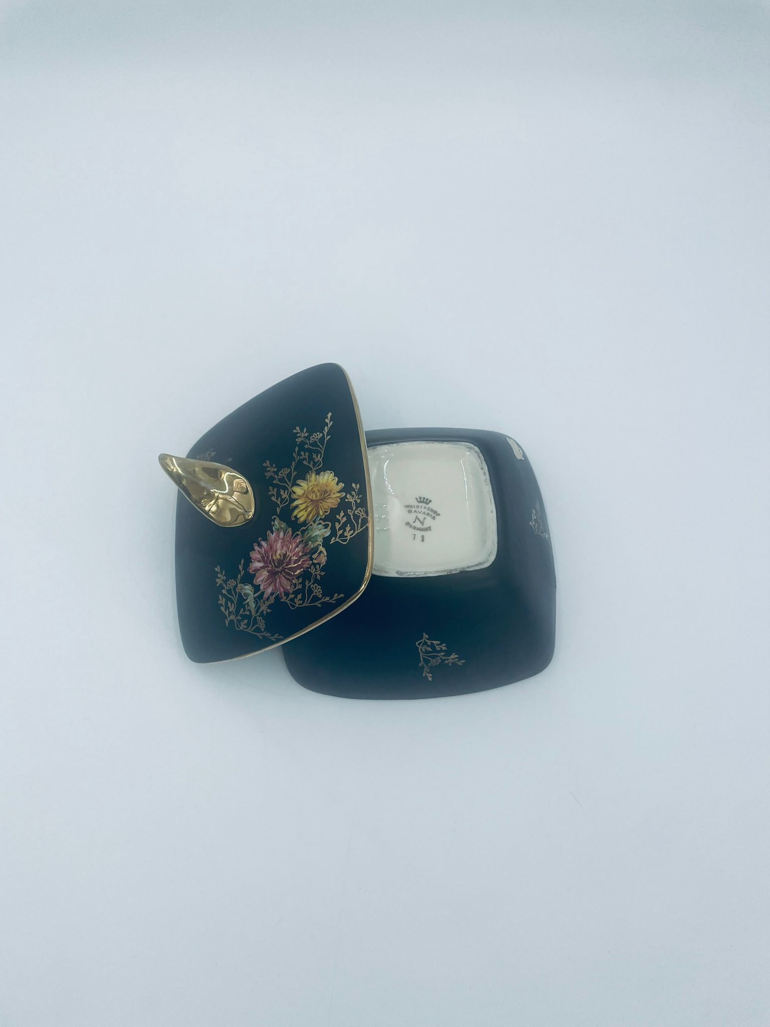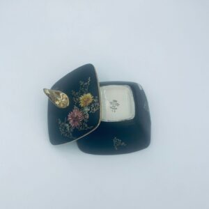 Bombonierka dekoracyjna wytwórni Waldershof Bavaria, datowana na lata 50te XXw, wykonana z wysokiej jakości porcelany z w matowym, czarnym kolorze. Bombonierka charakteryzuje się bogatym, ręcznie malowanymi zdobieniami kwiatowymi oraz złotymi akcentami, posiada pokrywę z ozdobnym, złotym uchwytem w kształcie listka, wykończona złoceniem na krawędzi. Posiada przetarcie na złoceniu.