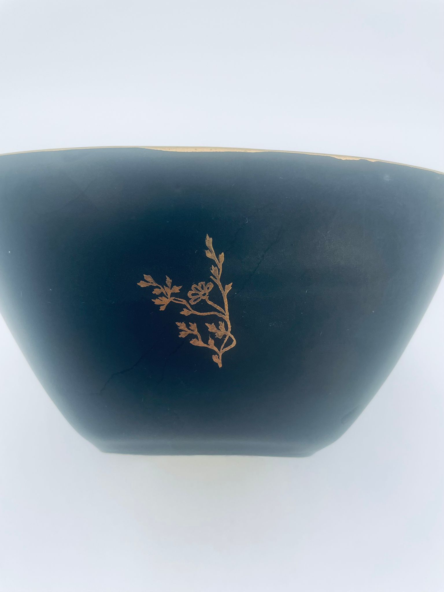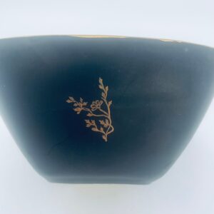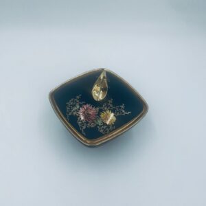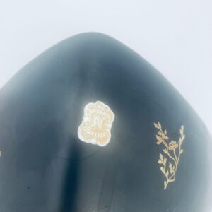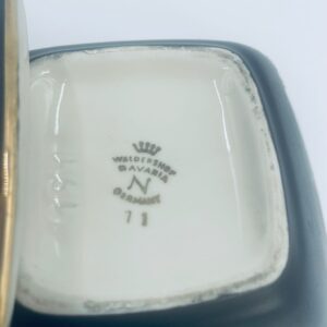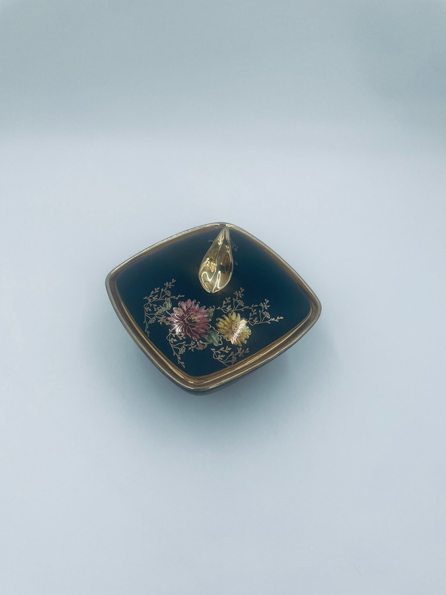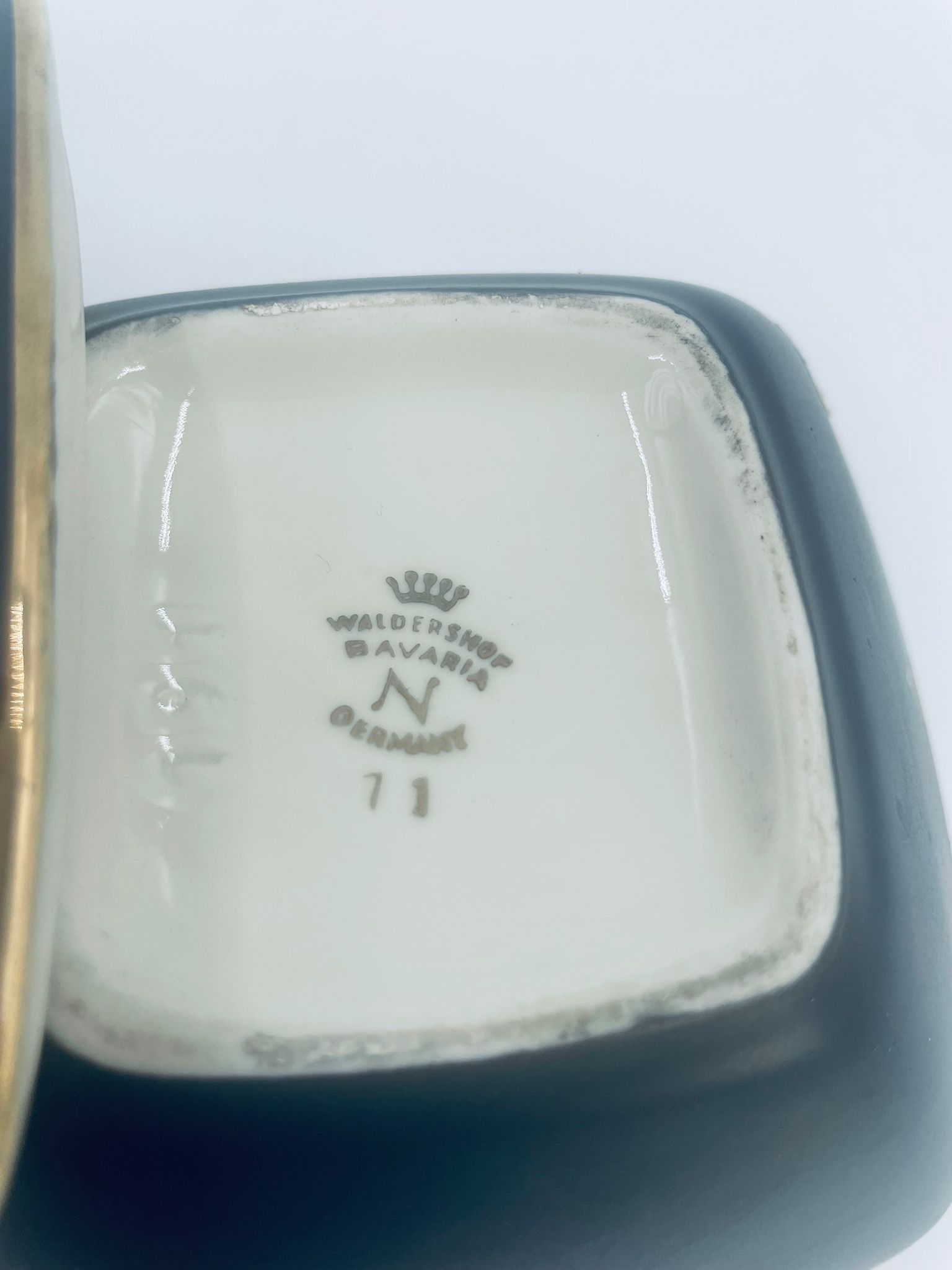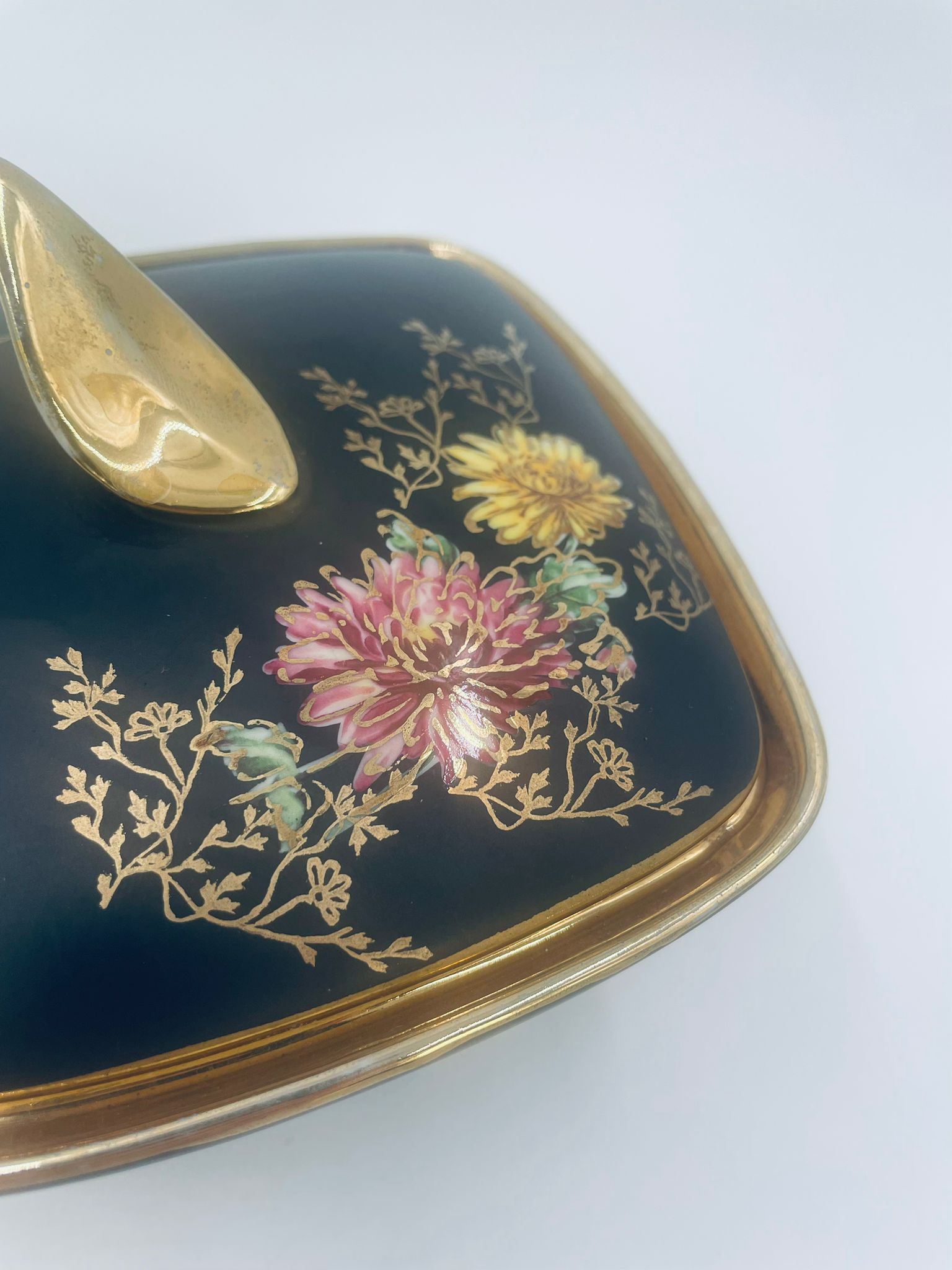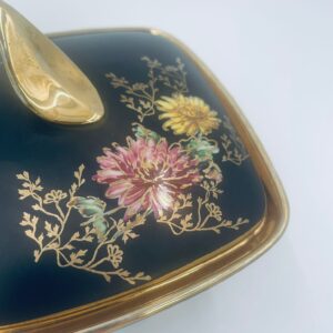 Bombonierka dekoracyjna wytwórni Waldershof Bavaria, datowana na lata 50te XXw, wykonana z wysokiej jakości porcelany z w matowym, czarnym kolorze. Bombonierka charakteryzuje się bogatym, ręcznie malowanymi zdobieniami kwiatowymi oraz złotymi akcentami, posiada pokrywę z ozdobnym, złotym uchwytem w kształcie listka, wykończona złoceniem na krawędzi. Posiada przetarcie na złoceniu.