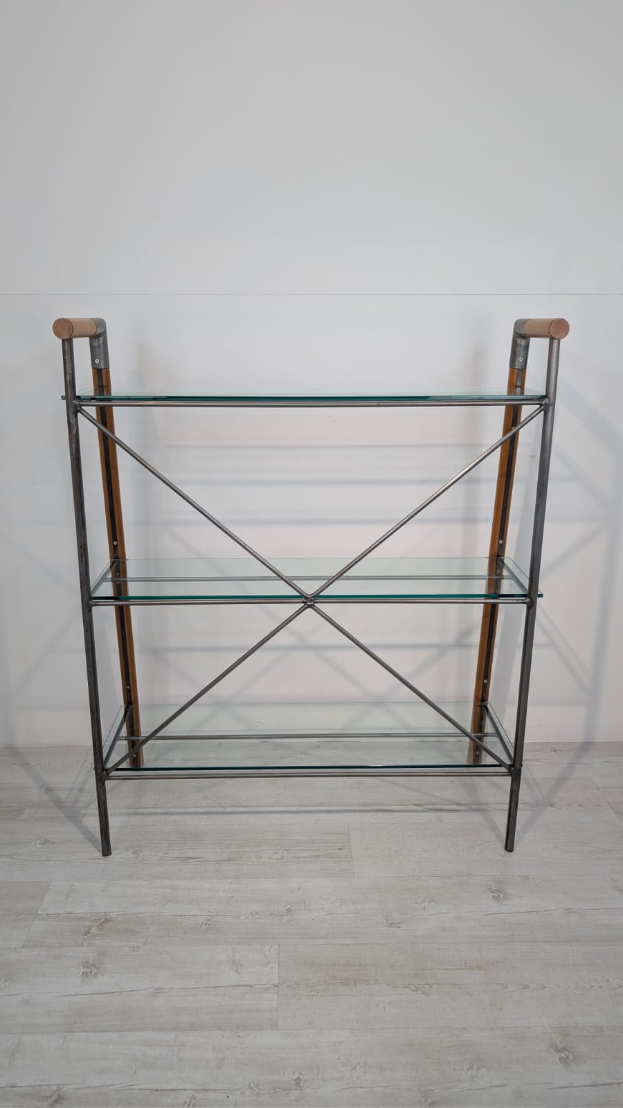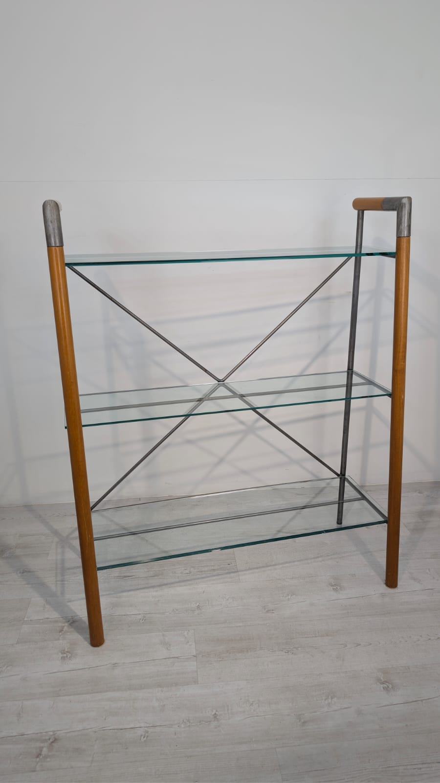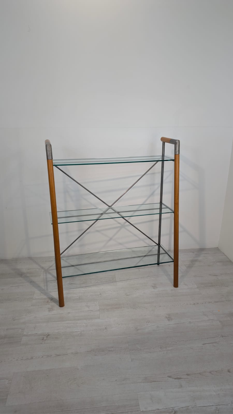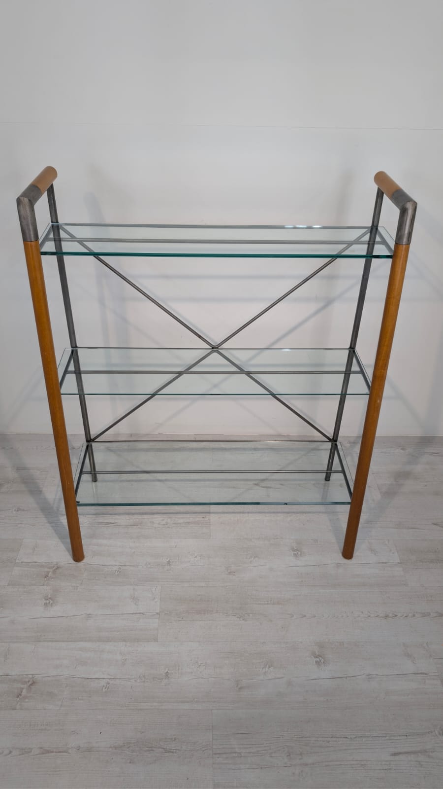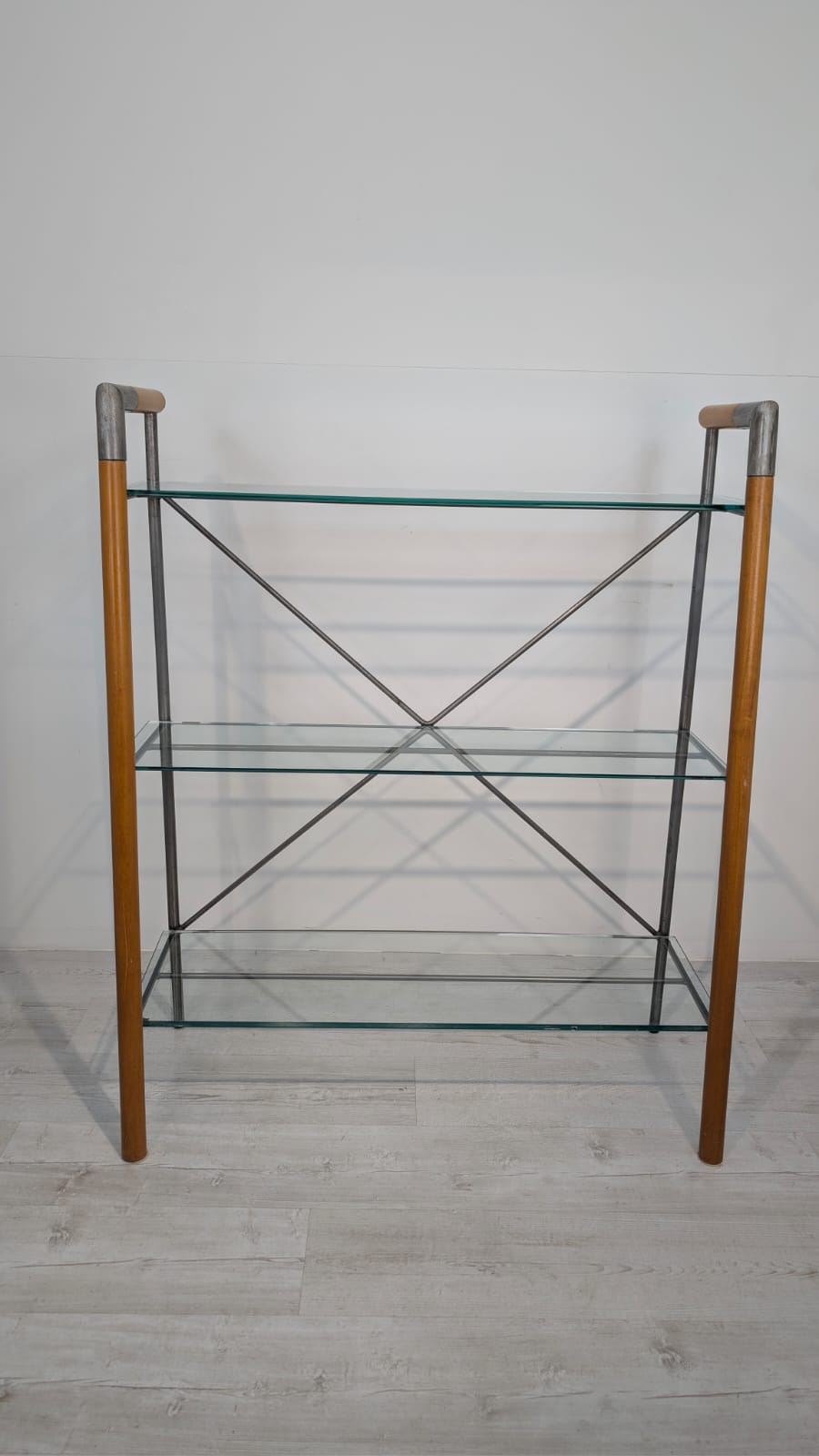 Modern glass shelf for books or other objects. Made of transparent glass and metal and wooden components. The solid construction ensures stability and safety. Ideal for the living room, bedroom or office.