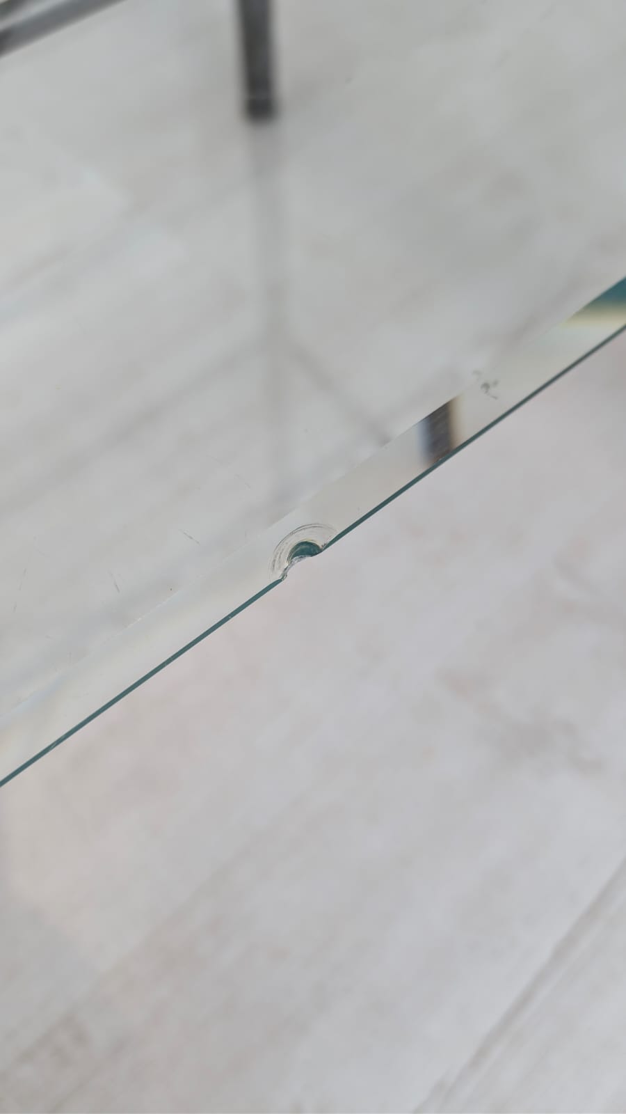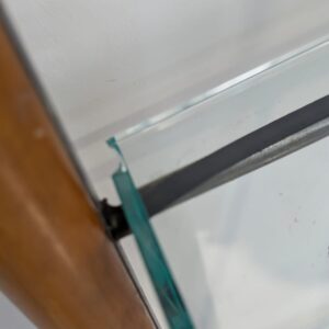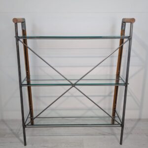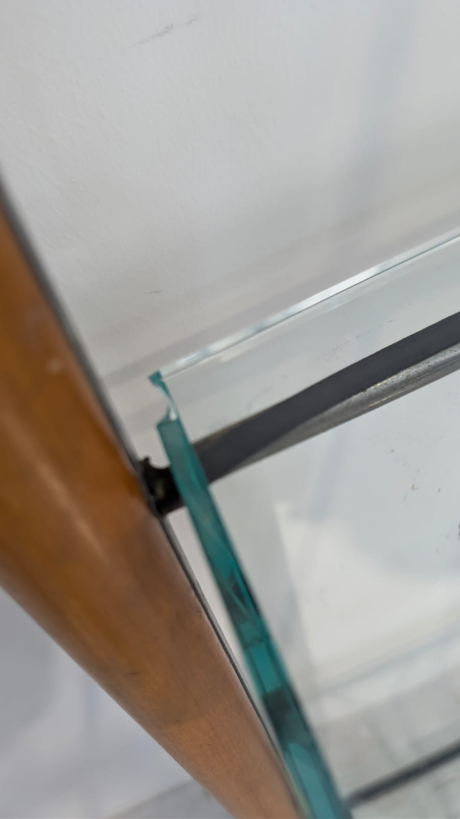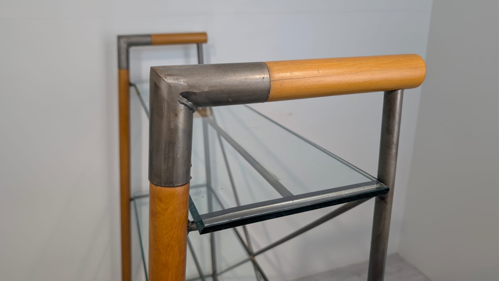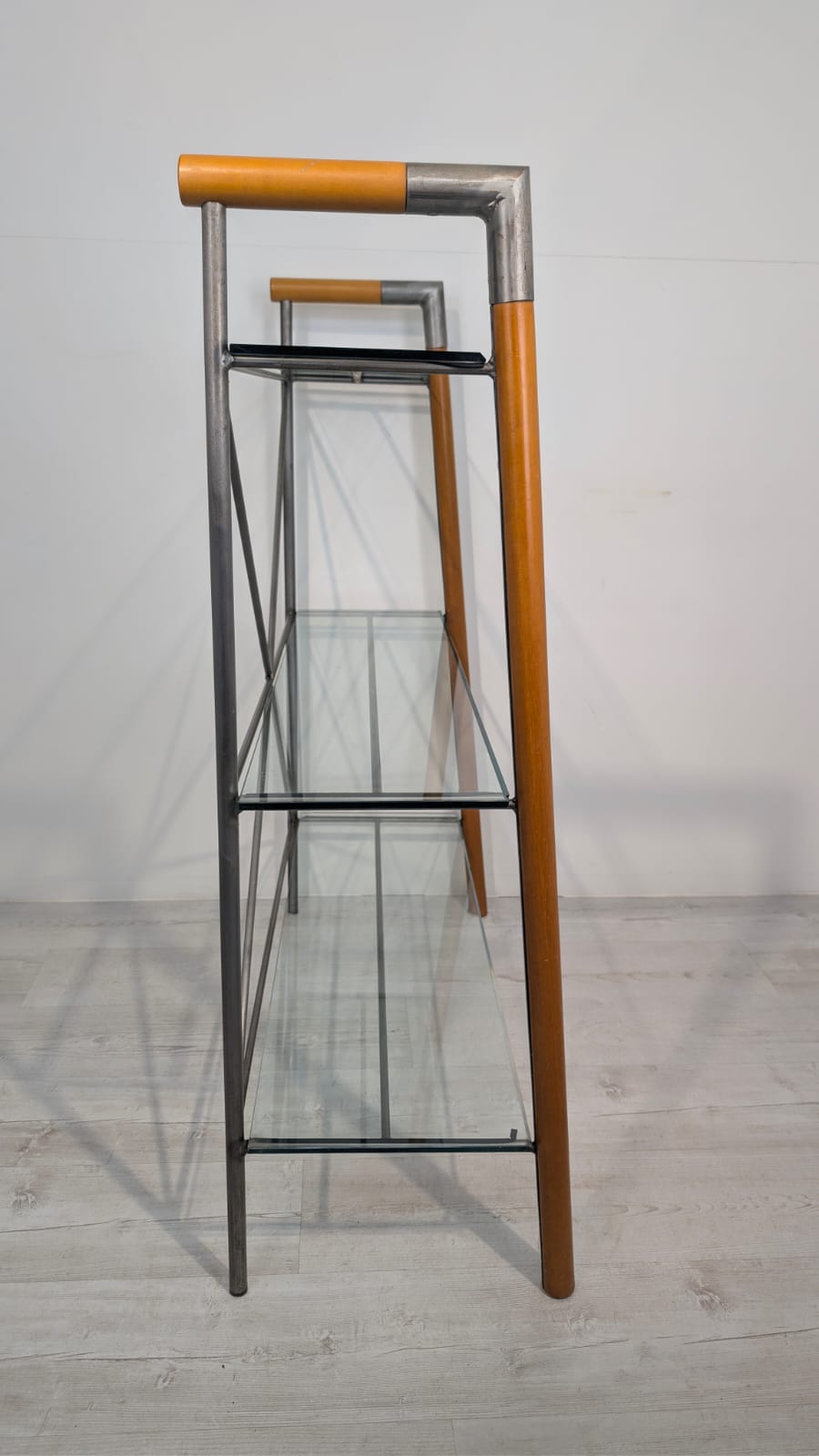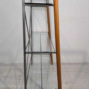 Modern glass shelf for books or other objects. Made of transparent glass and metal and wooden components. The solid construction ensures stability and safety. Ideal for the living room, bedroom or office.