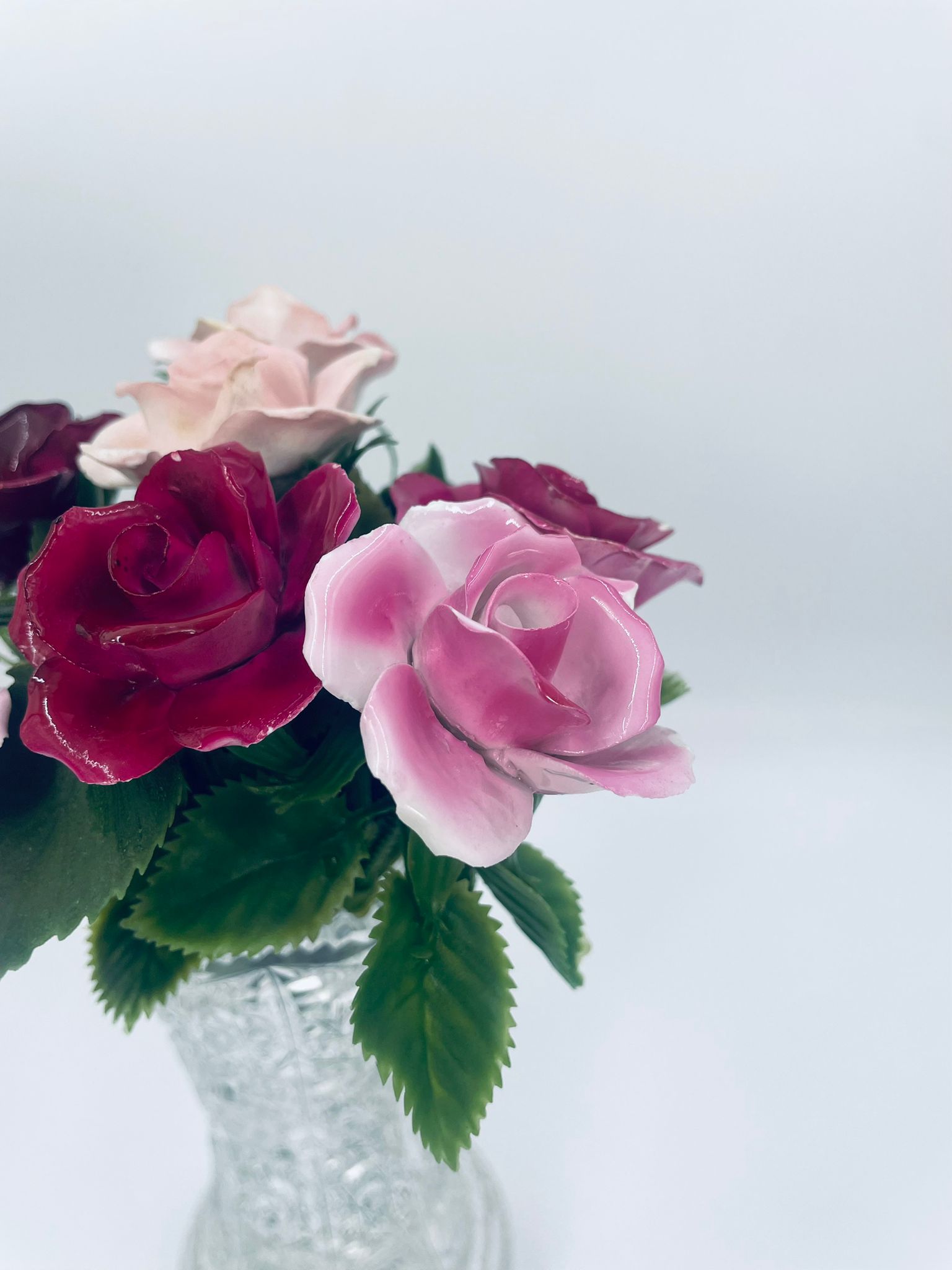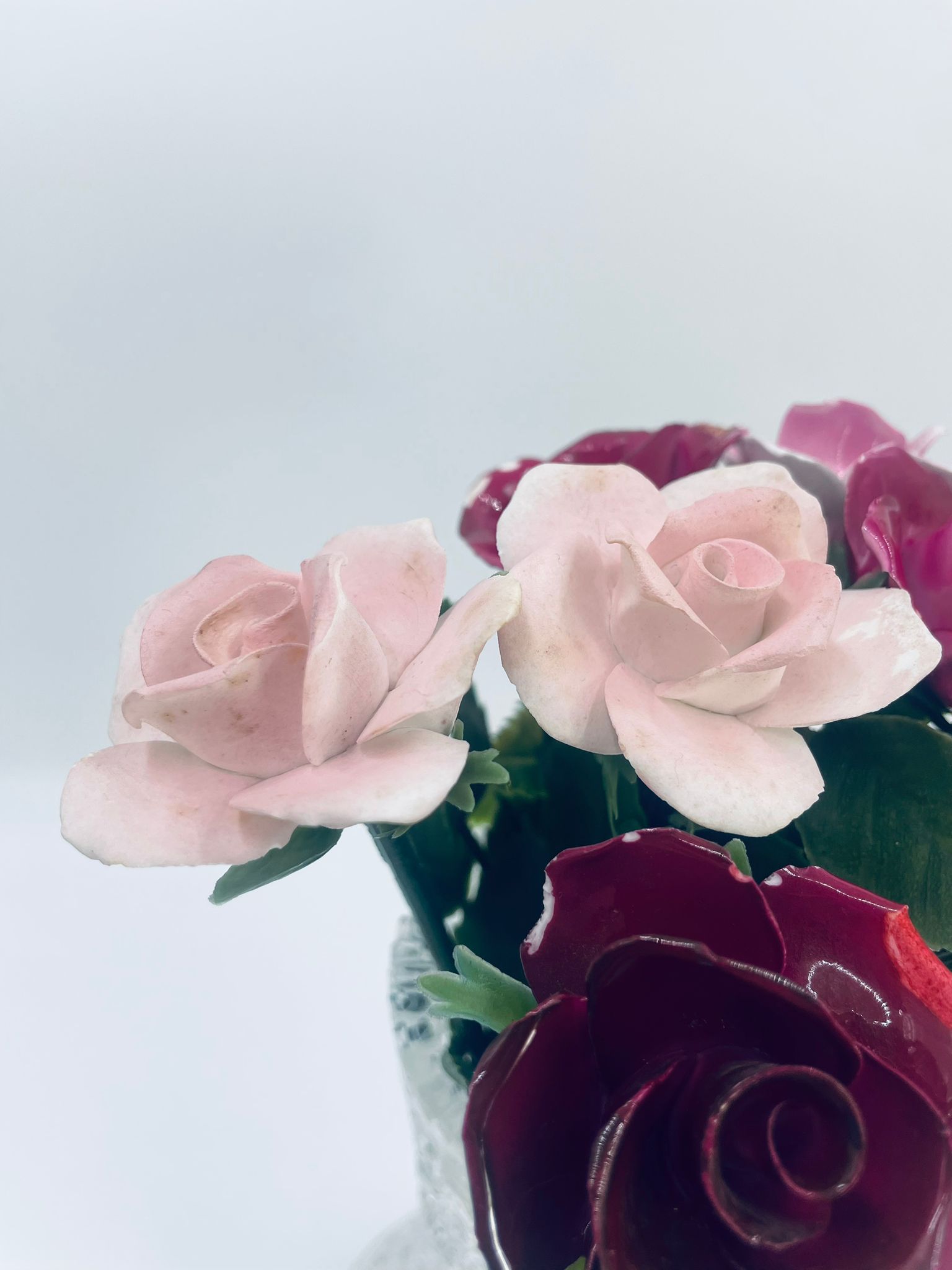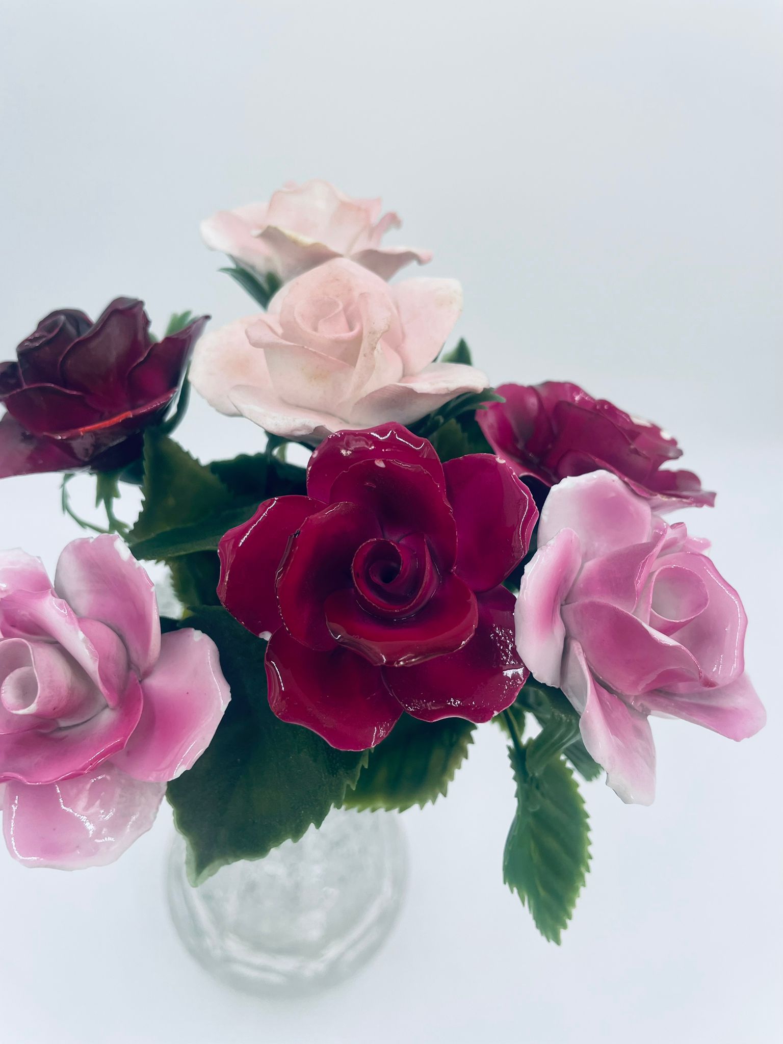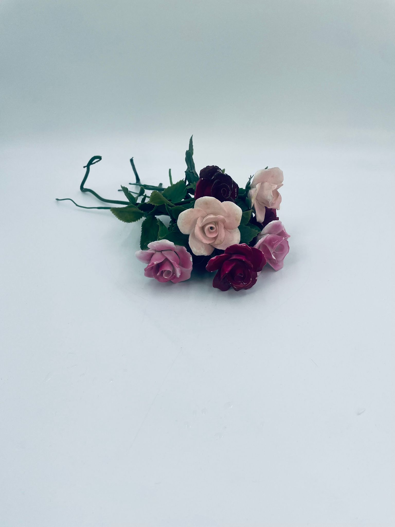 Vintage style bouquet of decorative roses made from high quality porcelain. Handmade and moulded roses, coloured pink and burgundy, set on green stems with leaves. They have damage to the petals.