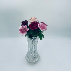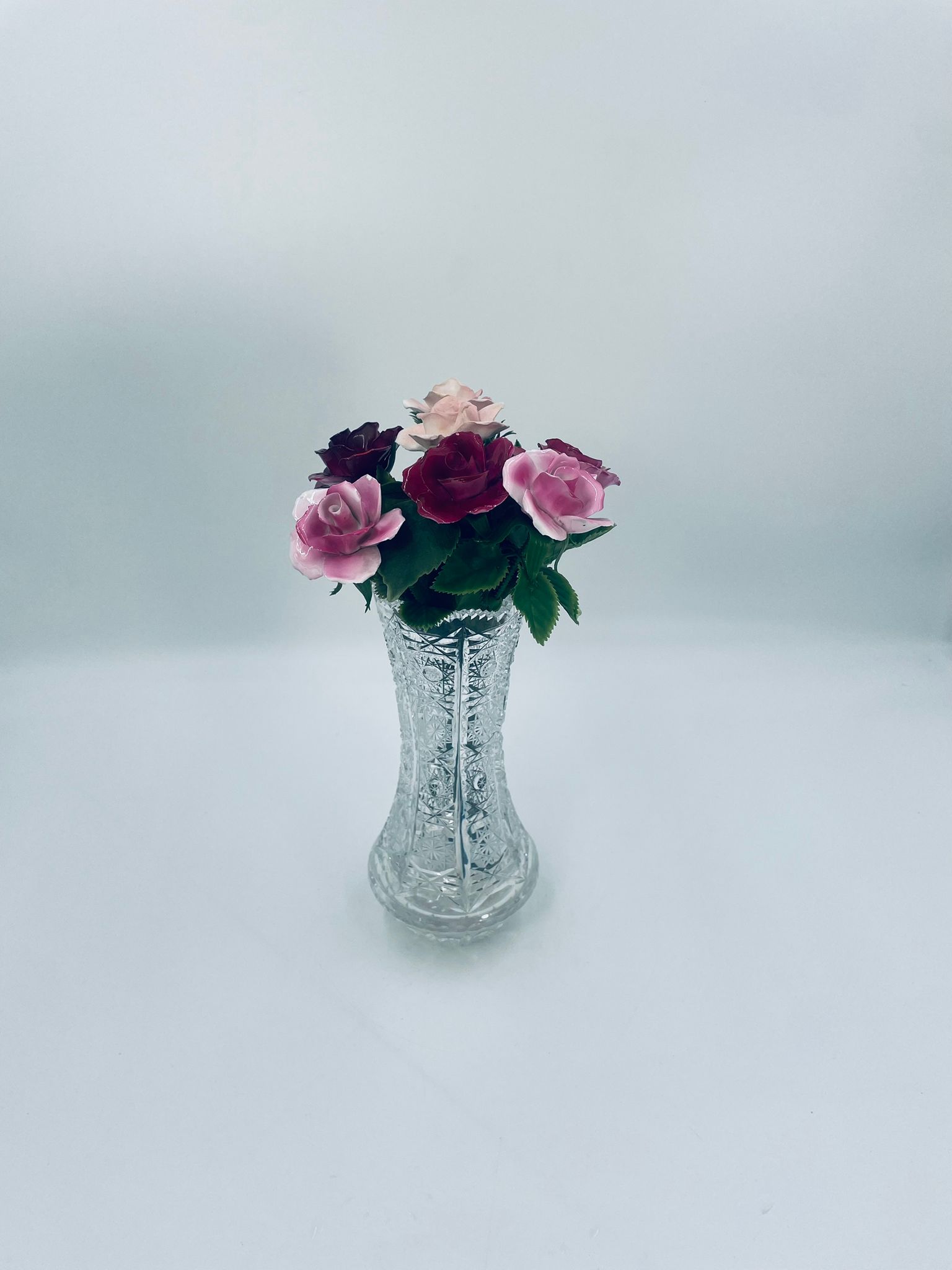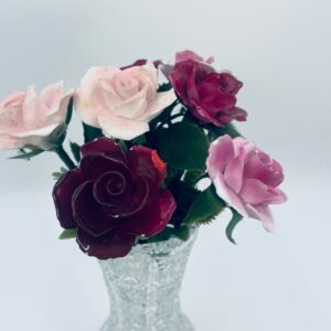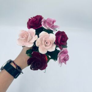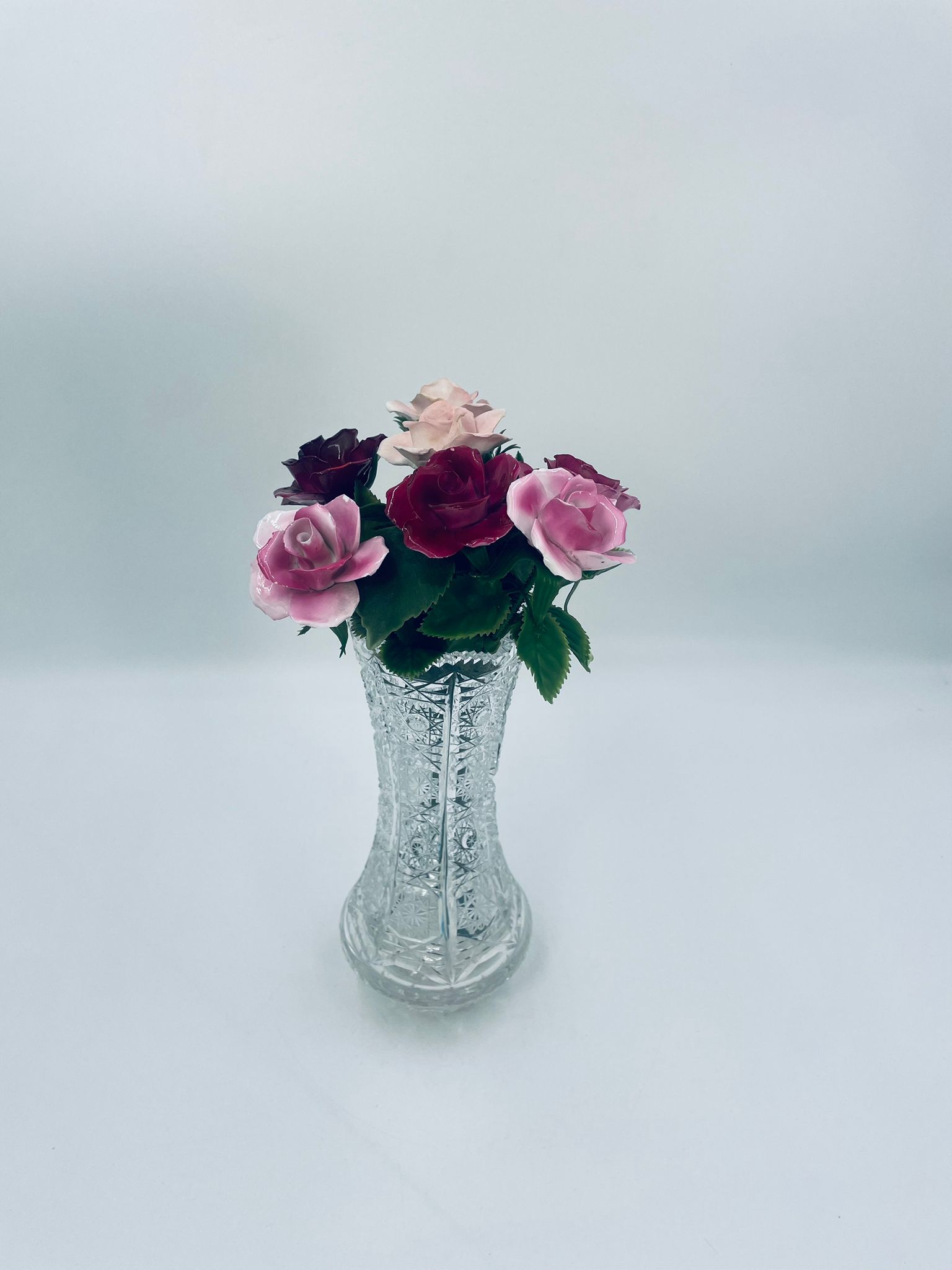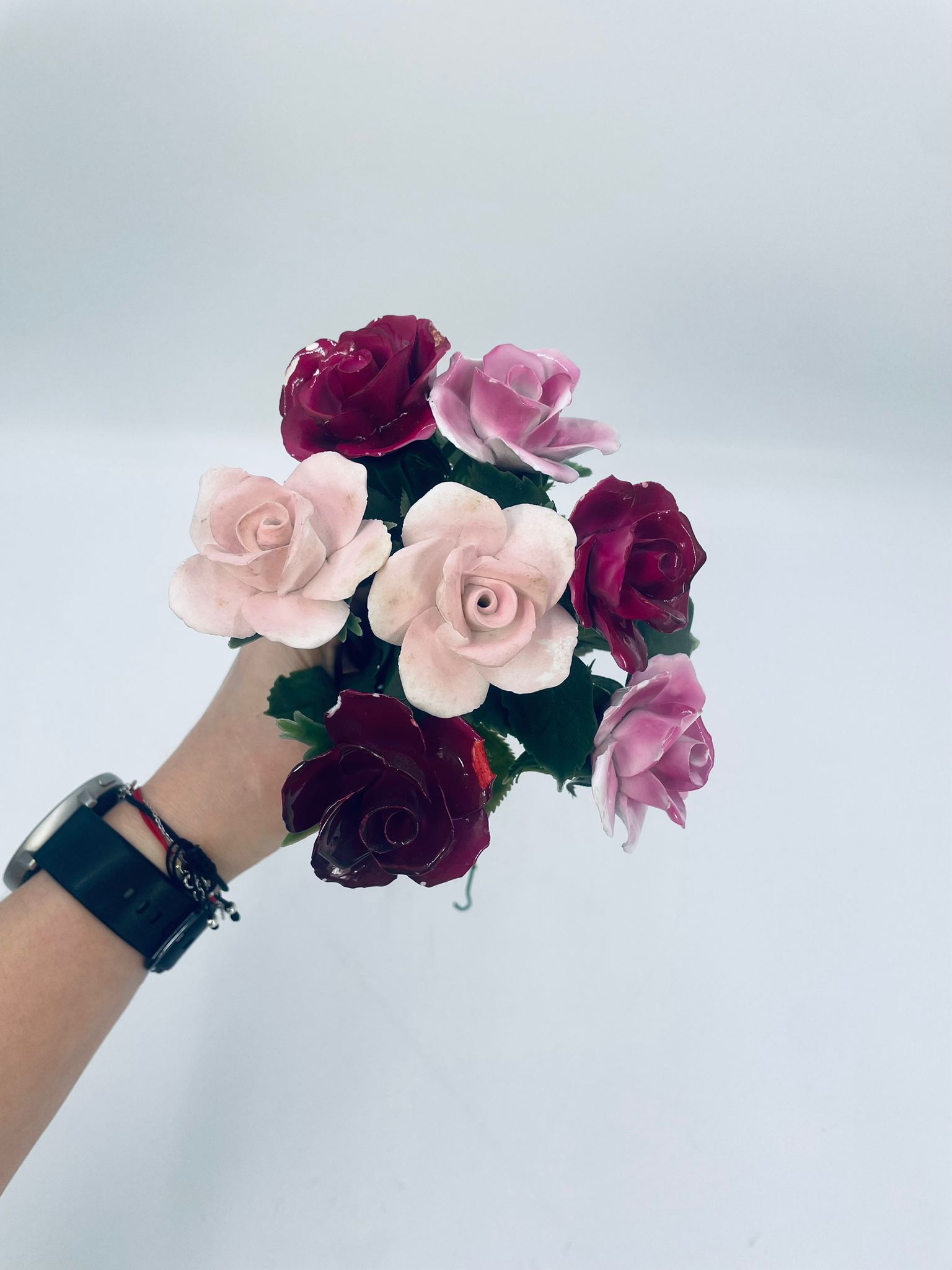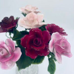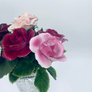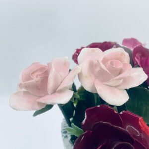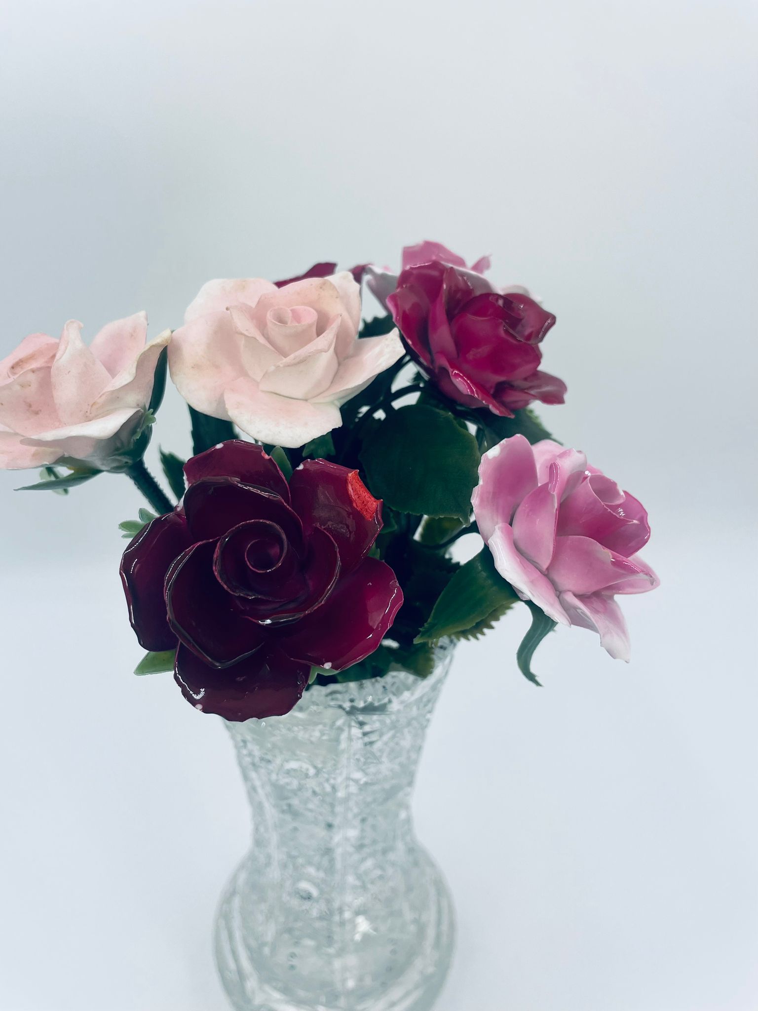Vintage style bouquet of decorative roses made from high quality porcelain. Handmade and moulded roses, coloured pink and burgundy, set on green stems with leaves. They have damage to the petals.