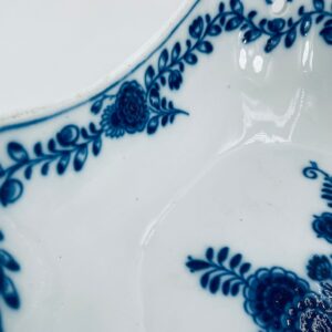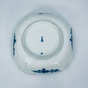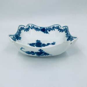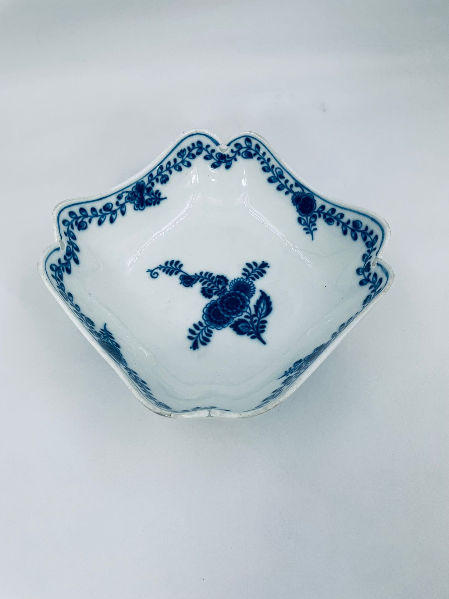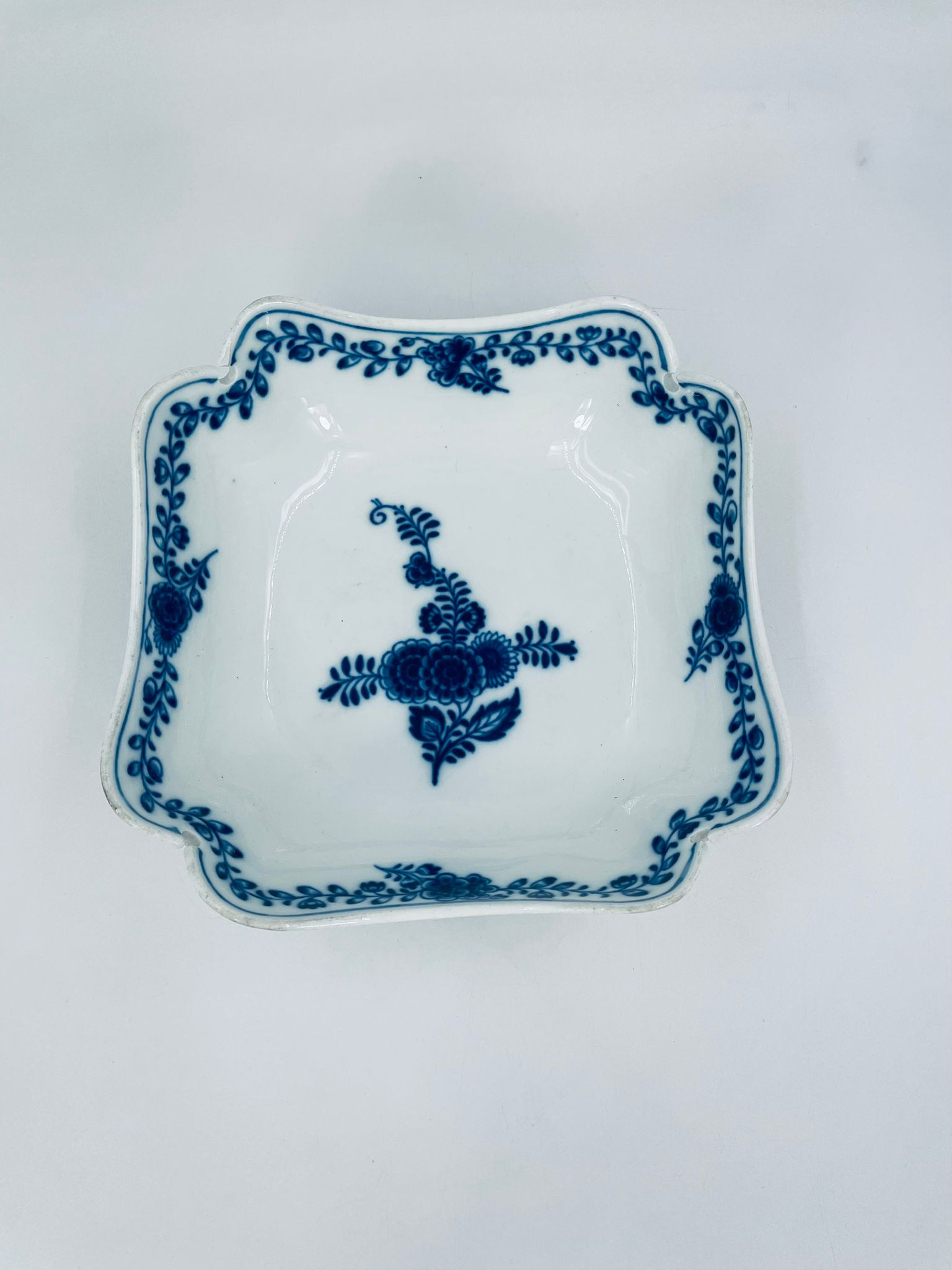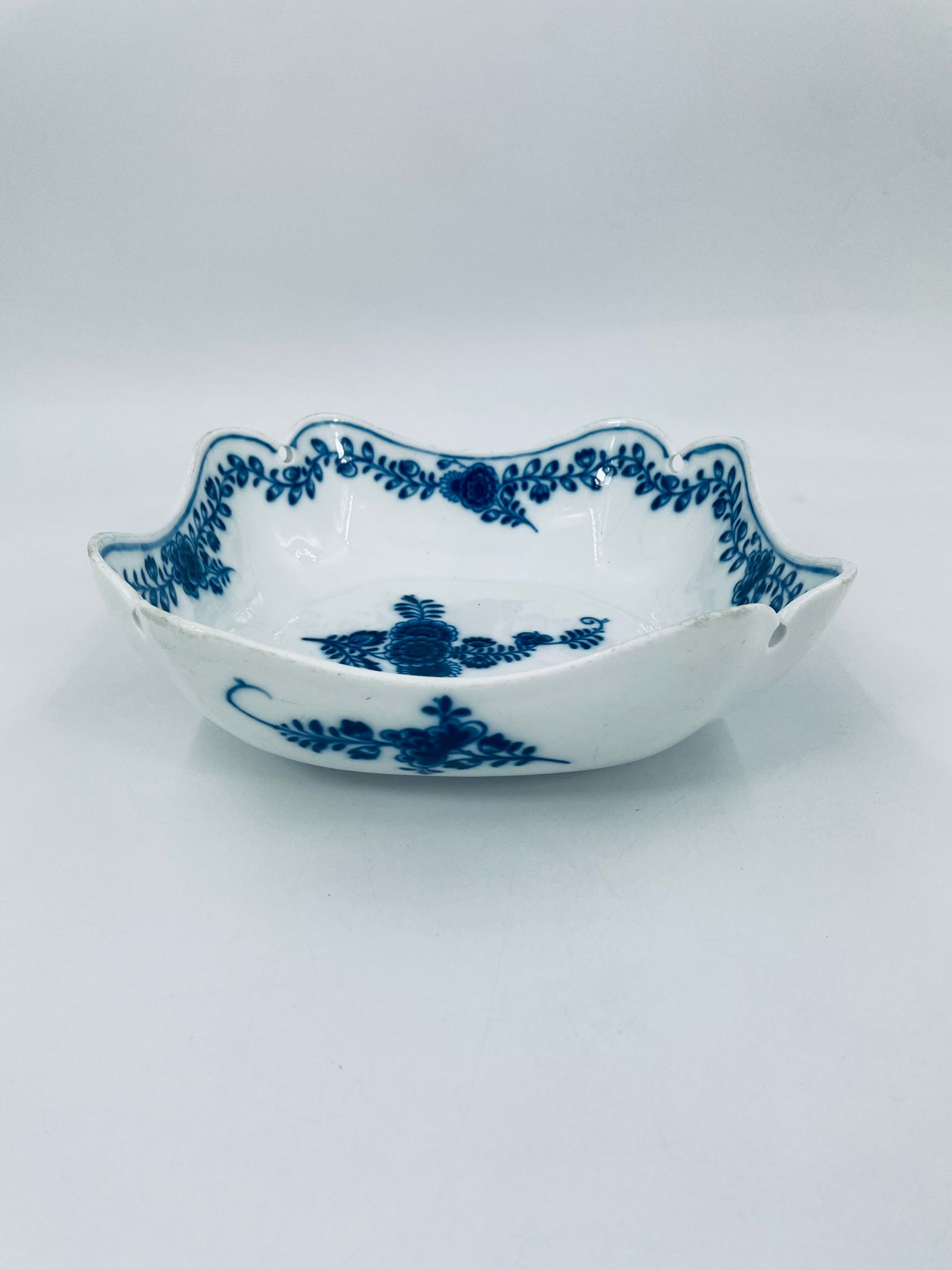 Meissen porcelain bowl in white with blue floral decoration and a beautiful garland at the top of the vessel, onion pattern. The bowl is square , has beautiful wavy edges. It has rubbing due to use.