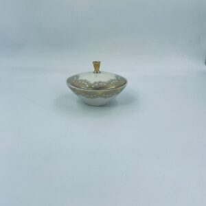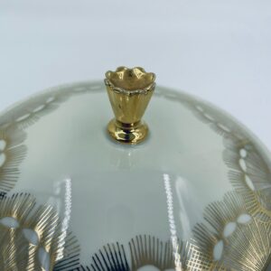 A box of chocolates from the Winterling Röslau Bavaria label, made of high-quality porcelain in ecru. It is characterised by rich gold decorations in fan style. The lid has a decorative gold handle. It can be used as a sugar bowl, a chocolate box for sweets or jewellery.