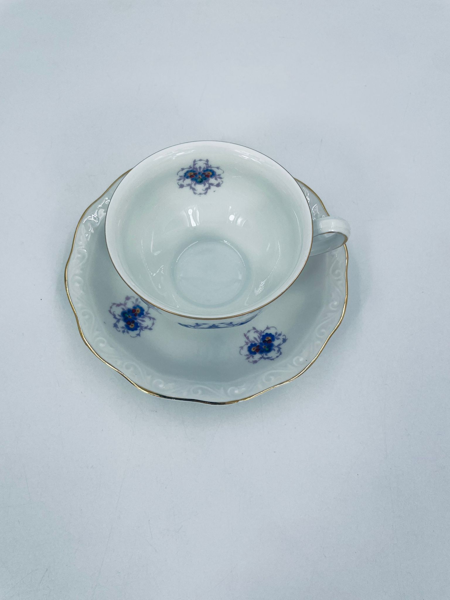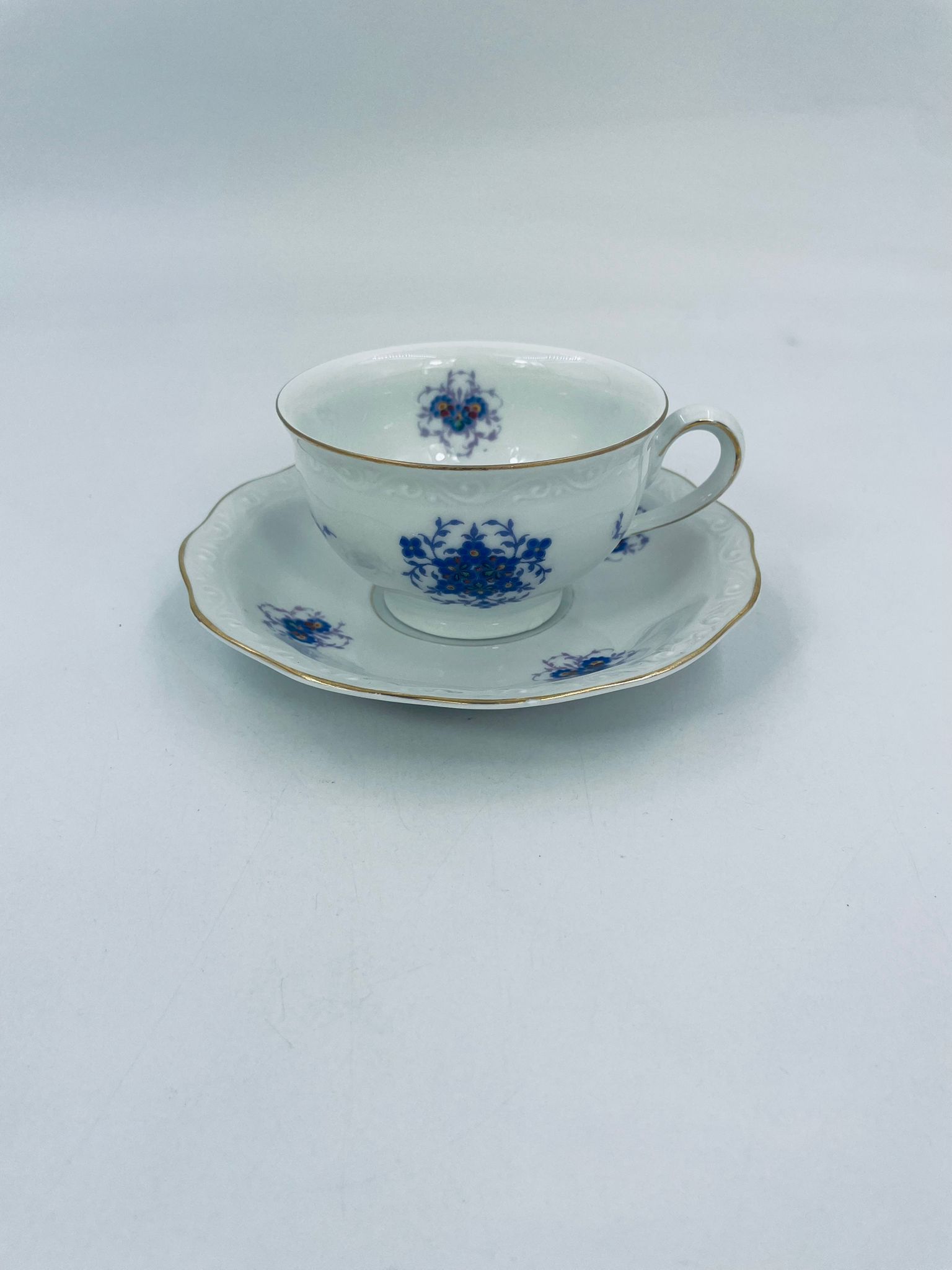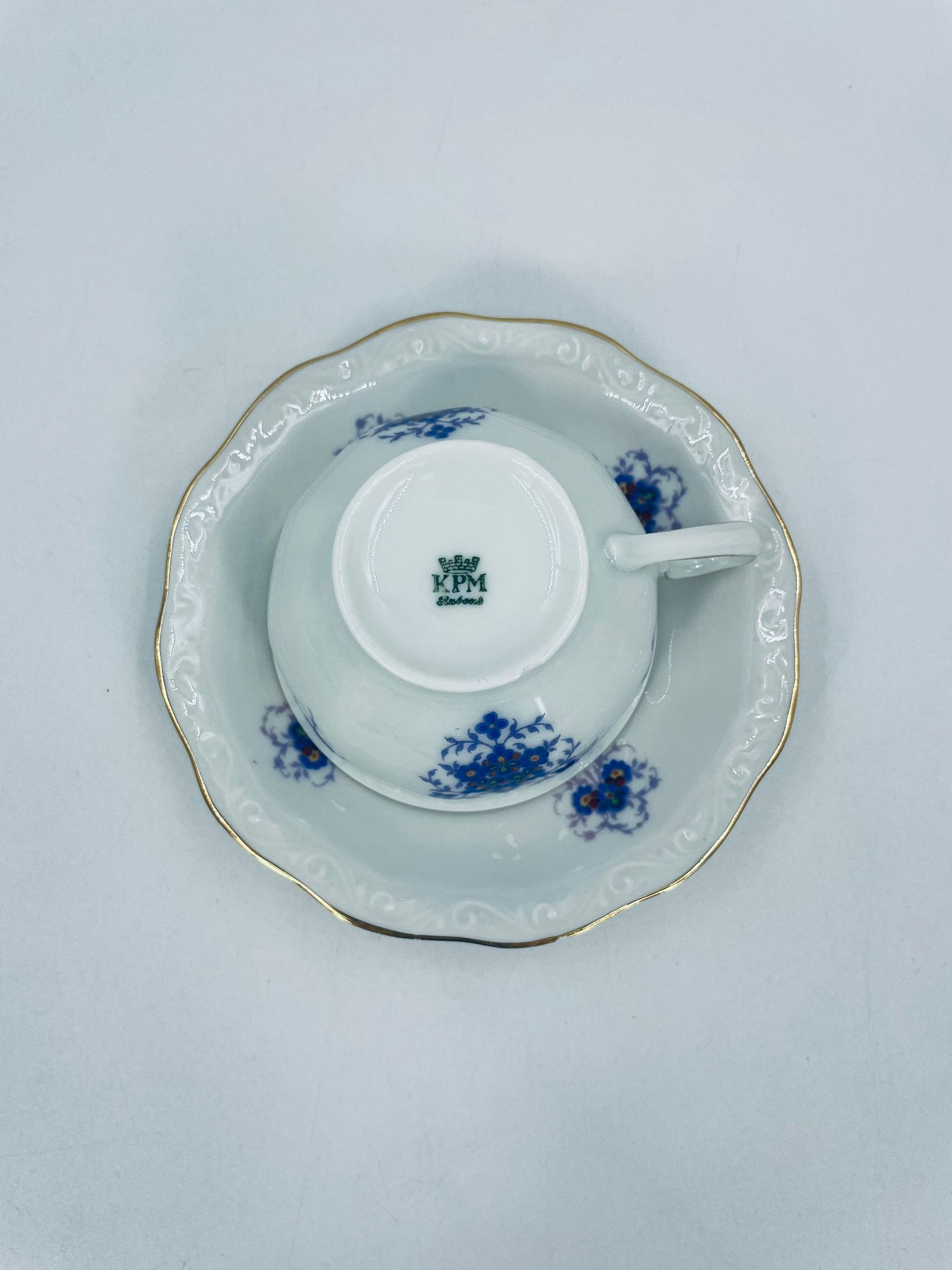 A cup in duo set by the well-known KPM Rubens manufactory produced between 1930 and 1944, set in white porcelain with a delicate floral motif with colourful flowers in the Art Deco style. Both cup and saucer have subtle embossing and gilding on the rims, adding to the charm and elegance.