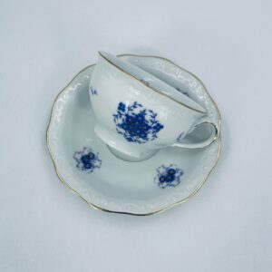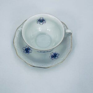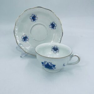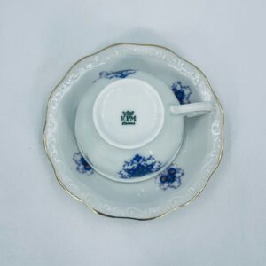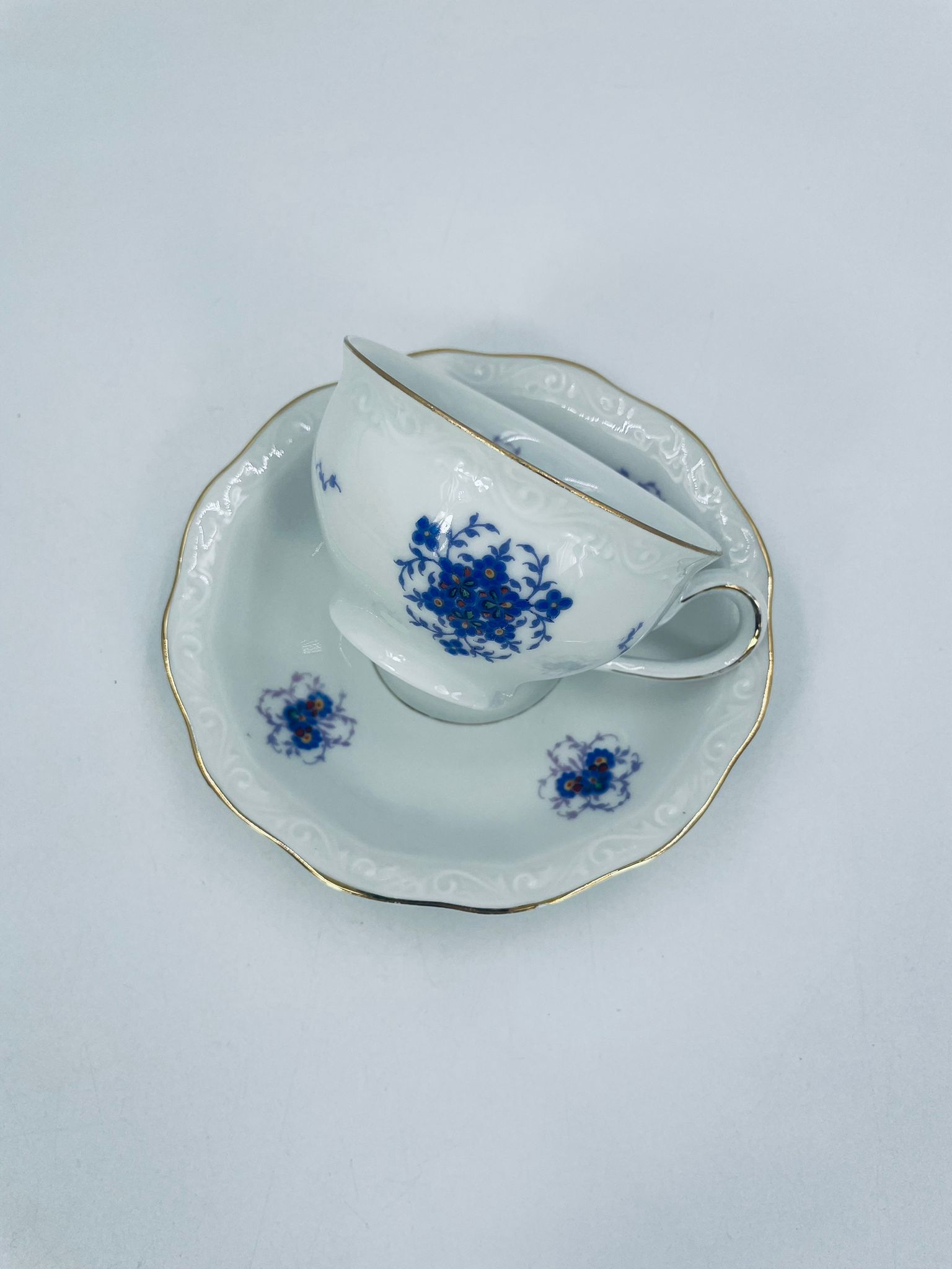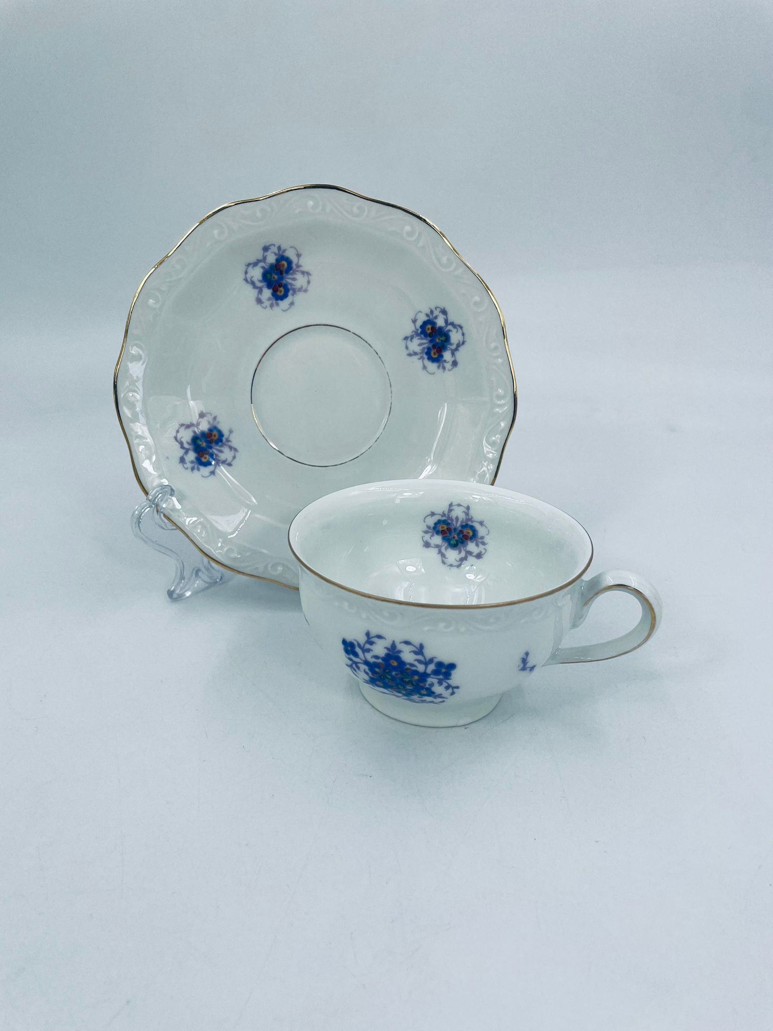 A cup in duo set by the well-known KPM Rubens manufactory produced between 1930 and 1944, set in white porcelain with a delicate floral motif with colourful flowers in the Art Deco style. Both cup and saucer have subtle embossing and gilding on the rims, adding to the charm and elegance.