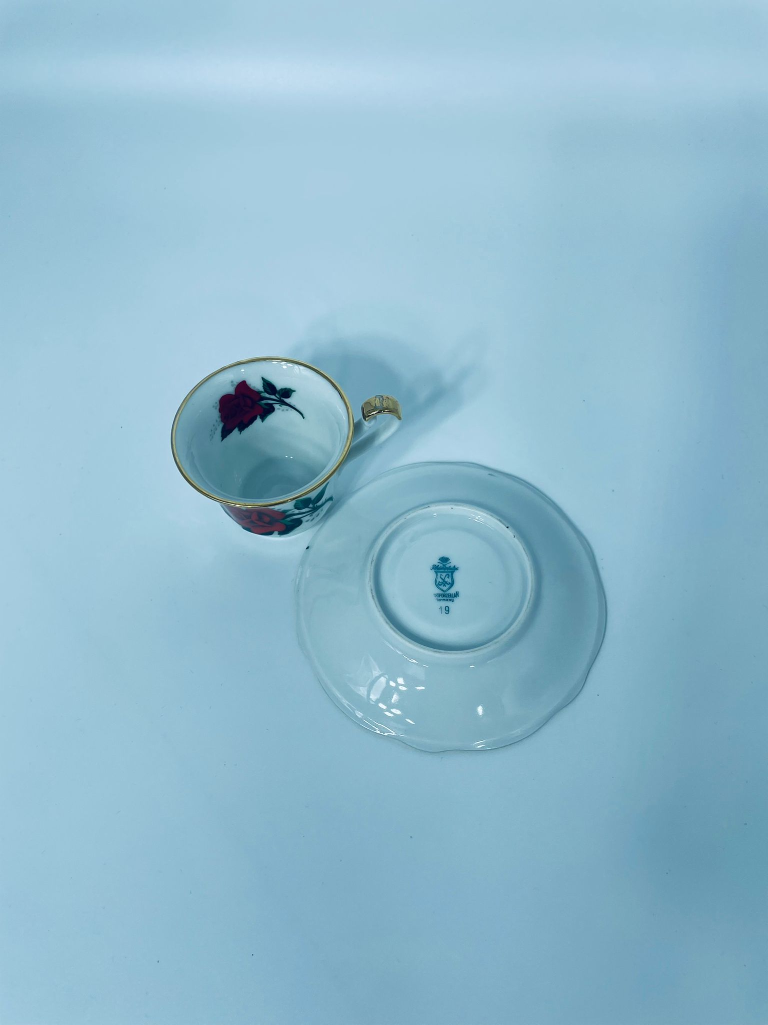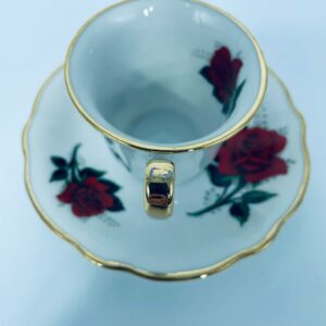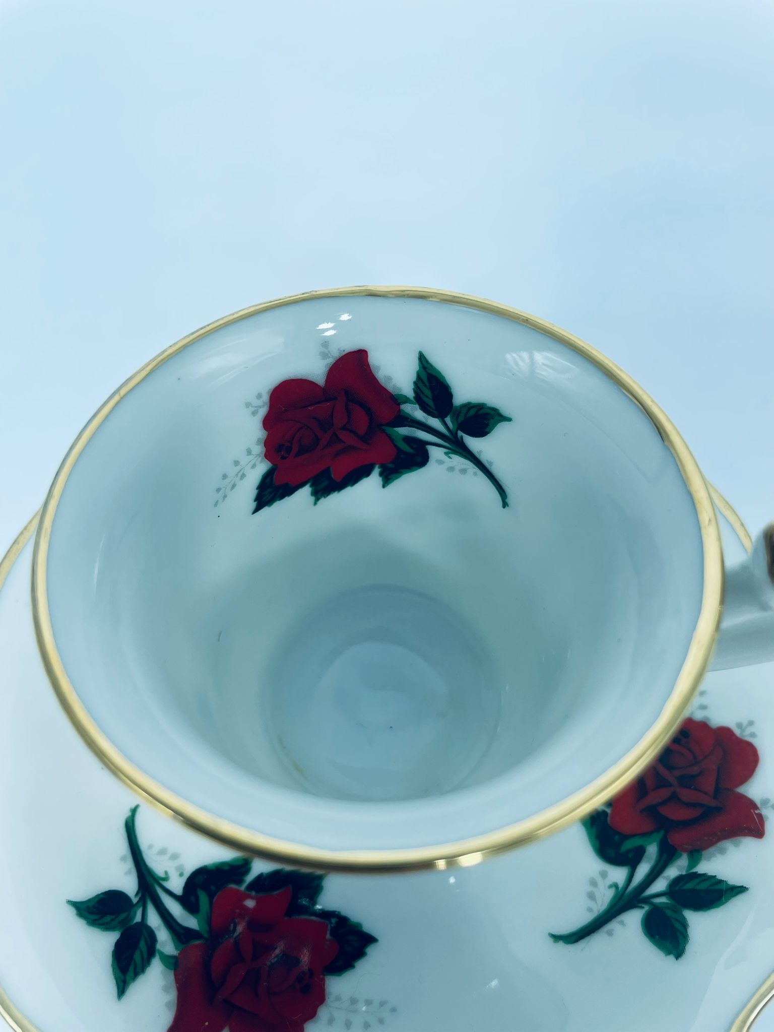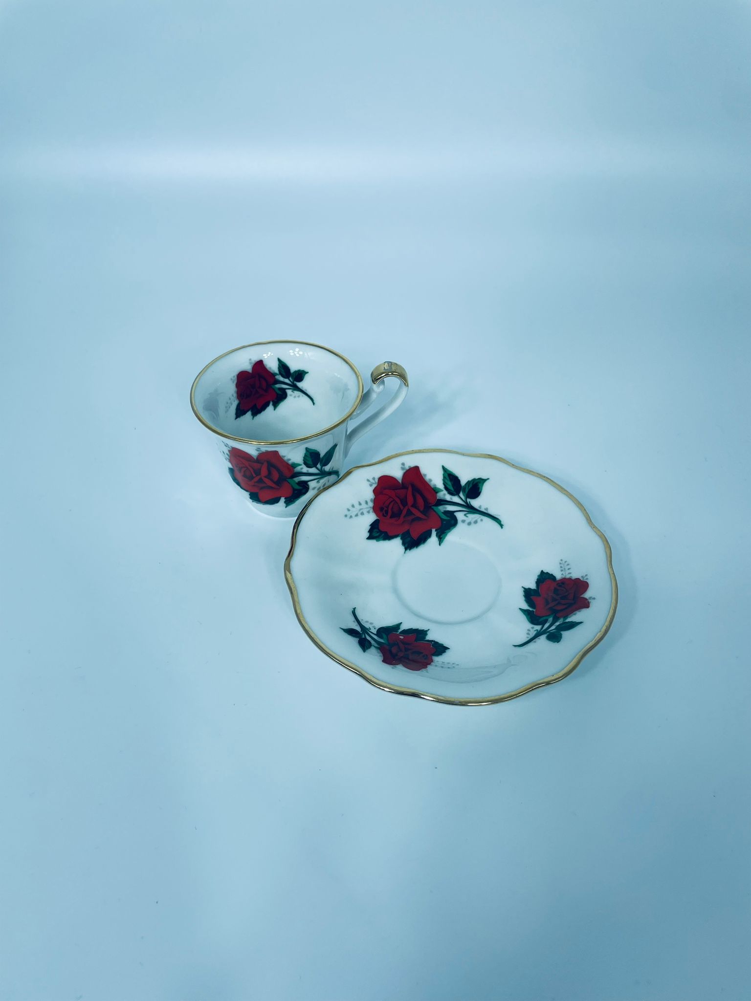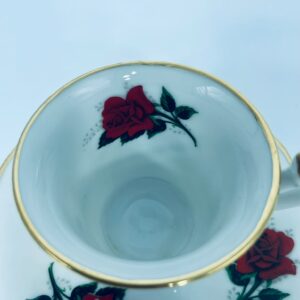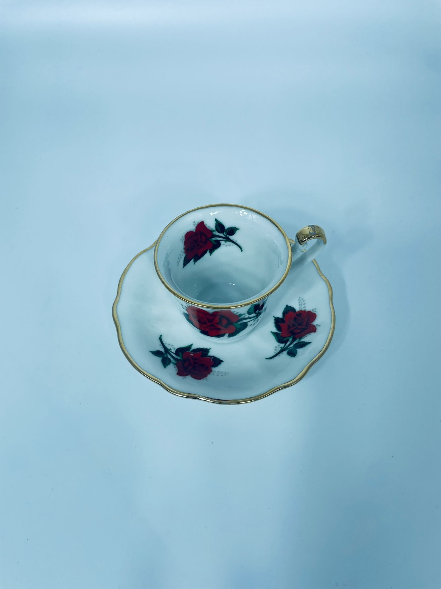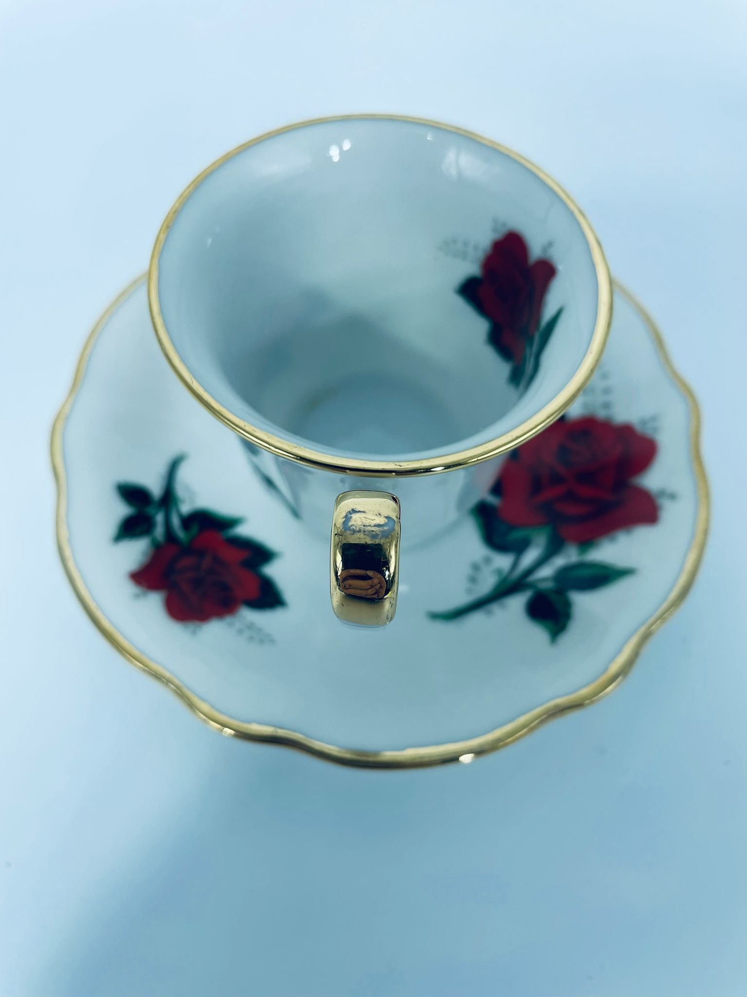 A collector's cup in a duo set from Rheinpfalz Hartporzellan Germany, marked between 1951 and 1972, made of high-quality white porcelain. The set is decorated with beautiful red roses with green stems and leaves, finished with gilding on the edges. There is some wear on the gilding.