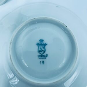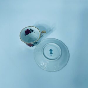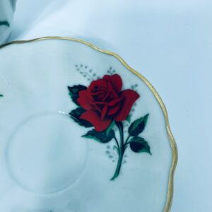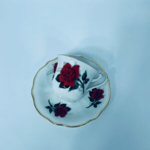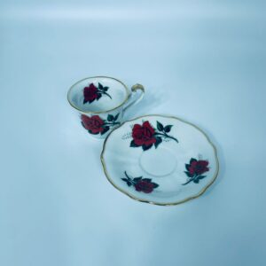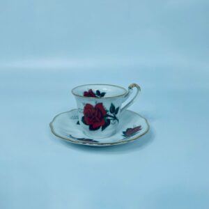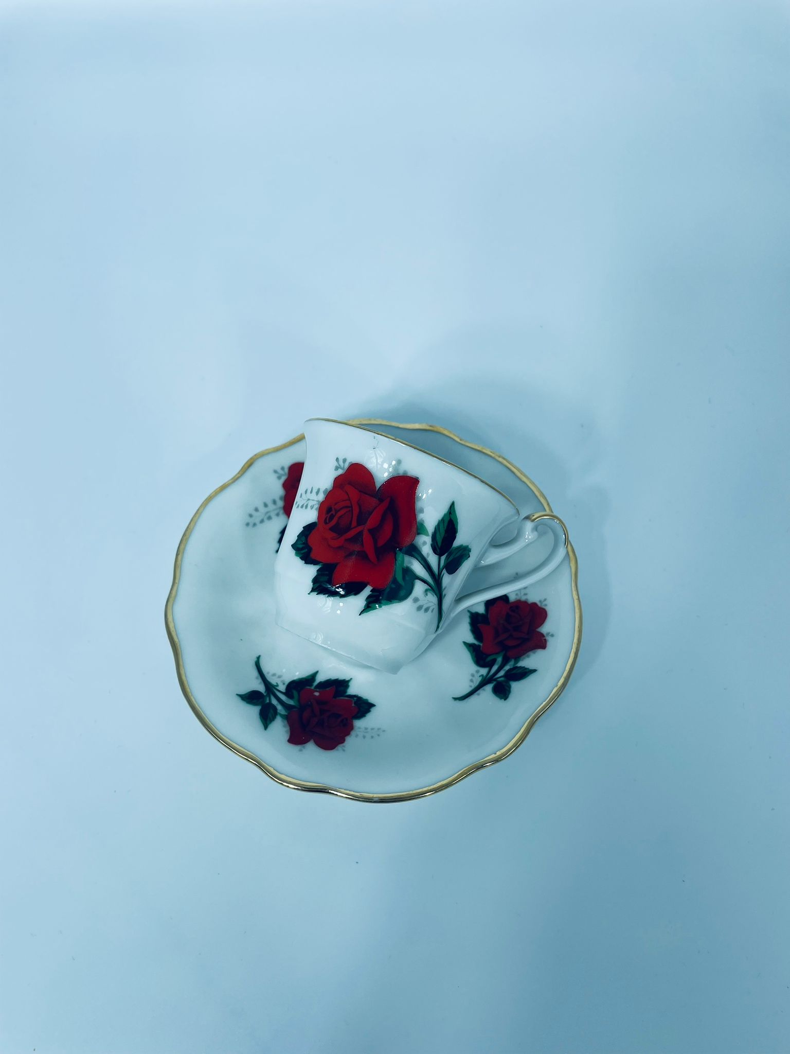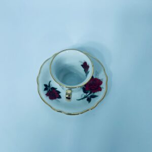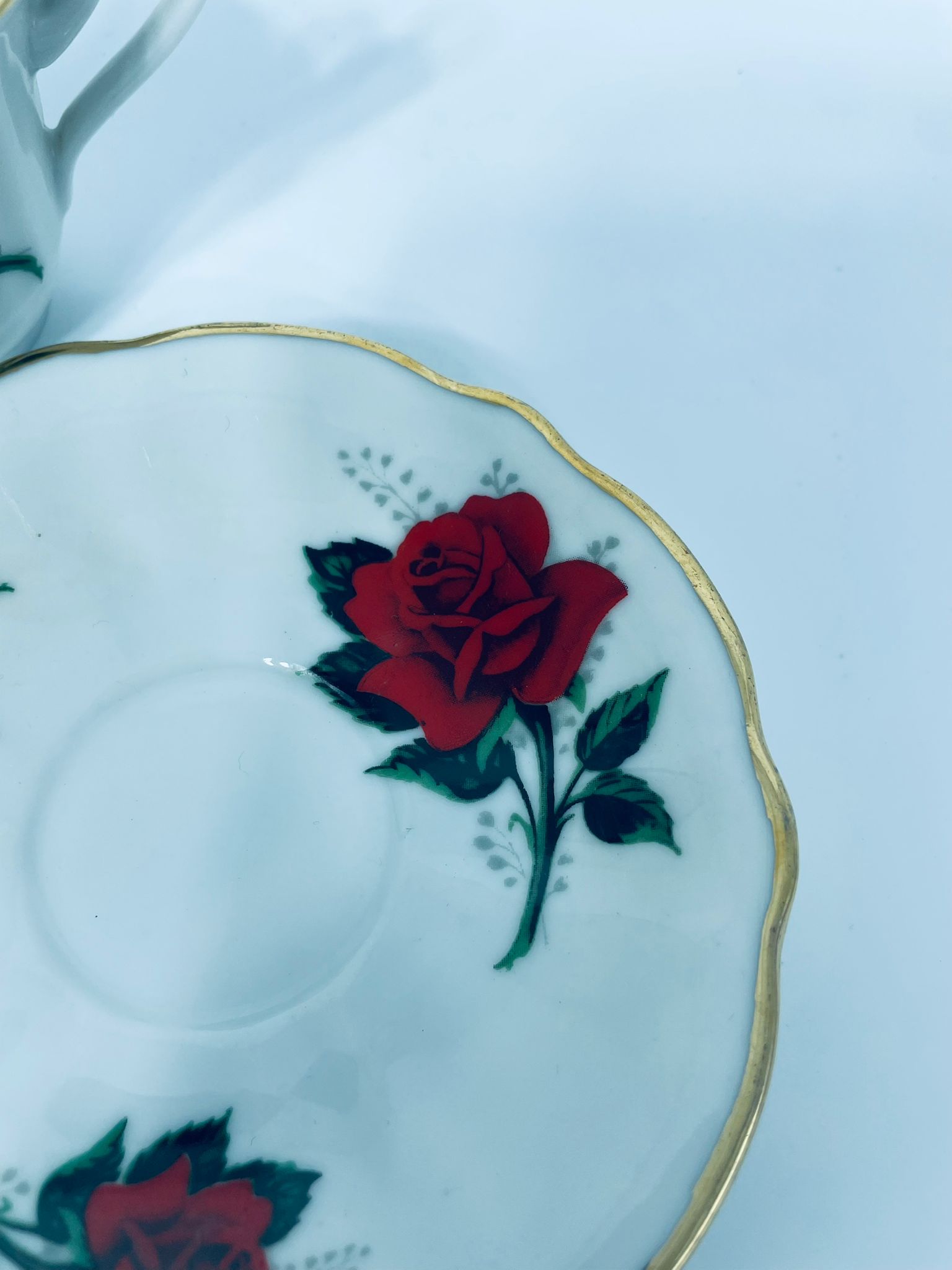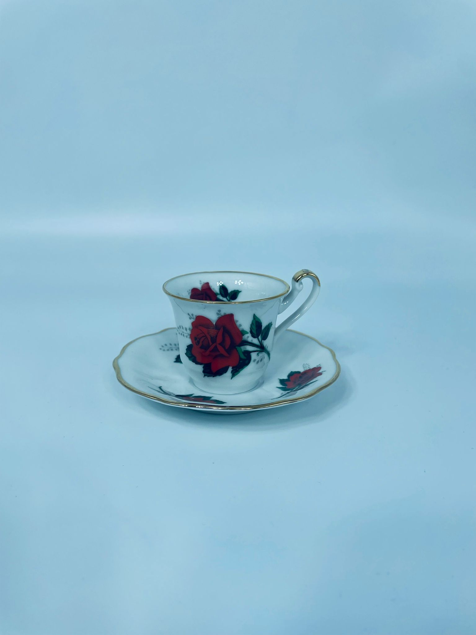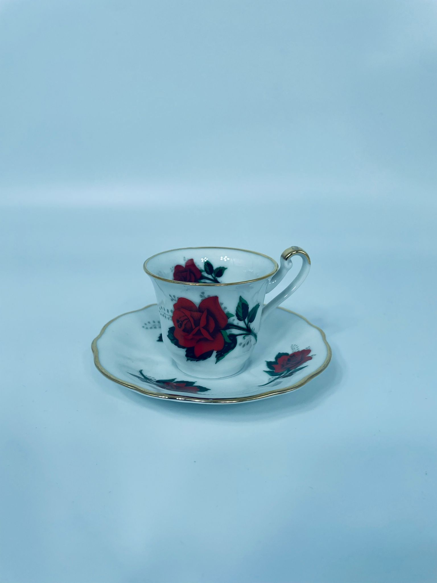 A collector's cup in a duo set from Rheinpfalz Hartporzellan Germany, marked between 1951 and 1972, made of high-quality white porcelain. The set is decorated with beautiful red roses with green stems and leaves, finished with gilding on the edges. There is some wear on the gilding.
