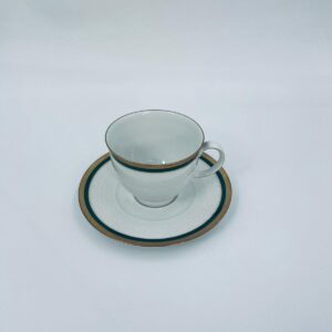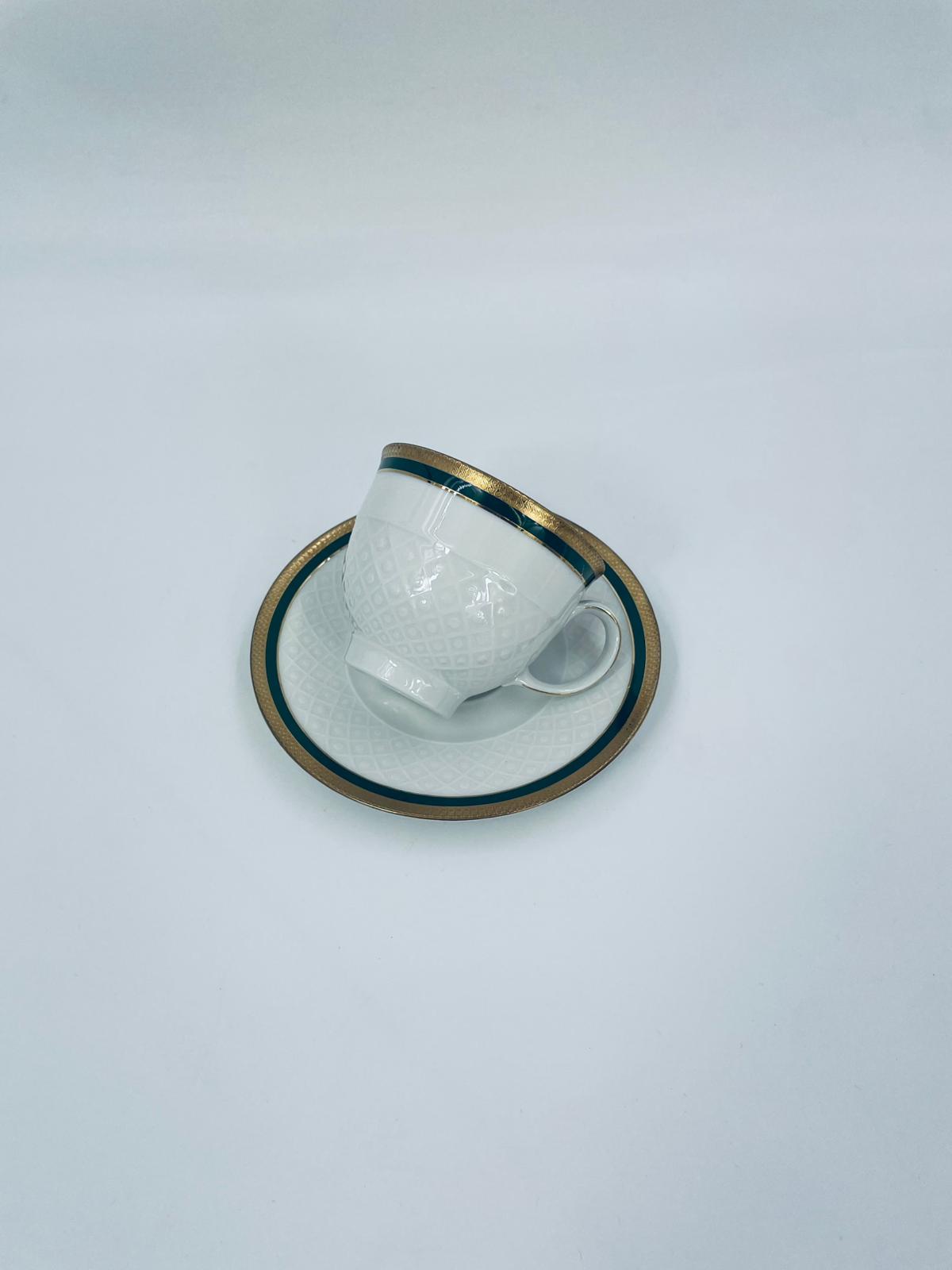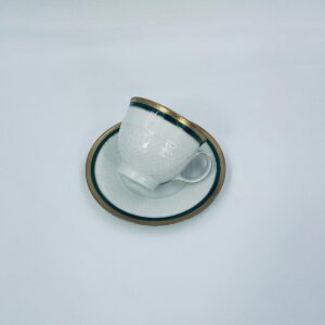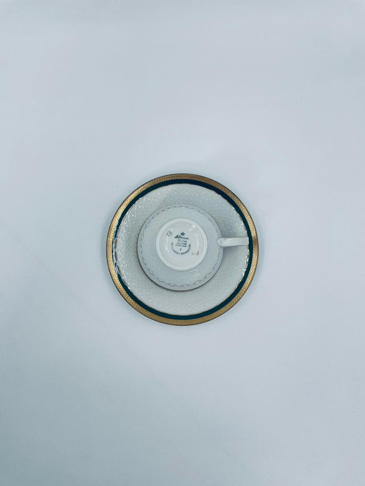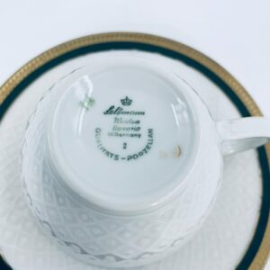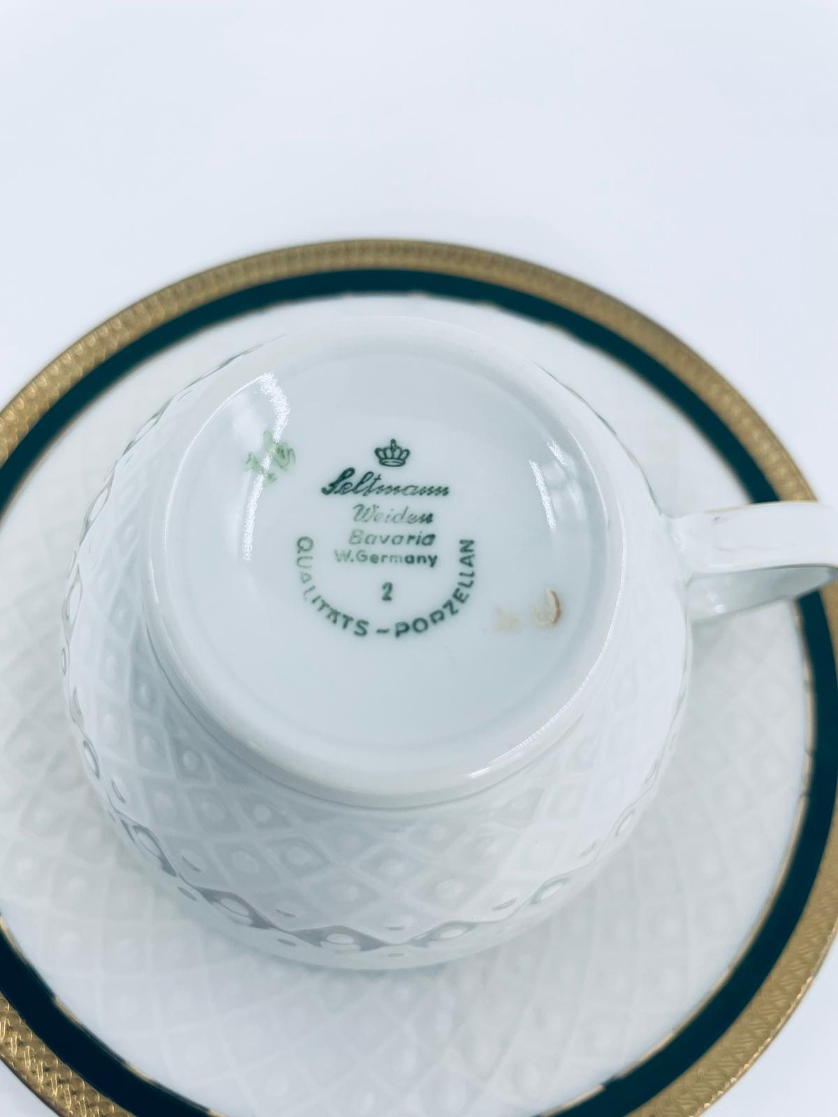 A collector's cup in duo set, by the Seltmann Weiden Annabell label, made of high-quality fine white porcelain between 1954 and 1990. The set is characterised by an embossed delicate pattern and gold and emerald colour, finished with a pattern on the gilding at the top rim.