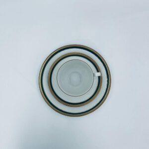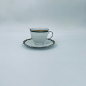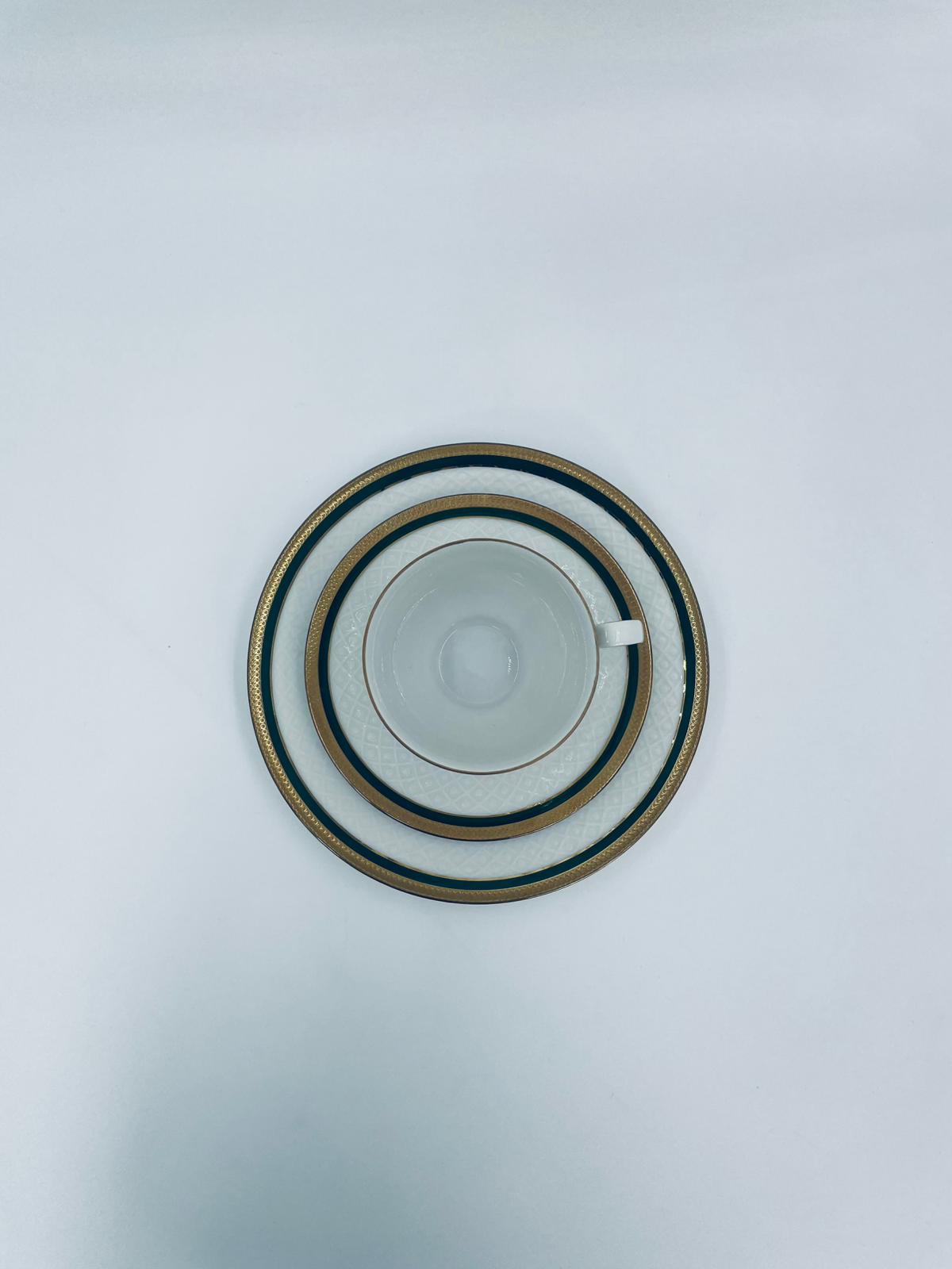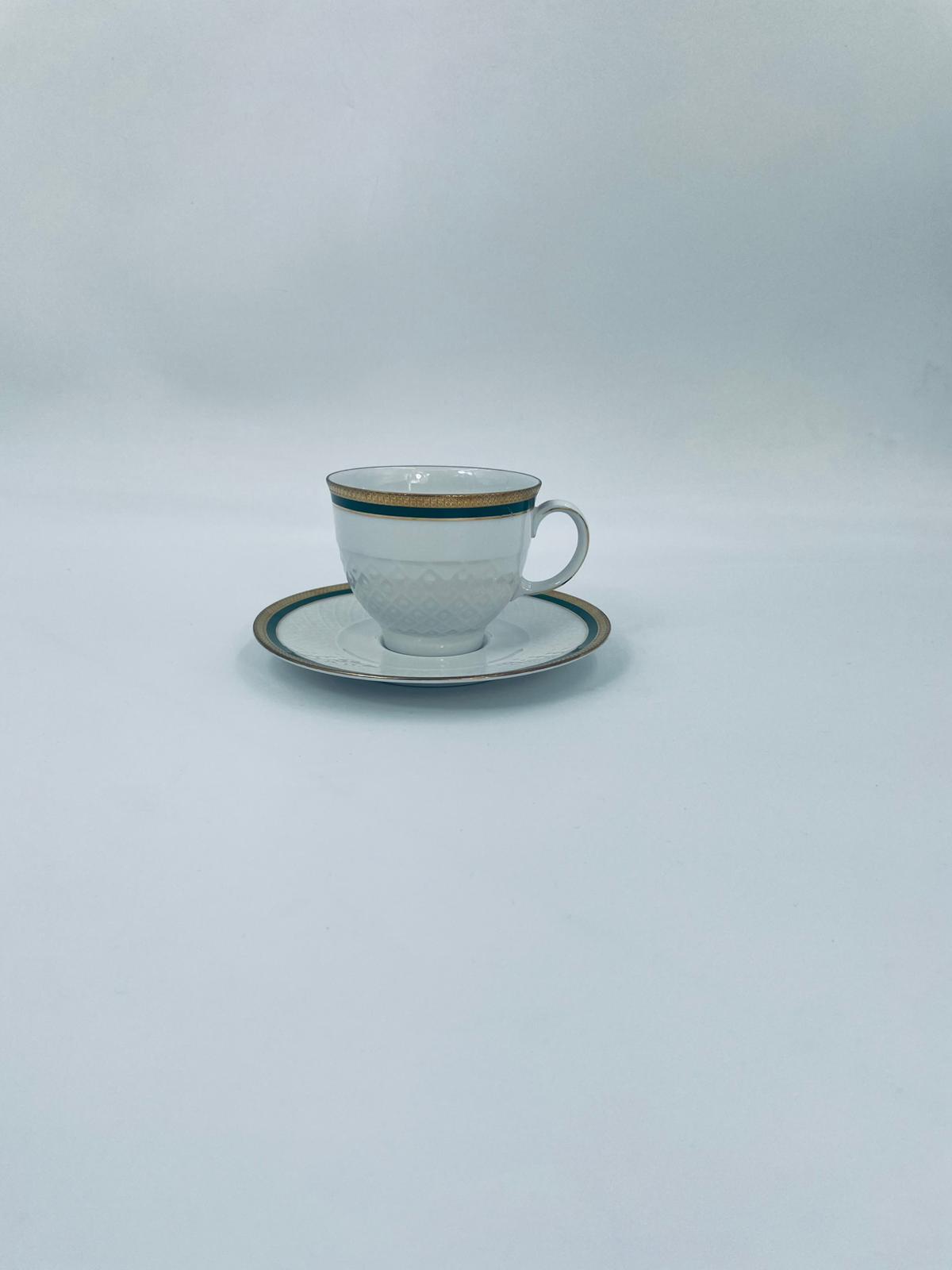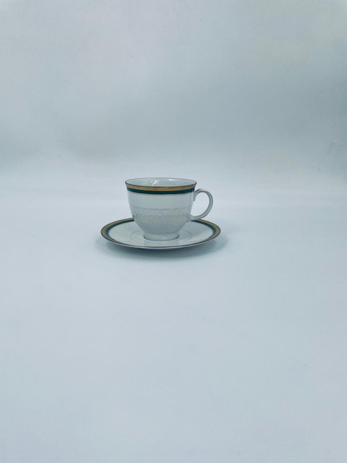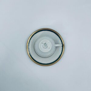 A collector's cup in duo set, by the Seltmann Weiden Annabell label, made of high-quality fine white porcelain between 1954 and 1990. The set is characterised by an embossed delicate pattern and gold and emerald colour, finished with a pattern on the gilding at the top rim.